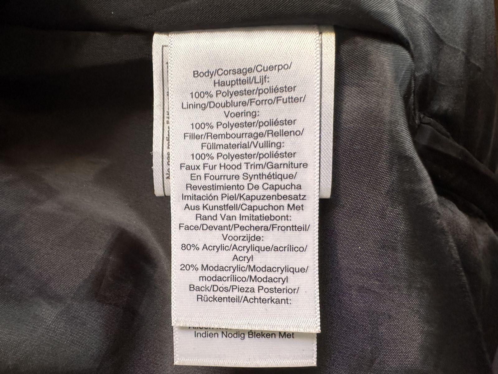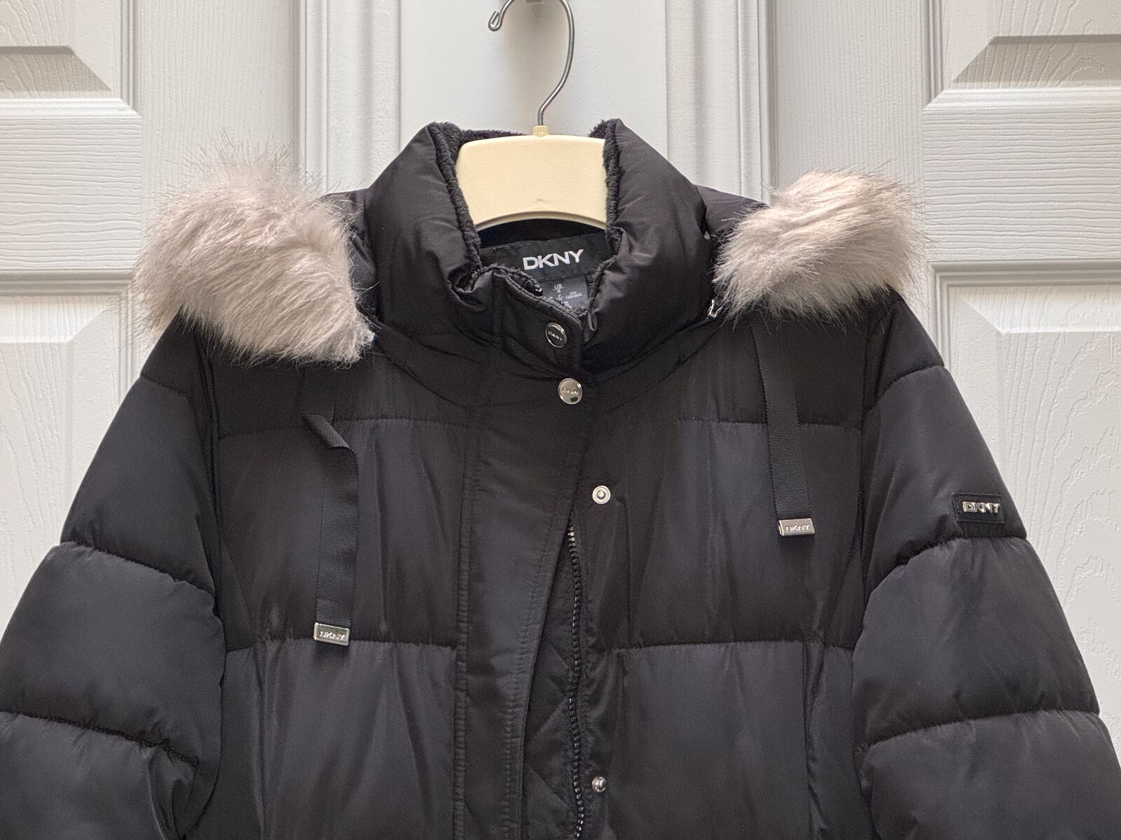 ApplePayFaux Fur Trim Hooded Bibbed Puffer Coat. Like new. Features a removable hood, adjustable belt, snap or zipper front, 48” length with zip sides, polyester fill, and polyester shell.