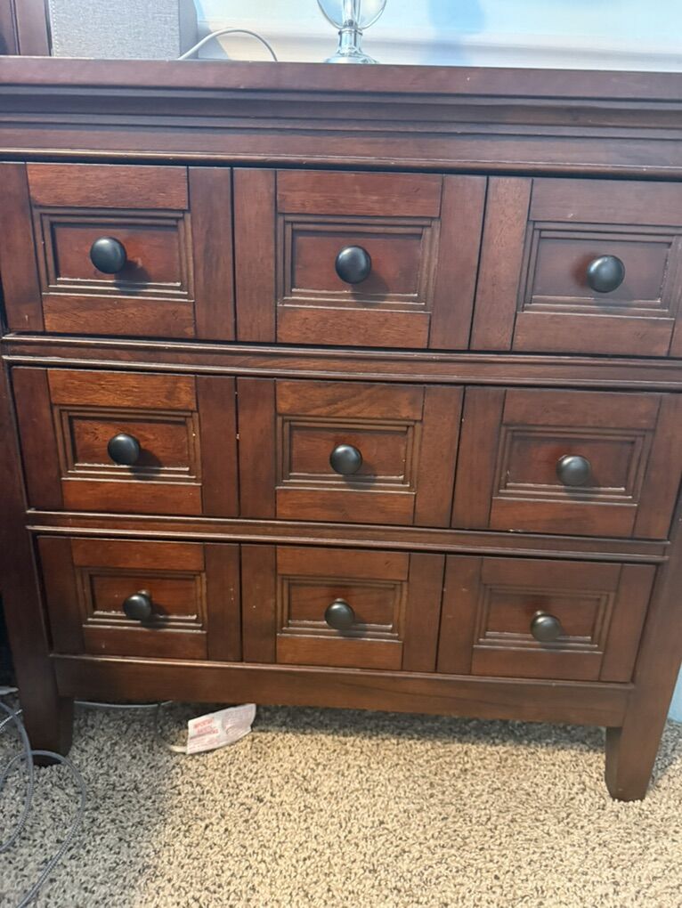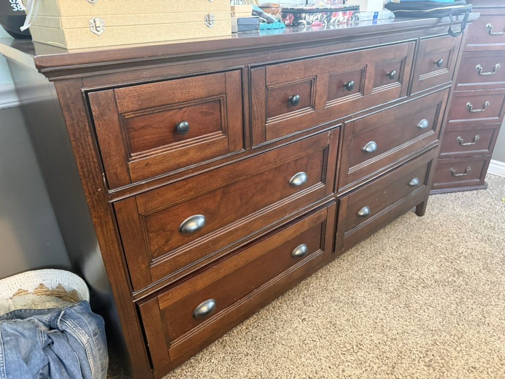 Queen frame with 2 drawers on each side 2 End Tables with outlets 1 Dresser with 7 drawers 1 mirror