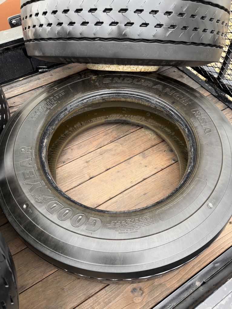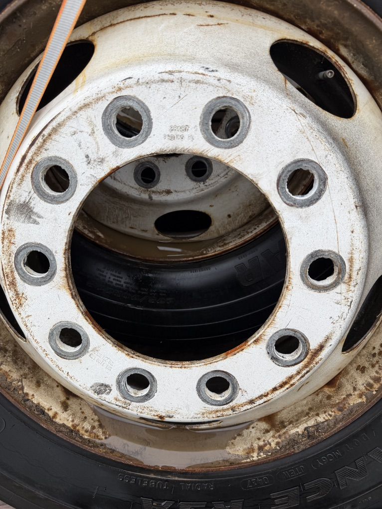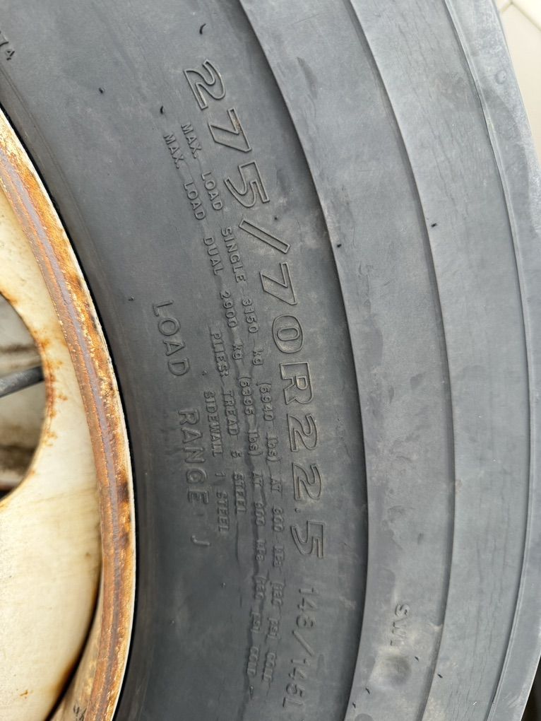 22.5 wheels with 275/70/22.5 Goodyear tires. Low mileage tires. Lots of tread. 4 wheels and 5 tires.