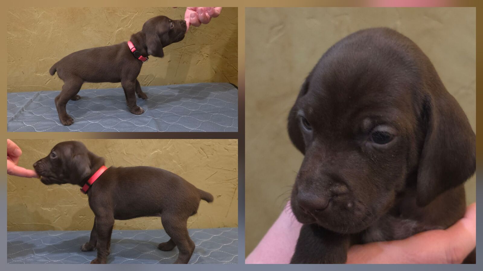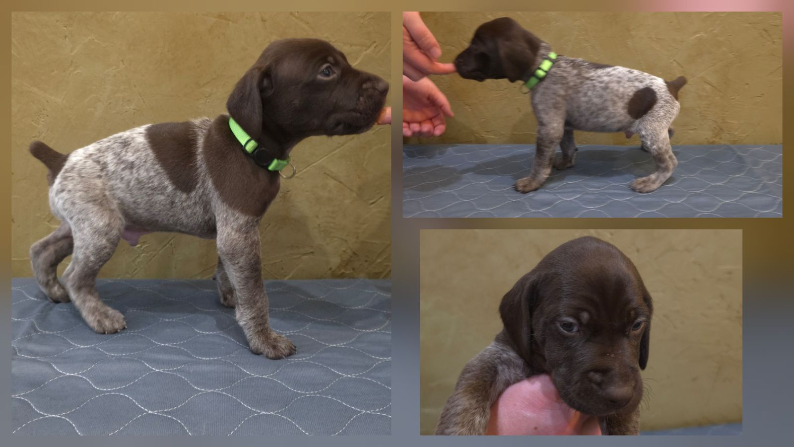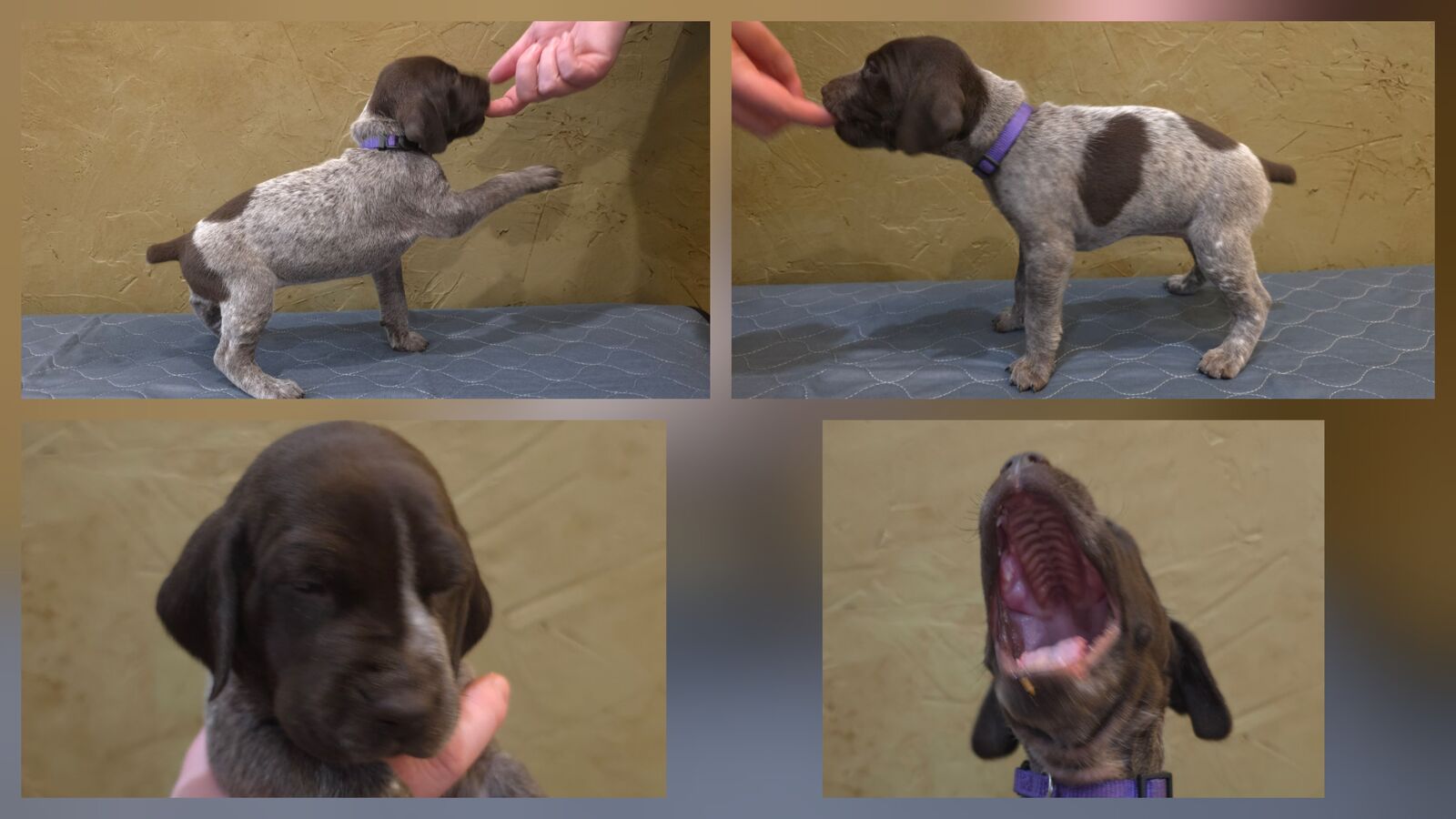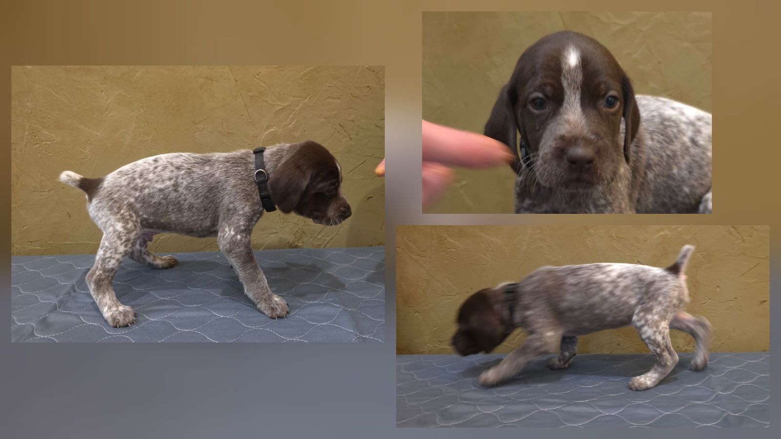 Feb 22nd. Puppies are LOVING the Gruel mash. The first few times they of course made a huge mess more than they actually ate. However they are now polishing off the plate. Well done little ones. The potty training is going pretty well. Most of them have started to understand, and we have caught them going over to the tray with pellets to relieve themselves. (It makes keeping their box clean so much easier!) This should make final house training a breeze. We also have started letting them out one at a time to explore without their siblings. Some are already adventurous and explore around the kitchen. Others are little clingers and just want to follow you or mom around. Also this week we have begun sound socialization. A variety of different sound recordings (rainstorm, city, traffic, Grandfather Clock, Birds, etc.) and they are doing great! None of them have shown any fear. We will keep introducing more sounds as their growth progresses. Tags: GSP, Short Hair, Puppy, Puppies, Hunting, Dog, Upland, Bird, Birds, Pheasant, Chucker.