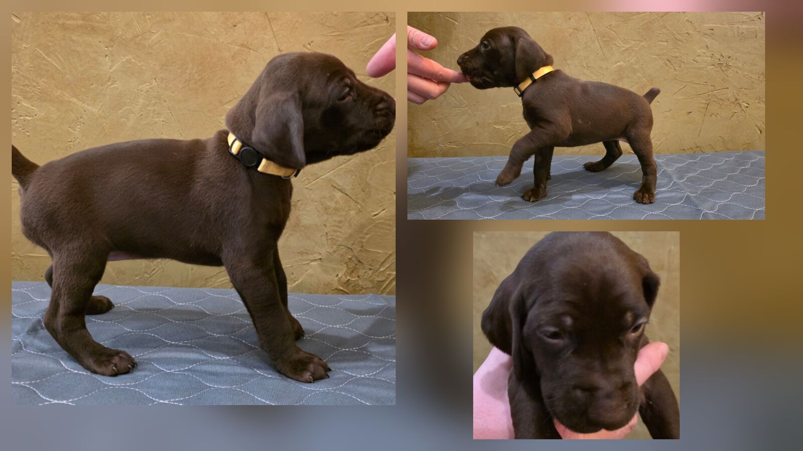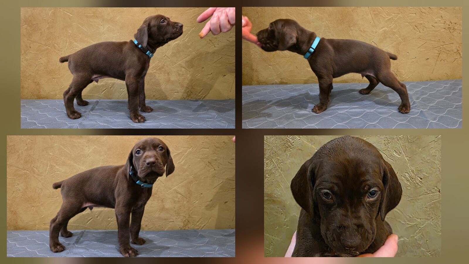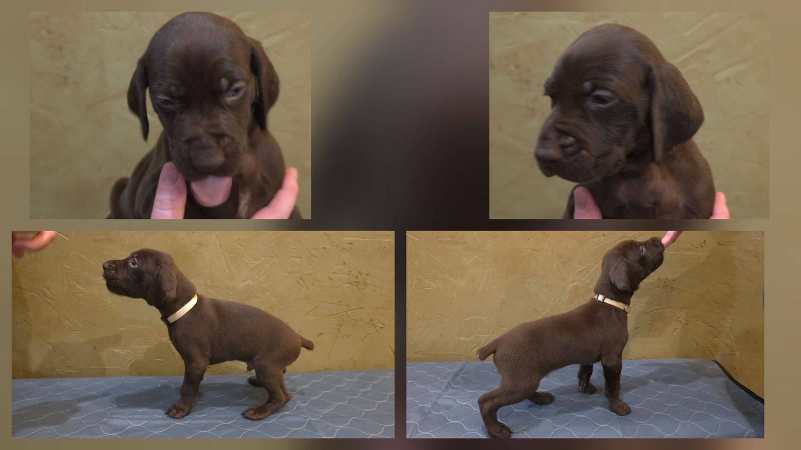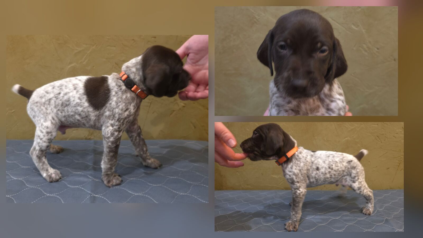 Feb 22nd. Puppies are LOVING the Gruel mash. The first few times they of course made a huge mess more than they actually ate. However they are now polishing off the plate. Well done little ones. The potty training is going pretty well. Most of them have started to understand, and we have caught them going over to the tray with pellets to relieve themselves. (It makes keeping their box clean so much easier!) This should make final house training a breeze. We also have started letting them out one at a time to explore without their siblings. Some are already adventurous and explore around the kitchen. Others are little clingers and just want to follow you or mom around. Also this week we have begun sound socialization. A variety of different sound recordings (rainstorm, city, traffic, Grandfather Clock, Birds, etc.) and they are doing great! None of them have shown any fear. We will keep introducing more sounds as their growth progresses. Tags: GSP, Short Hair, Puppy, Puppies, Hunting, Dog, Upland, Bird, Birds, Pheasant, Chucker.