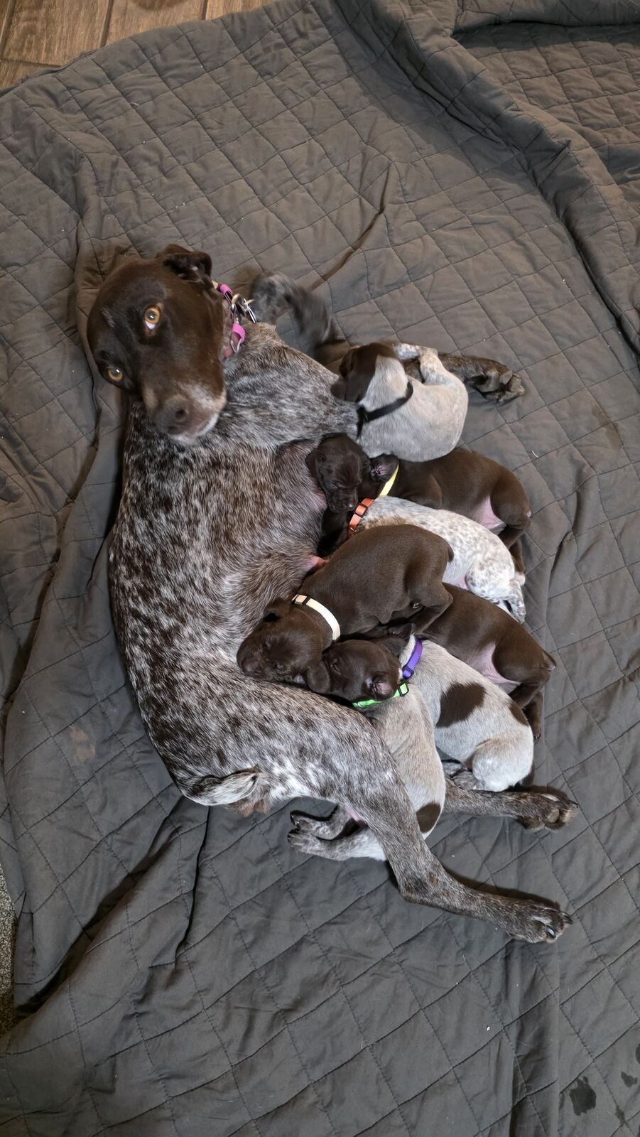 VenmoAKC Registered German Shorthaired puppies. Great family dogs and ready to be hunting fools. Both parents are great hunting dogs and live in homes with children. Great temperament, patience and trainability. Mom (Benelli) has a great nose for the field and loves getting out on the hunt or even a hike. Dad (Mack) has some field trial wins and is a hunting maniac.