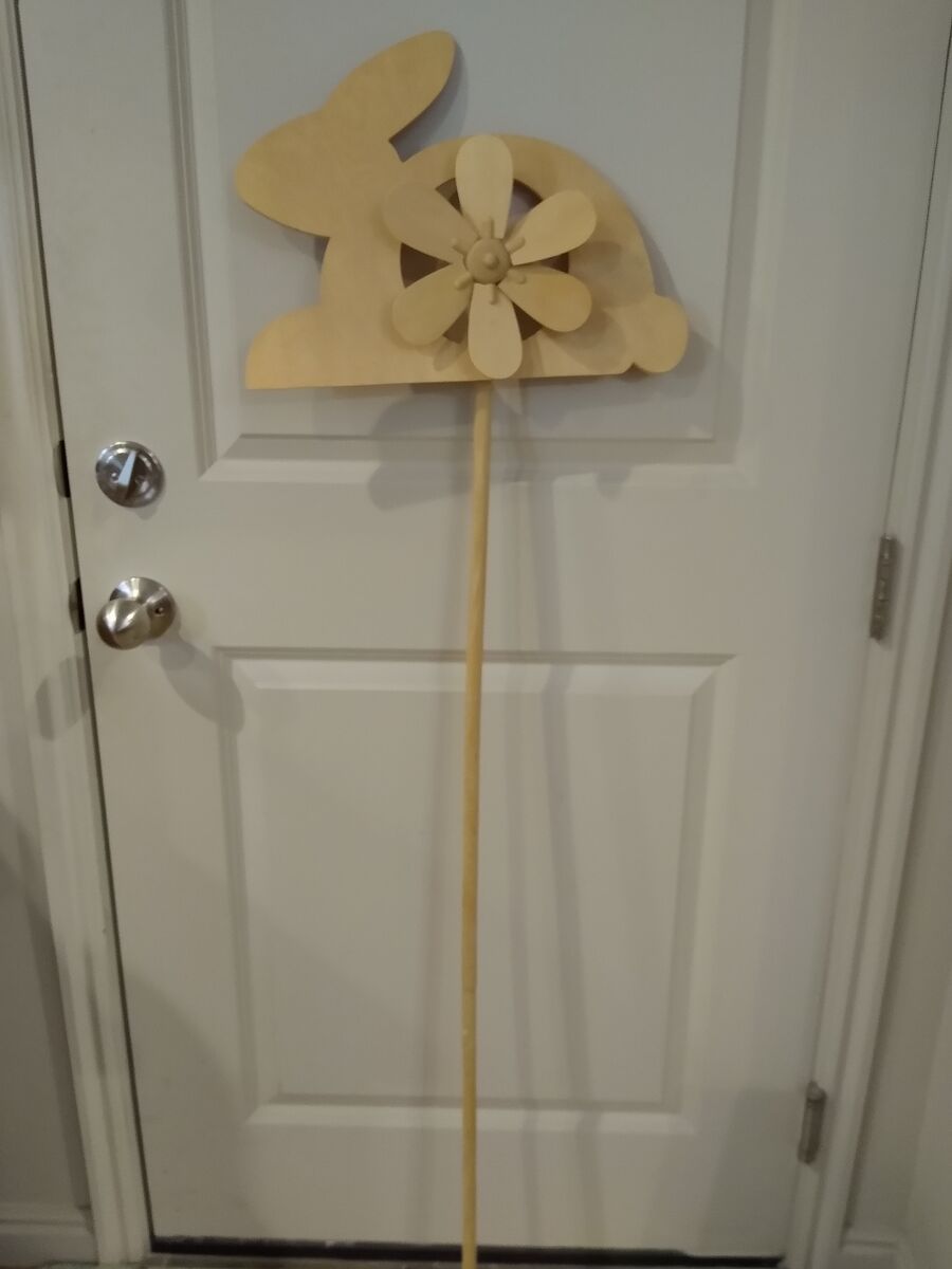 Unpainted wood bunny windmill/whirligig yard décor. Stands 55” tall. If a shorter height is desired the pole screws together in the middle. Cash only please.