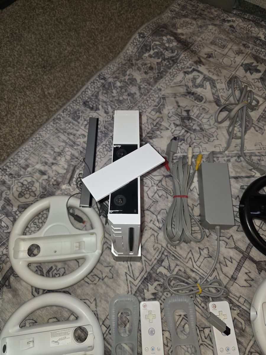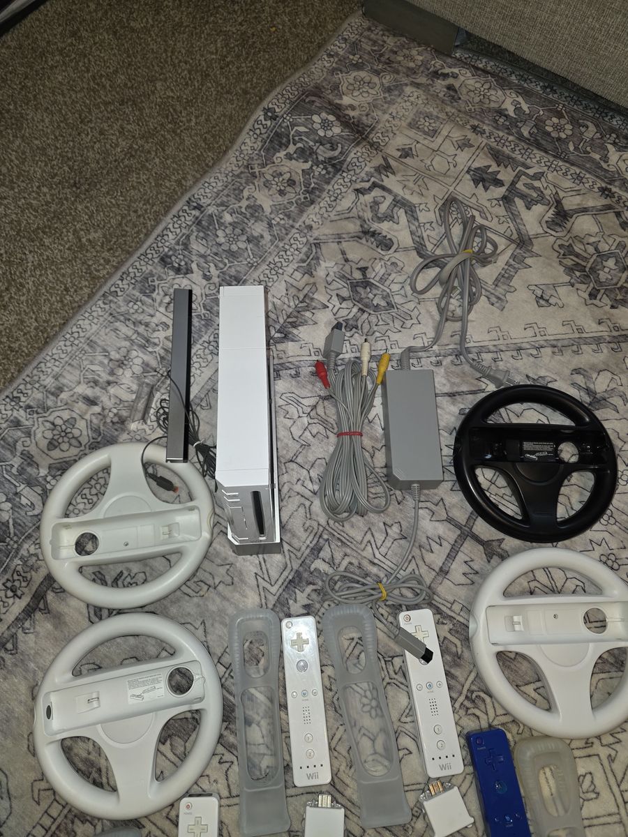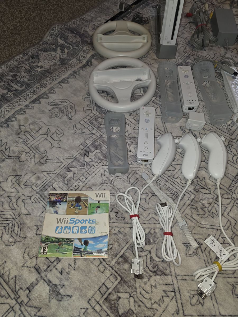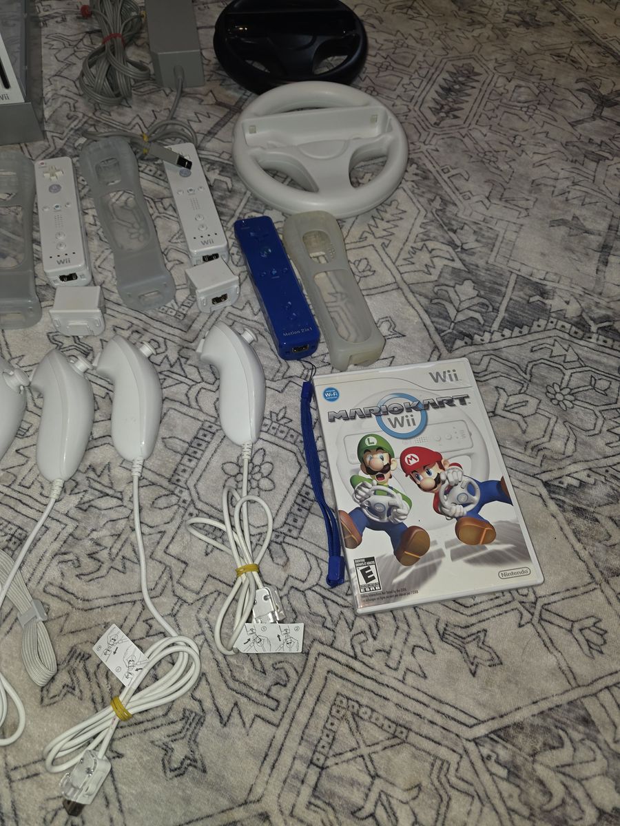 Wii console with stand, sensor bar, power and av cords, 4 controllers( 1 blue motion plus, 2 white with motion plus adapters,1 regular white, 4 nunchucks, 4 controller grip covers, 4 wheels for mario kart and 2 games: Mario kart and wii sports. This is fully ready for family fun with up to 4 players.
