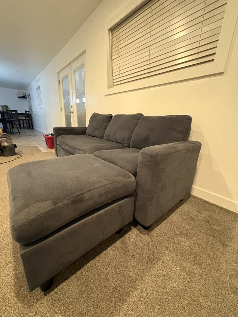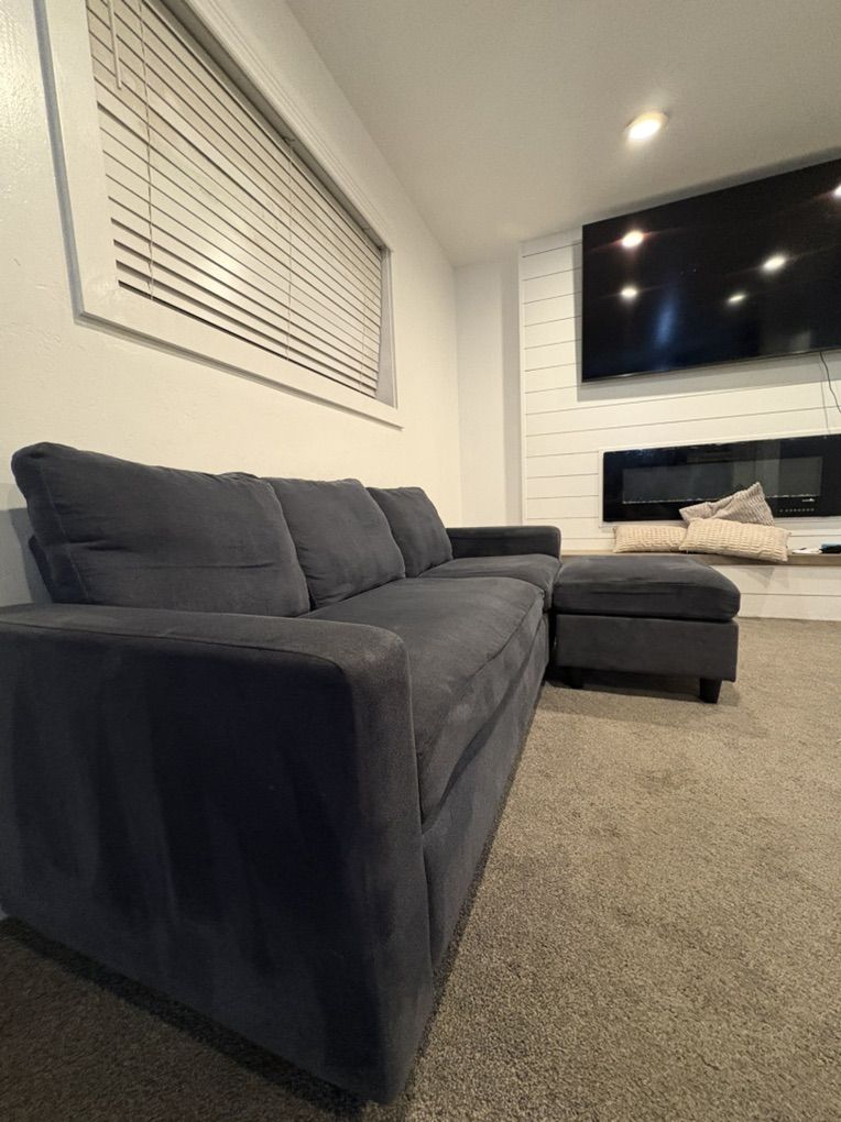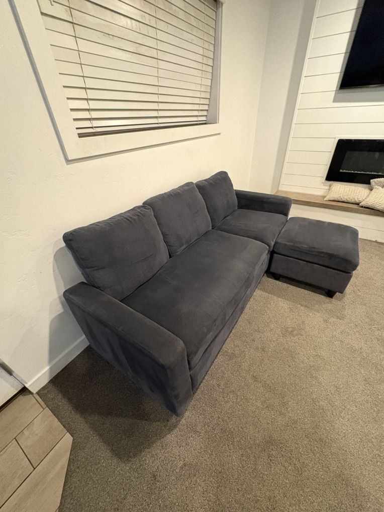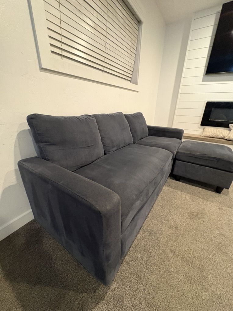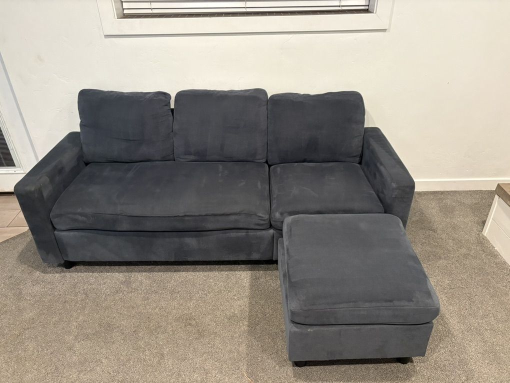 VenmoComfortable dark blue couch with matching ottoman for sale. Great size for a living room, apartment, or basement. The ottoman can be used as a footrest, extra seating, or even a chaise setup.