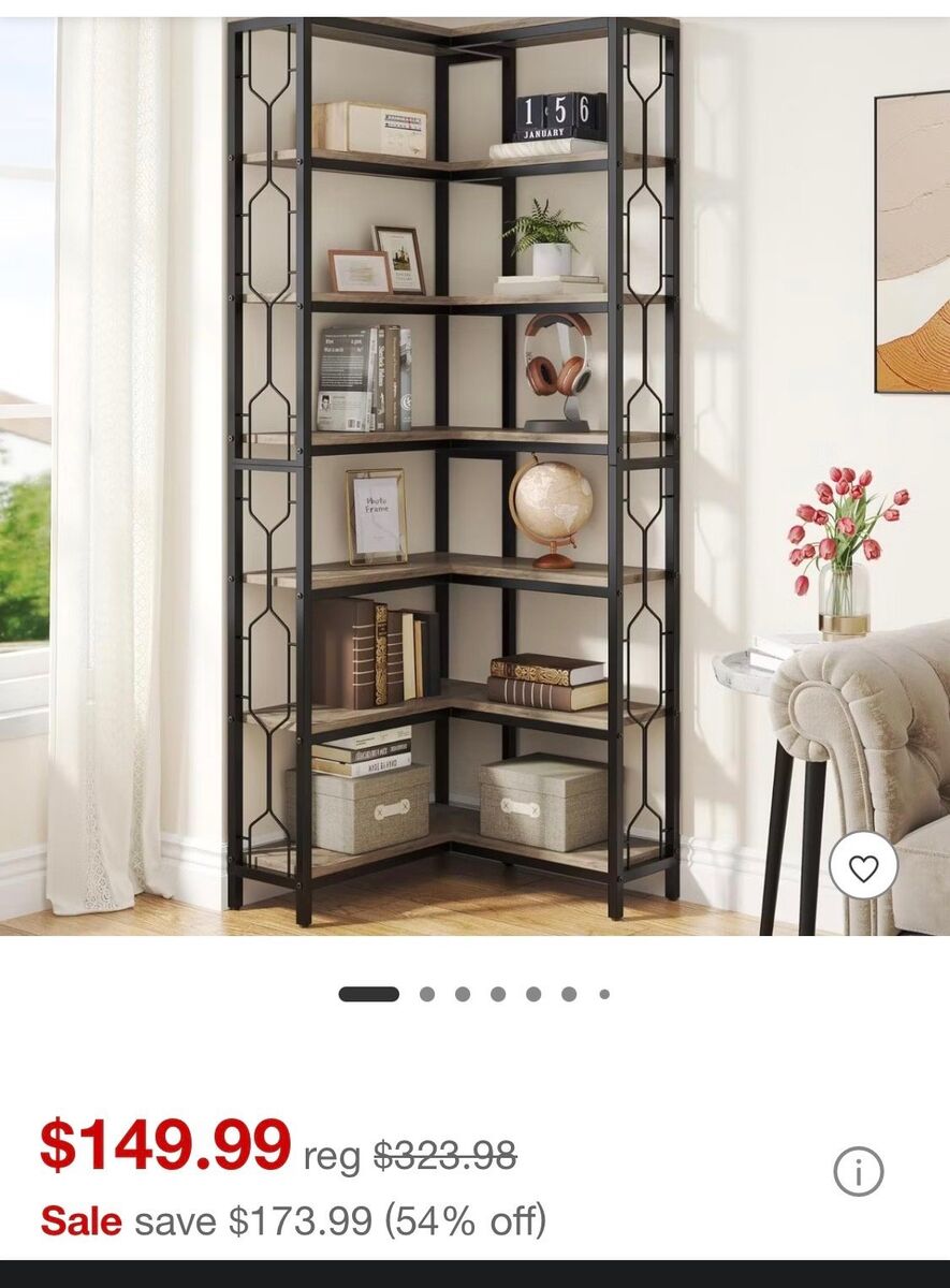 Beautiful 7-tier corner bookshelf with sturdy black metal frame and wood-look shelves — perfect for maximizing vertical space. This unit is already assembled, so you don’t have to deal with instructions or tools — just set it in your corner and enjoy.