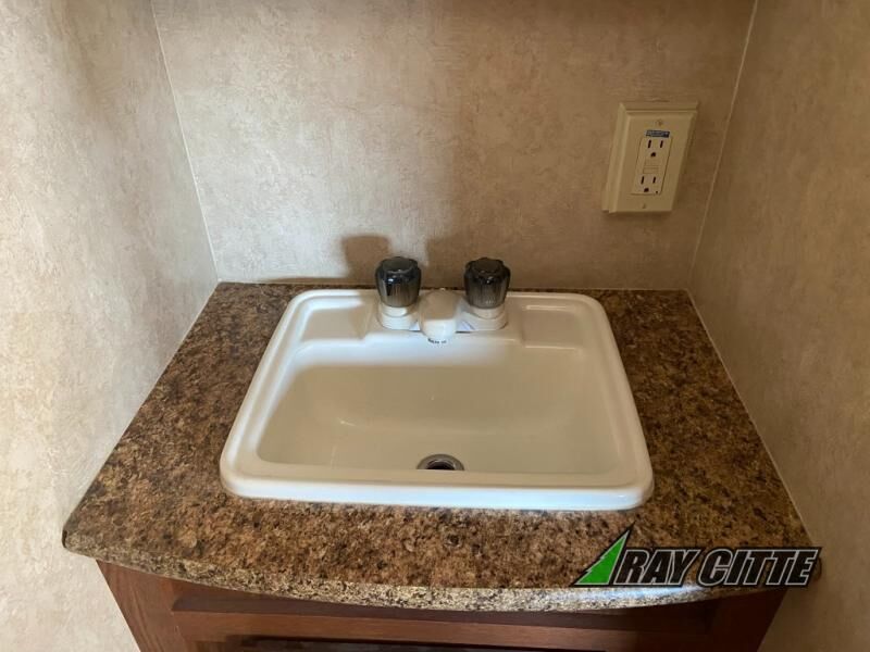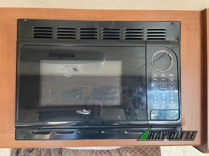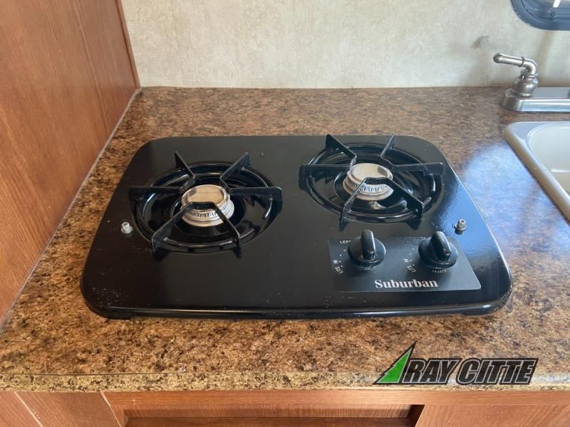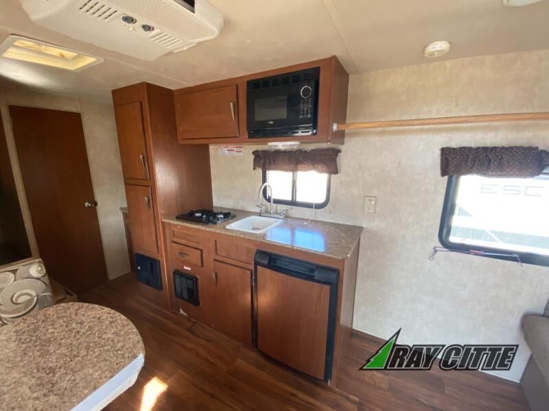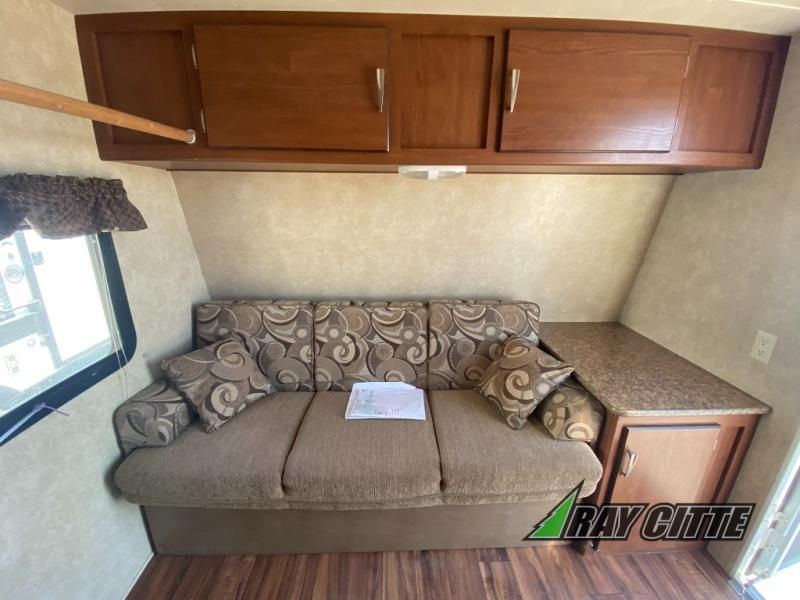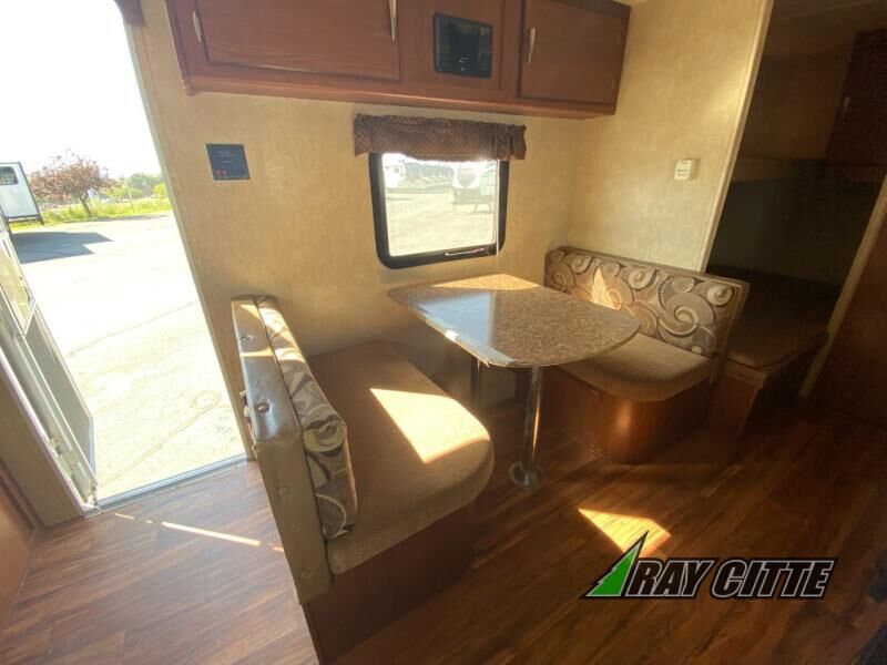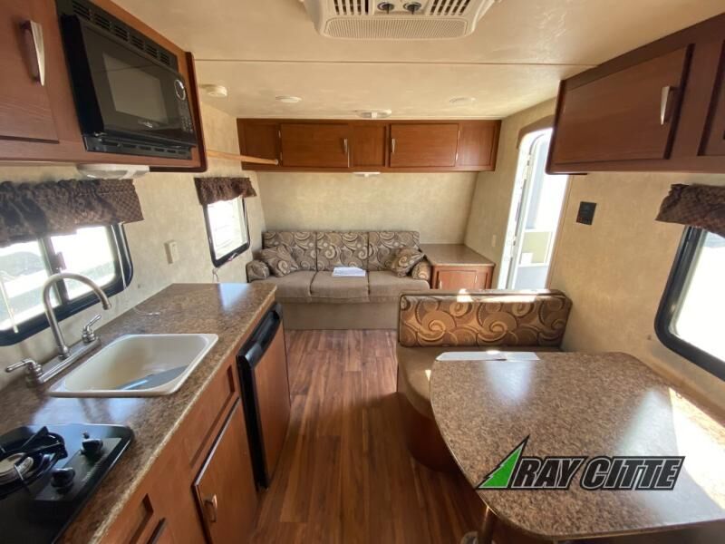 As you enter the travel trailer, there is a front sofa and an end table. One side of the trailer offers a dinette, and the other side has a refrigerator, microwave, sink, two burner range, and pantry.