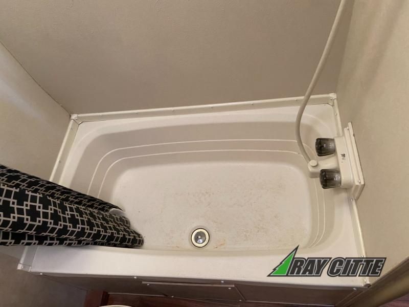 The bathroom is in the rear. You will find a shower, and toilet. Just outside of the bathroom there is a sink.