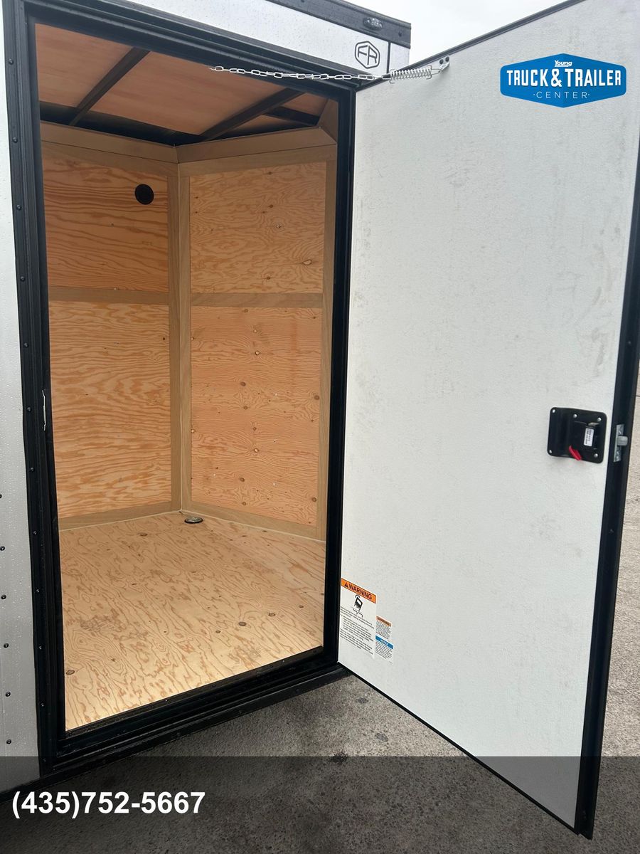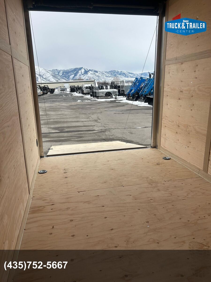 • 18” Wedge-Front Nose • C/S Door (24” on 5 wide, 32” on 6 & 7 wide, 36” on 8 wide) • Semi-Style Camlock Door Latch • Door Hold-Back on Rear Door • Leaf-Spring Axle • E-Z Lube Hubs • Silver Powder Coated Wheels • Radial Tires • Aluminum Top Rails • 16” ATP Stoneguard • (1) 12V LED Dome Light • (2) Flow Thru Sidewall Vents (on 5,6,7, & 8 wides) • Aluminum Exterior Fenders • Clear Lens LED Clearance Lights • Clear Lens LED Strip Tail Lights • DOT Lighting • License Plate Holder with Light • .030 Aluminum Exterior • Anodized Aluminum Wrap • Exposed Steel Painted Epoxy Black • Undercoated Frame • Tongue Jack with Sand Pad • Welded Safety Chains • Full-Color Decals • Flat Front w/ Anodized Corners IPO of 18” Wedge Available