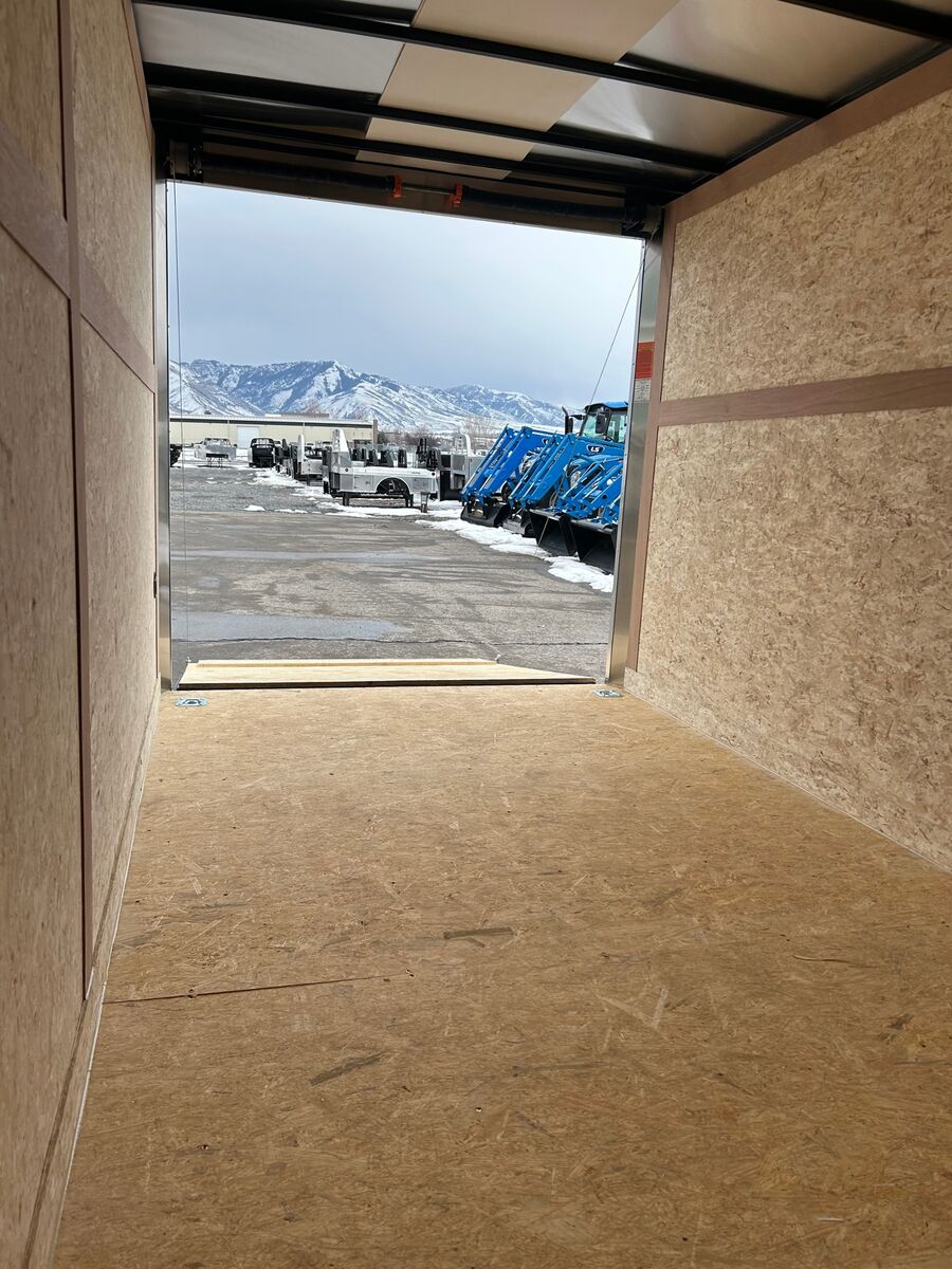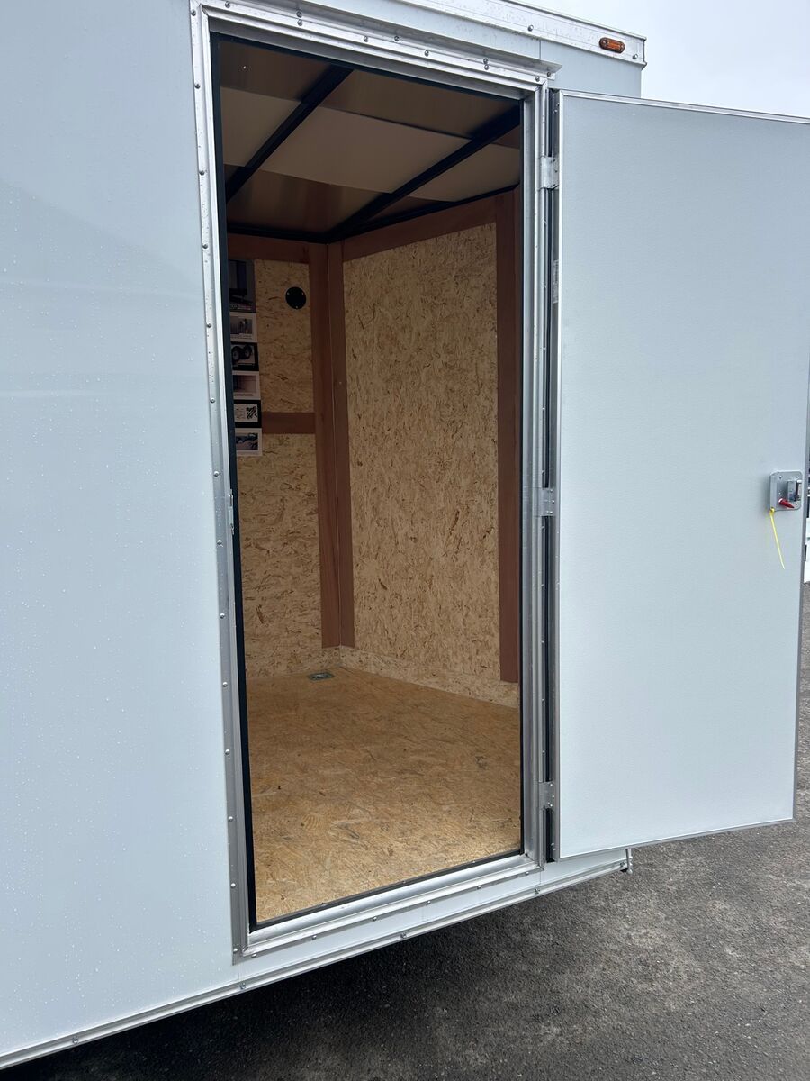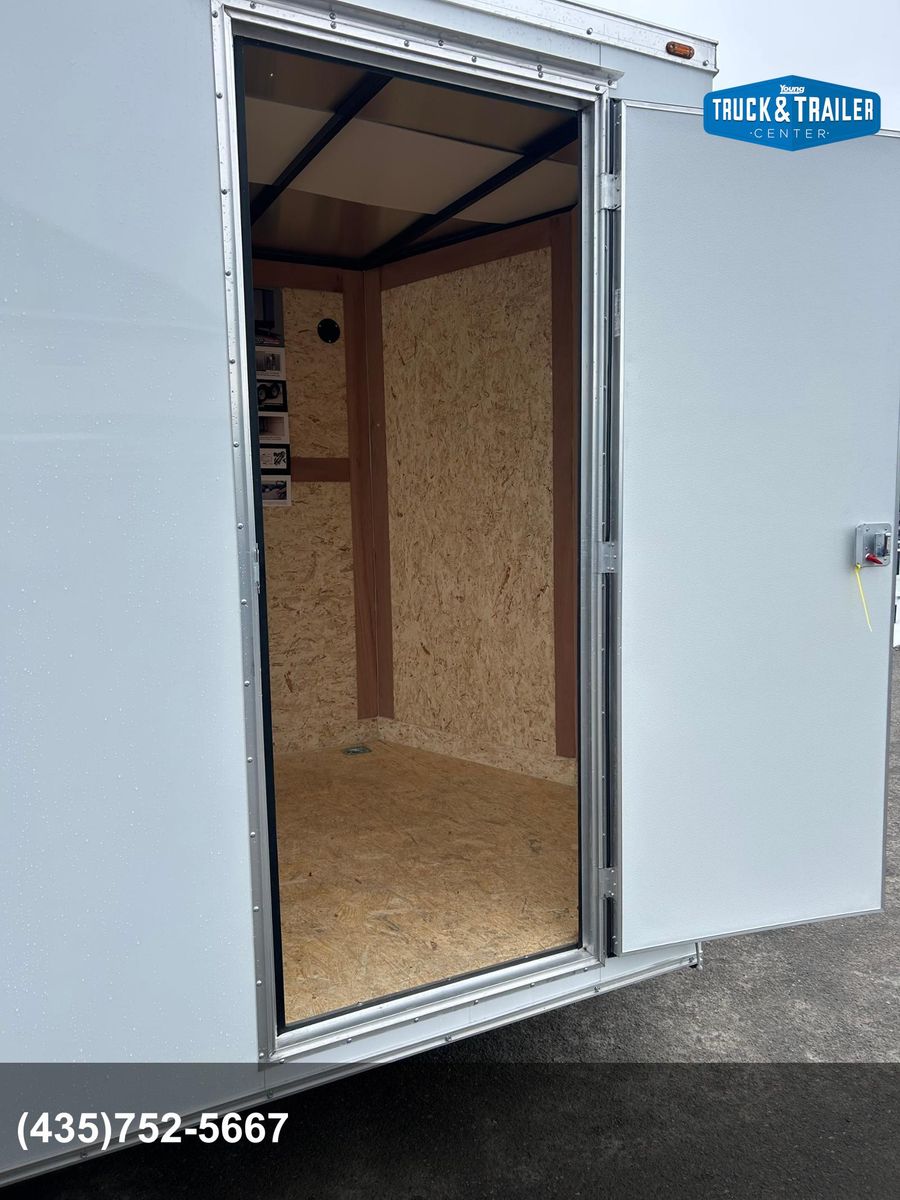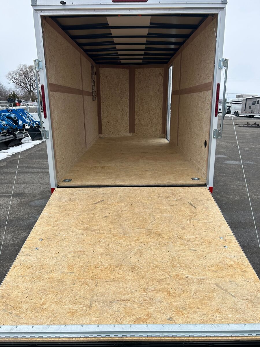 7' Tall Entire Chassis Undercoated White .024 Aluminum Exterior (With Screws) Safety Chains 3/4" PlexCore High Performance Decking Silver Mod Wheels E-Z Lube® Hubs Pass-Thru Side Door with Flush Lock & Dead Bolt Rear Ramp Door with Spring Assist Flow-Thru Sidewall Vents 12v LED Exterior Lighting 16" OC Floor Crossmembers 16" OC Vertical Posts 15" Radial Tires 16" Starbright Stoneguard Smooth Aluminum Radius Fenders 12v LED Dome Light Economy Sidewall Liner Spring Axles with 4" Drop 1-Year Limited Warranty 2" x 3" Tube Main Rails (Single Axle) 2" x 4" Tube Main Rails (Tandem Axle) 24" OC Tube Roof Structure