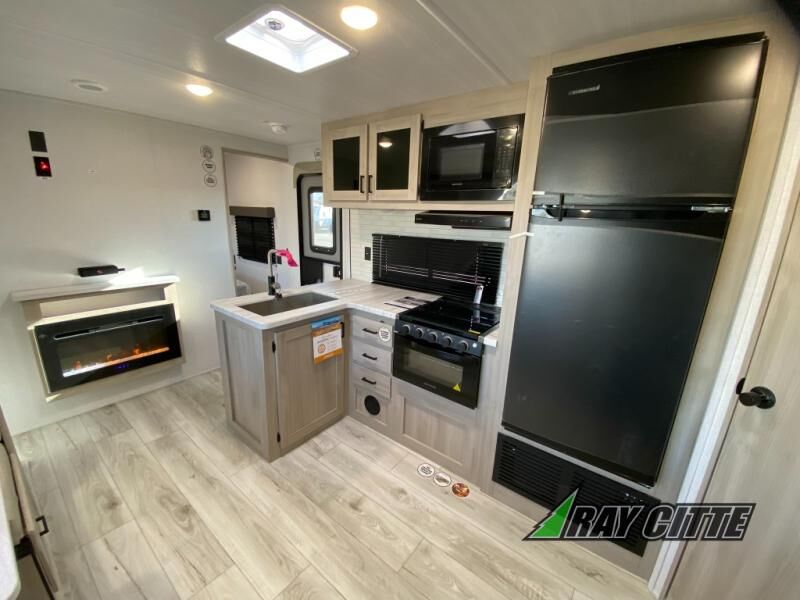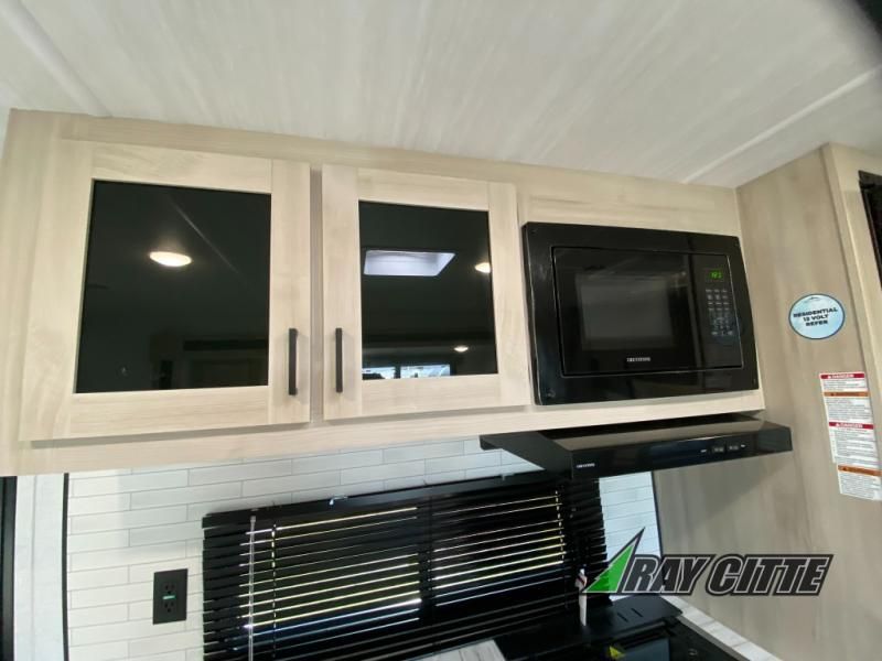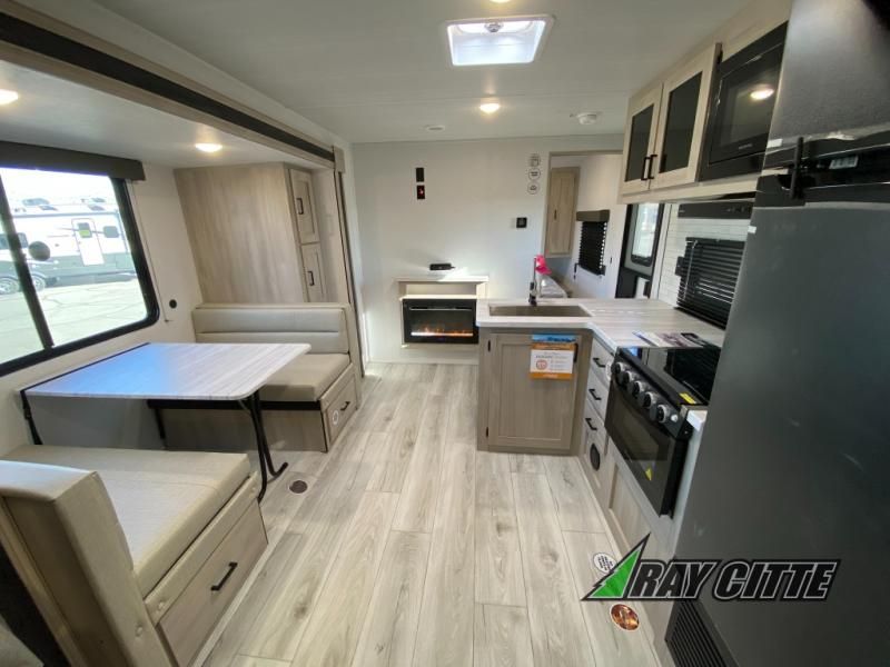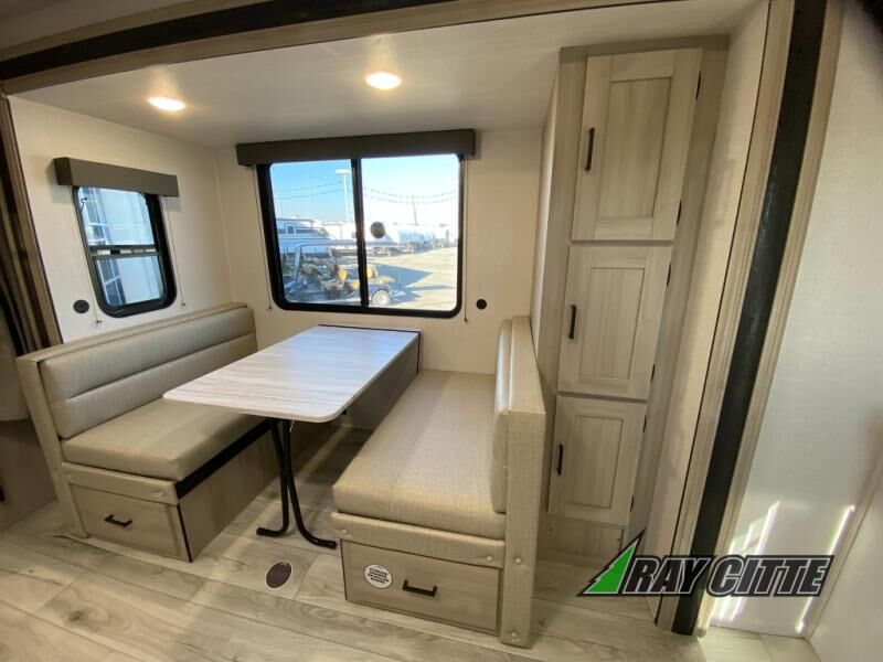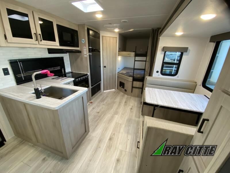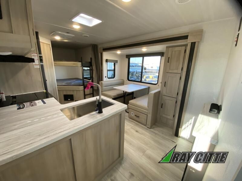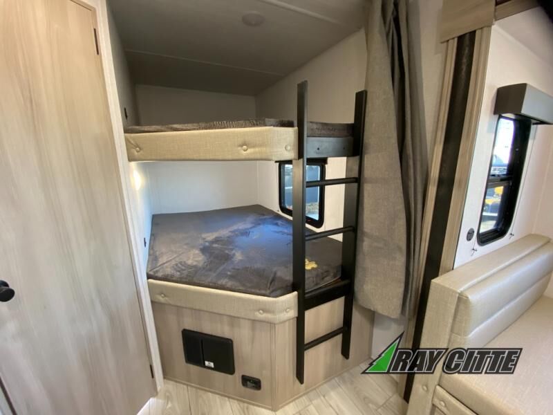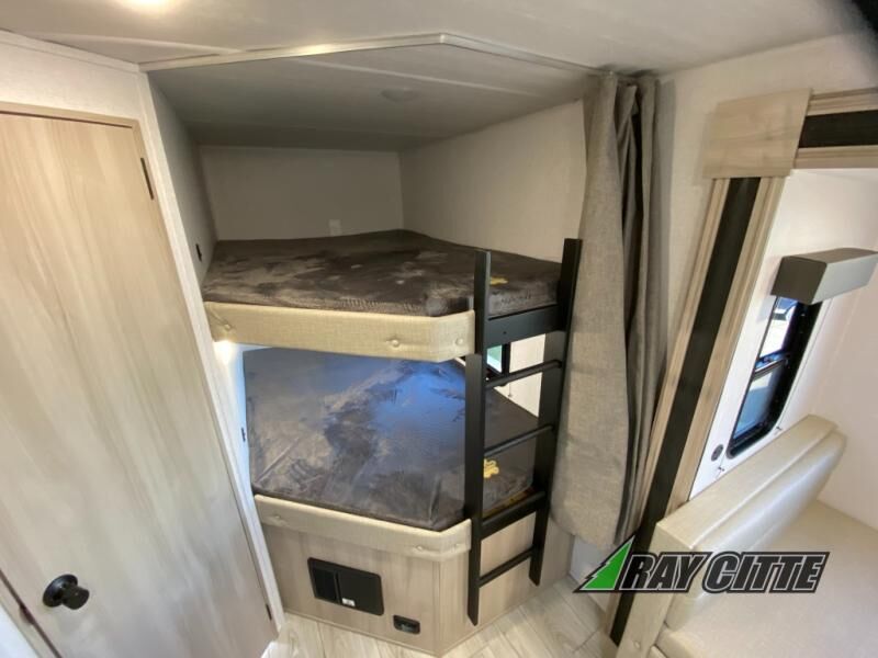 Head to the lake in this travel trailer with a large slide out for more space and comfort and additional sleeping space provided by the double-size bunks! Once you arrive, you can put out the 16' power awning, unload the pass-through storage, and make lunch on the outdoor kitchen with a pull-out griddle and refrigerator. The booth dinette inside can be used as dining space, and there is storage underneath here for added convenience. You will also find a full interior kitchen, and the full bath includes one of the dual entry doors for added convenience. When you're ready for some shut-eye, the king bed in the front private bedroom will feel just like home. There are also dual wardrobes and nightstands to keep your things tidy!