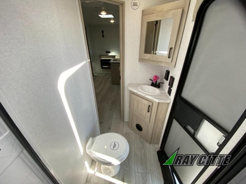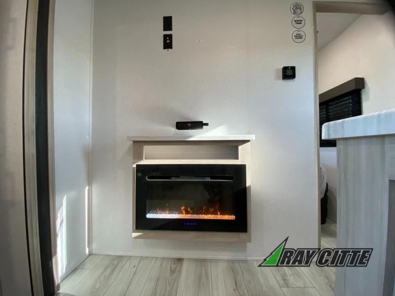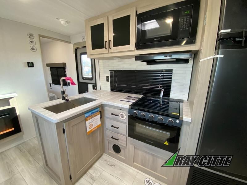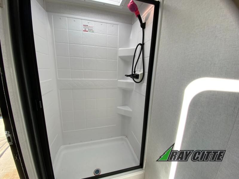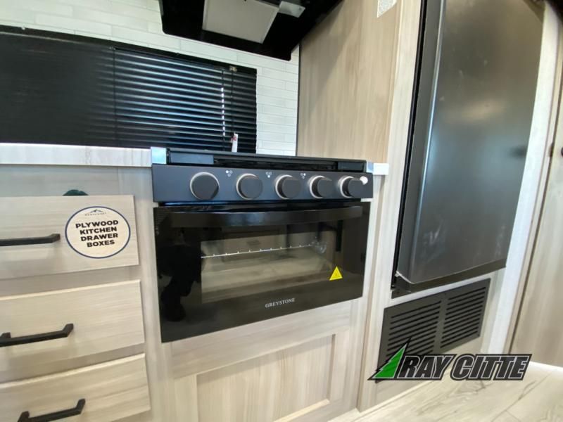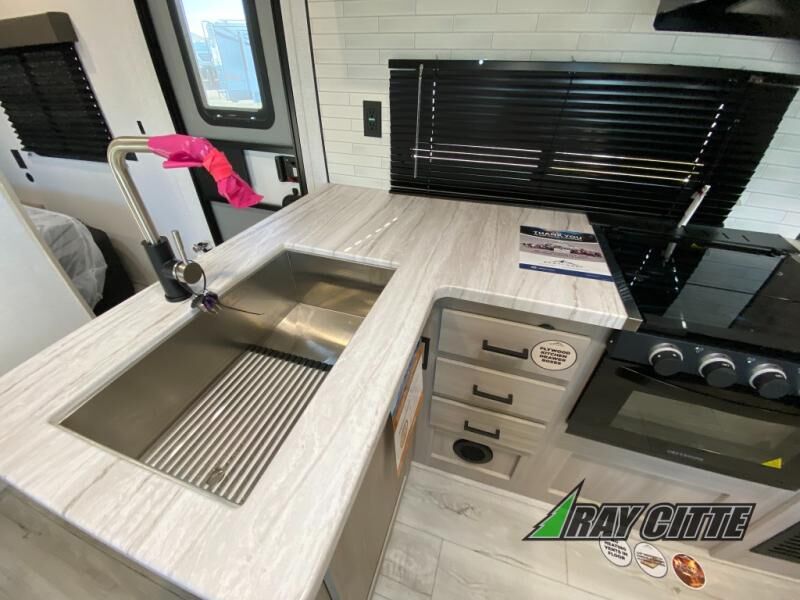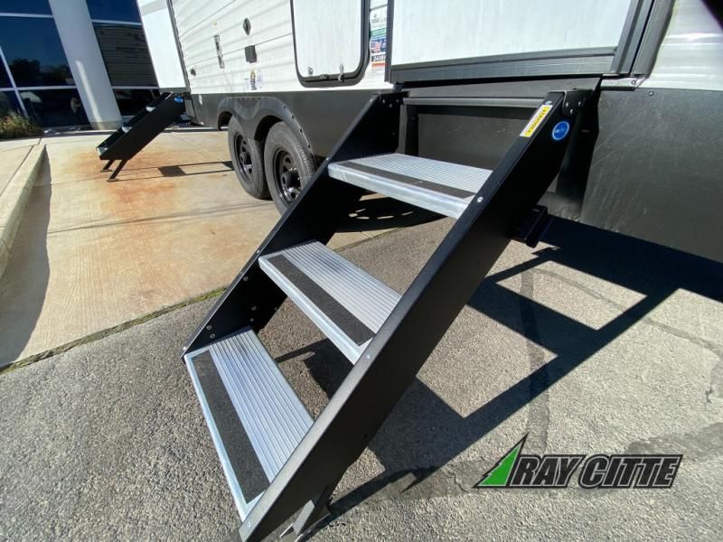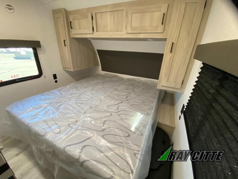 Head to the lake in this travel trailer with a large slide out for more space and comfort and additional sleeping space provided by the double-size bunks! Once you arrive, you can put out the 16' power awning, unload the pass-through storage, and make lunch on the outdoor kitchen with a pull-out griddle and refrigerator. The booth dinette inside can be used as dining space, and there is storage underneath here for added convenience. You will also find a full interior kitchen, and the full bath includes one of the dual entry doors for added convenience. When you're ready for some shut-eye, the king bed in the front private bedroom will feel just like home. There are also dual wardrobes and nightstands to keep your things tidy!