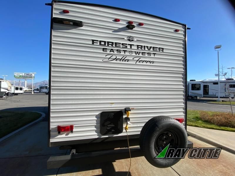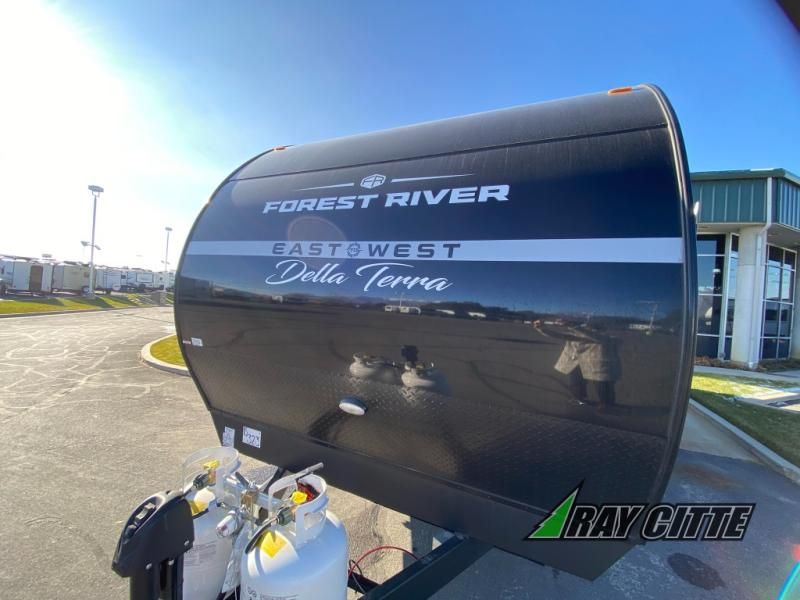 Each Della Terra travel trailer by EAST TO WEST is constructed with an enclosed and heated underbelly and enclosed holding tanks so you can camp all year long. There is also a power tongue jack with an LED light for easy set up and a power awning with LED lights you can rest under after you've unpacked. The Explore Comfort Package comes seamless pressed countertops, kitchen backsplash, window valance package with black night shades, and many more comforts. You will also appreciate the Adventure Outdoor Package with backup camera prep and solar prep, a tankless water heater, an RV grill quick disconnect, and a universal docking station with battery disconnect.