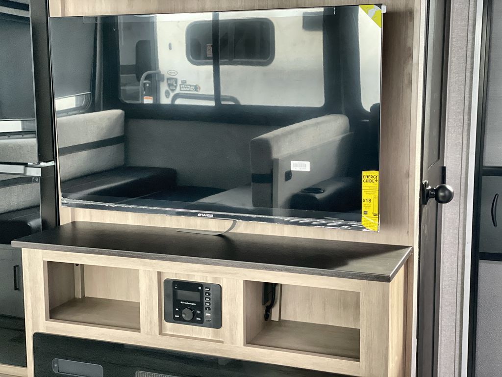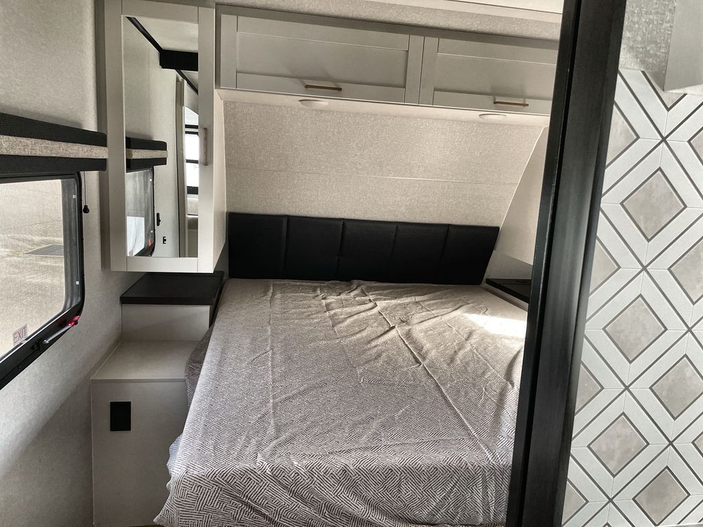 At the front of this travel trailer, you'll find a private bedroom featuring a 60" x 80" queen bed for a restful night’s sleep, in between nightstands on each side for added convenience. Moving into the center of the trailer, the main living area offers a spacious slide-out with a 60" tri-fold sofa perfect for lounging, and a 40" x 70" dinette ideal for meals, game nights, or gathering with friends and family—both of which convert into extra-sleeping space if needed. Across from the slide, the L-shaped kitchen is thoughtfully designed for ease and efficiency, featuring a stainless steel sink on one end, seamless countertop space for prepping meals, a three-burner range, and an 11 cu. ft. refrigerator for all your cooking essentials. Just beside the refrigerator is the entertainment center, with a walk-in pantry tucked behind it to store all your dry goods and snacks. At the rear, the full bathroom provides generous counter space, making it easy and comfortable to get ready each day.