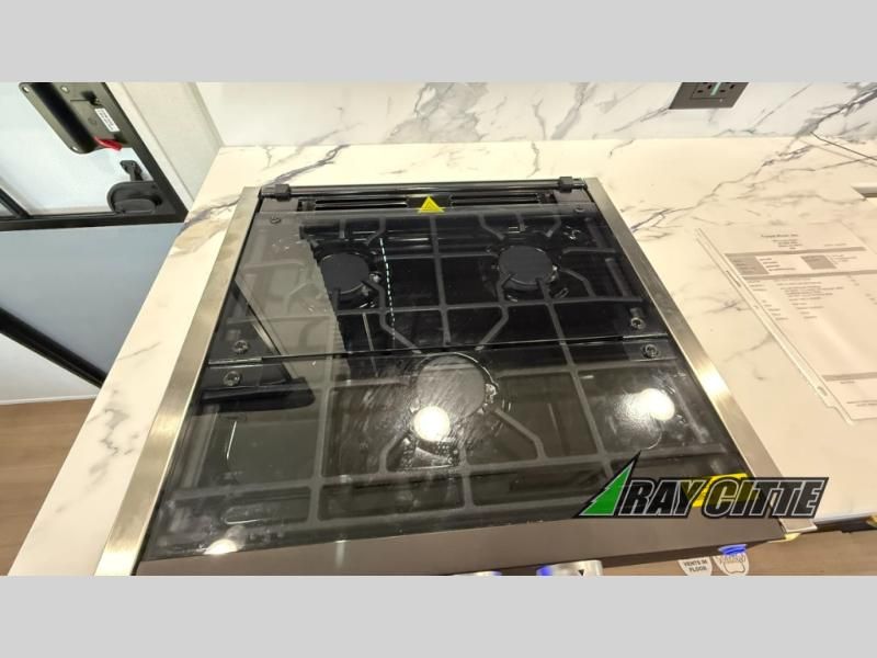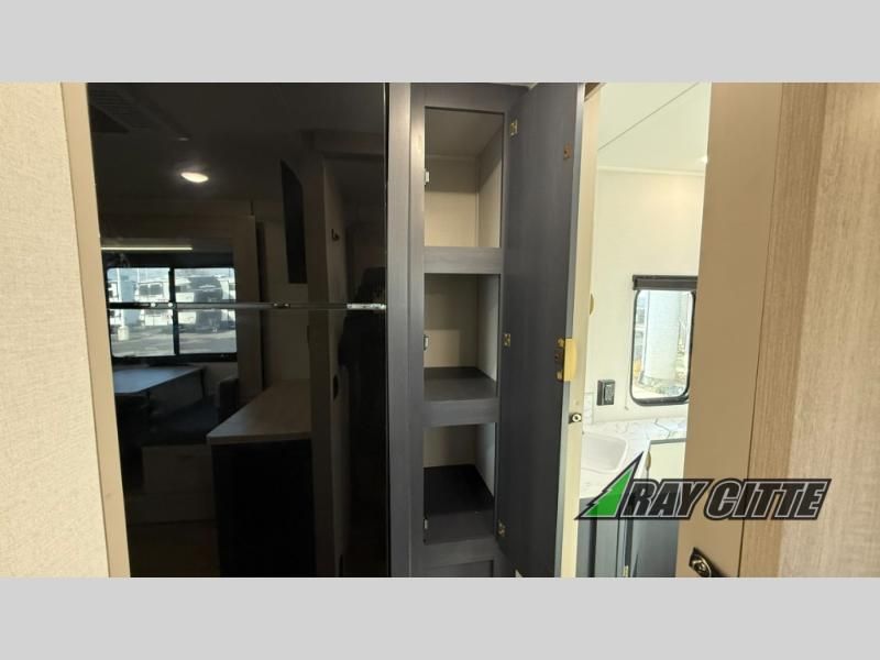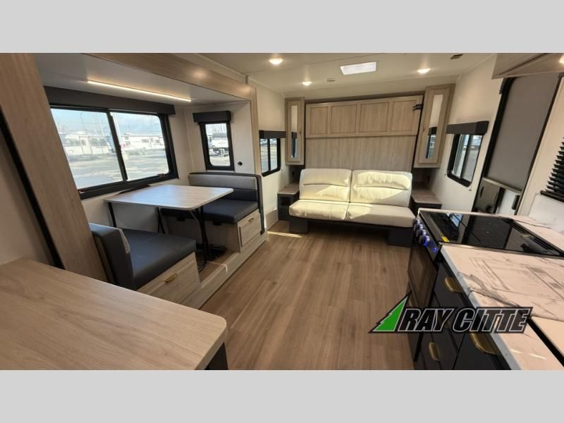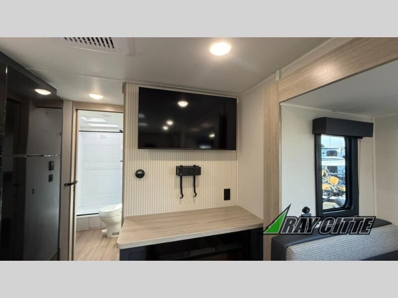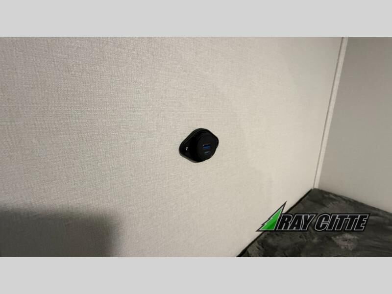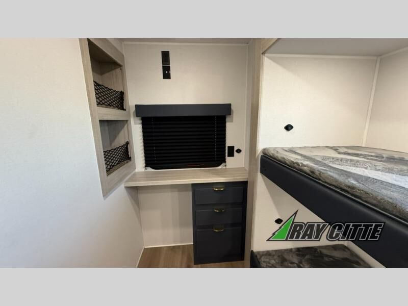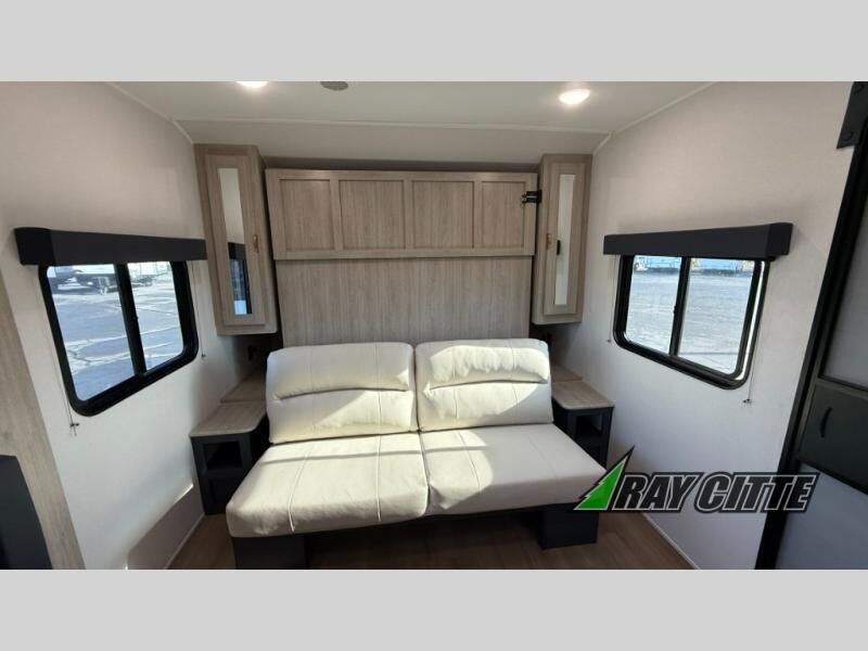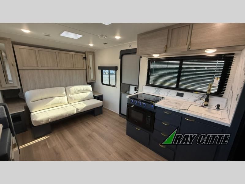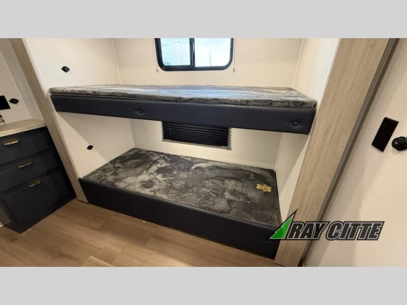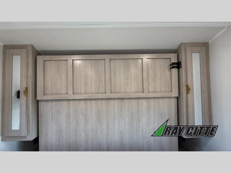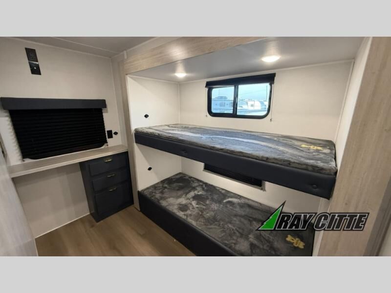 You will love this travel trailer’s features that will make you feel right at home! Starting with a desk for remote work or planning adventures, bunk beds for the kids, a comfy jack-knife sofa for lounging, and a booth dinette for meals or games. Pantry, fridge**, two-burner cooktop**, and overhead cabinets for cooking and storing grub. Furthermore, the Murphy queen bed tucks away for extra space, and the wardrobe keeps clothes tidy. Plus, this unit boasts a full bathroom to start and end each day fresh, and an exterior awning, offering extra space to hang out.