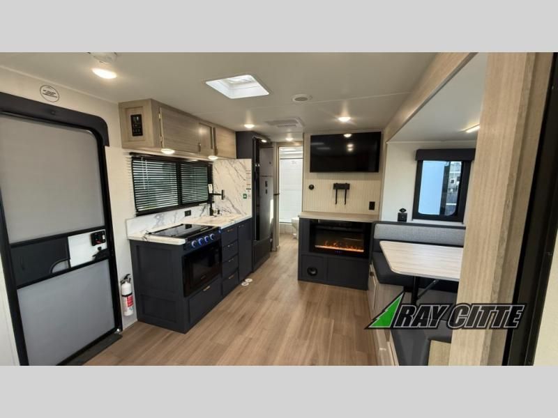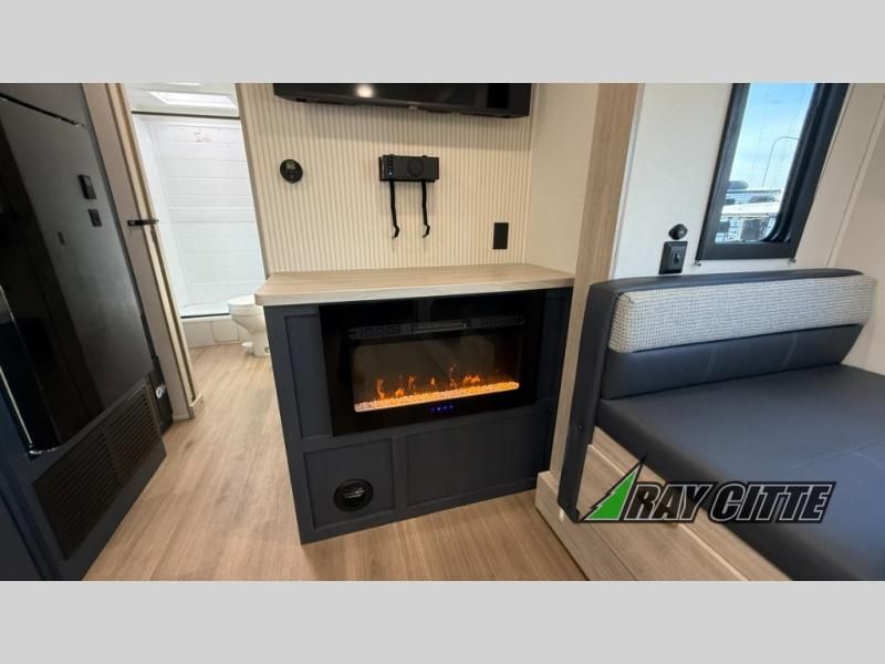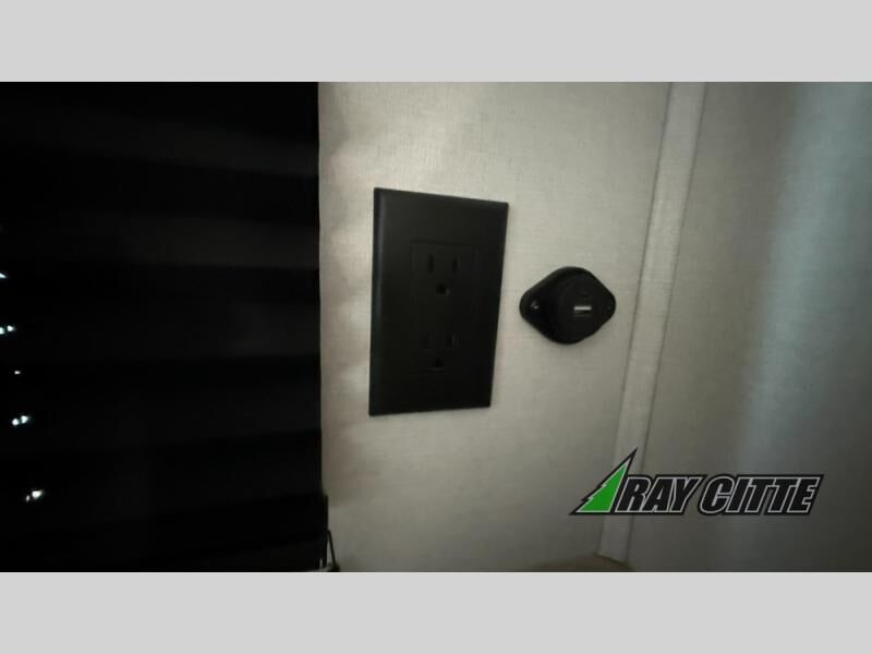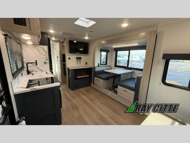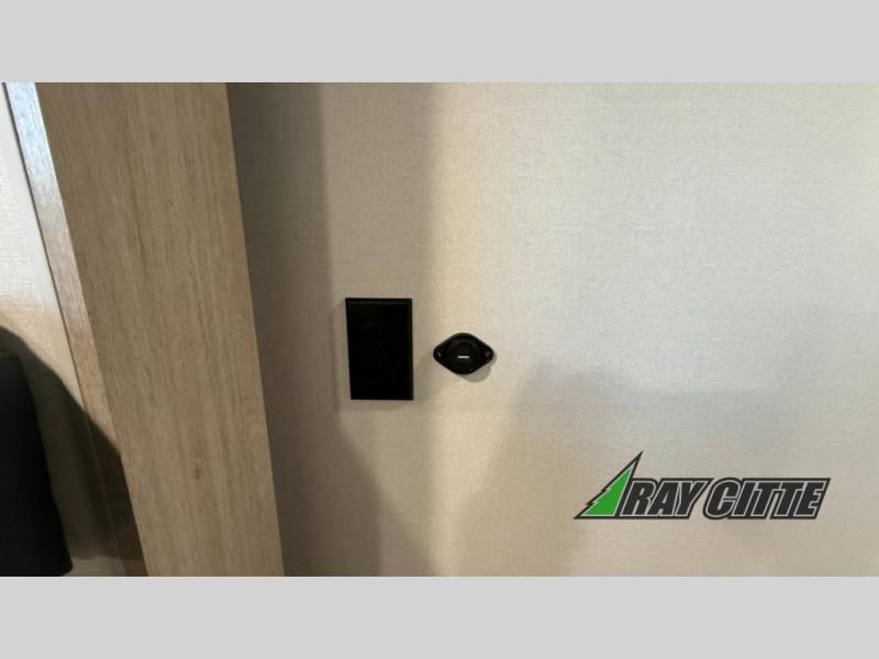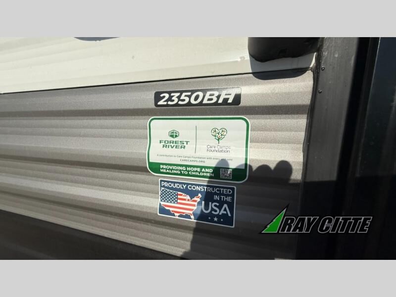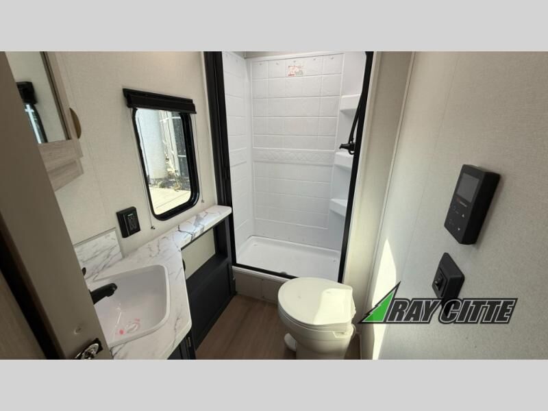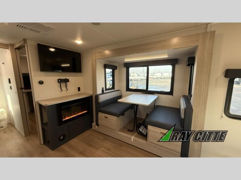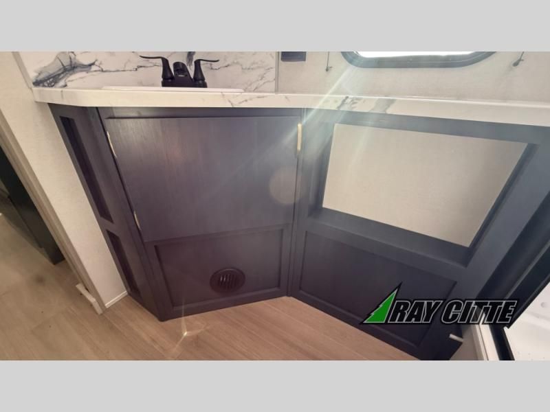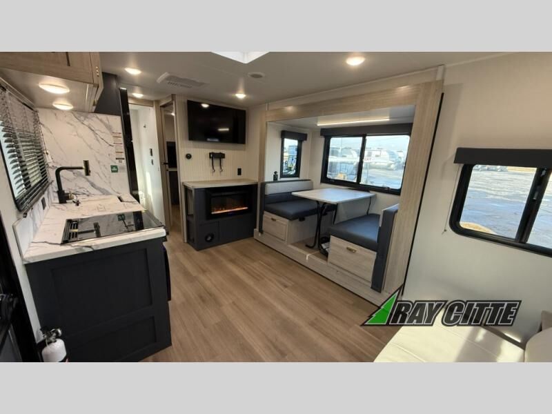 You will love this travel trailer’s features that will make you feel right at home! Starting with a desk for remote work or planning adventures, bunk beds for the kids, a comfy jack-knife sofa for lounging, and a booth dinette for meals or games. Pantry, fridge**, two-burner cooktop**, and overhead cabinets for cooking and storing grub. Furthermore, the Murphy queen bed tucks away for extra space, and the wardrobe keeps clothes tidy. Plus, this unit boasts a full bathroom to start and end each day fresh, and an exterior awning, offering extra space to hang out.
