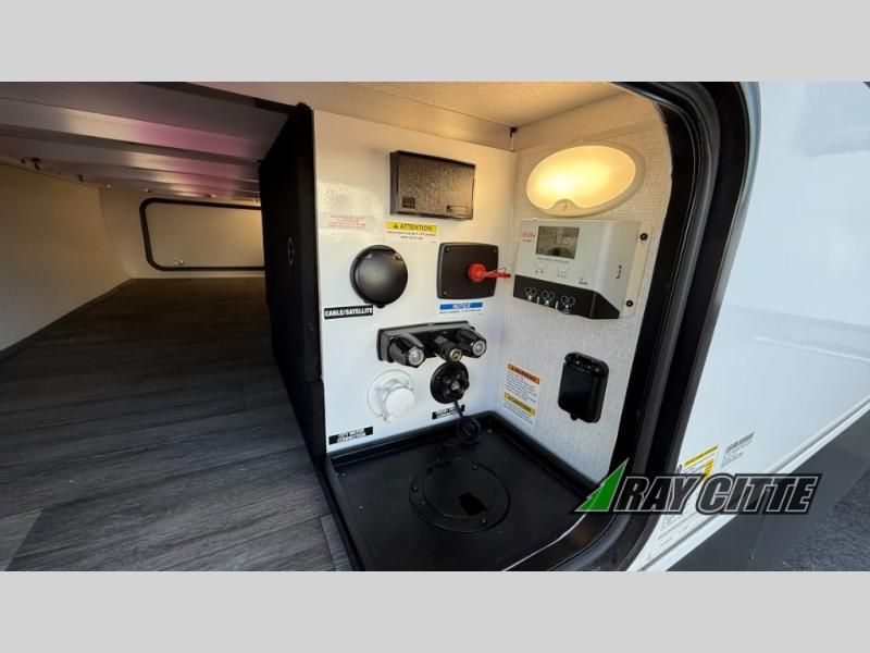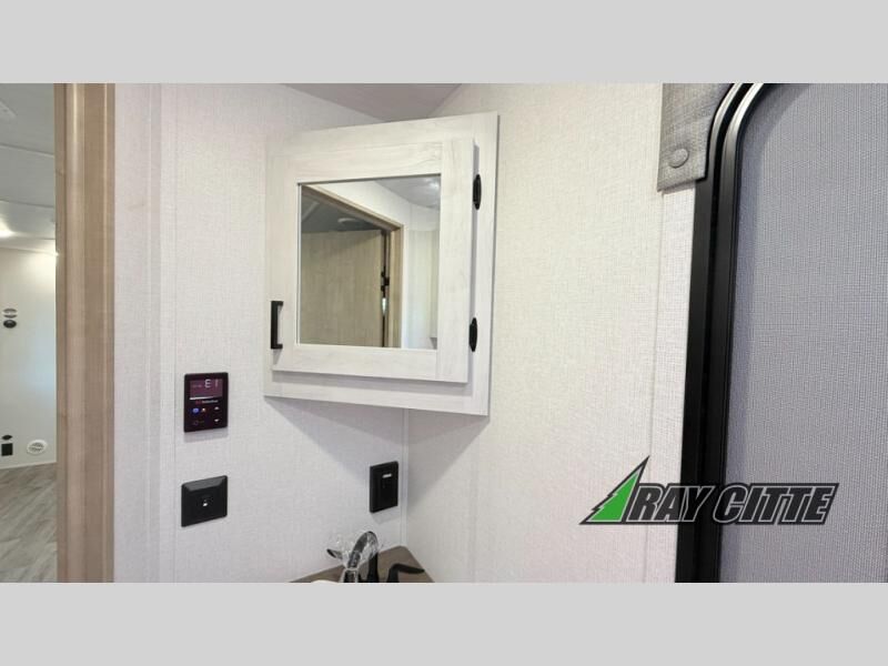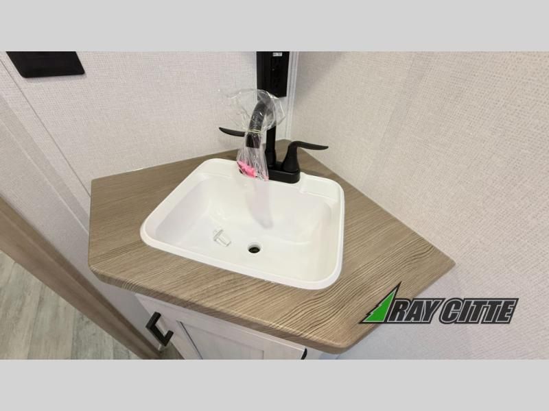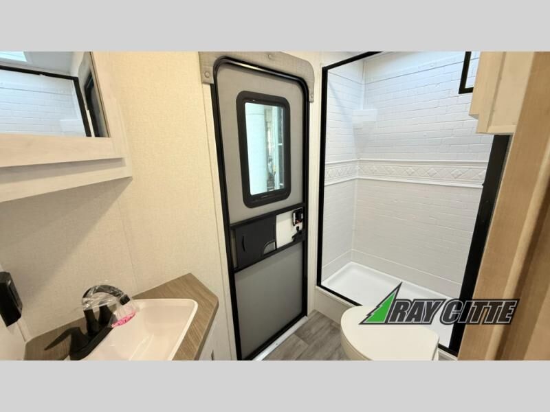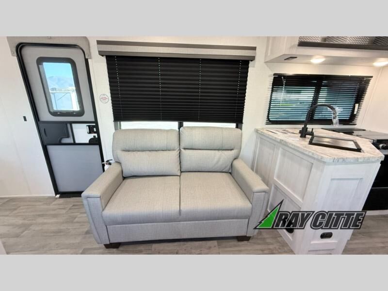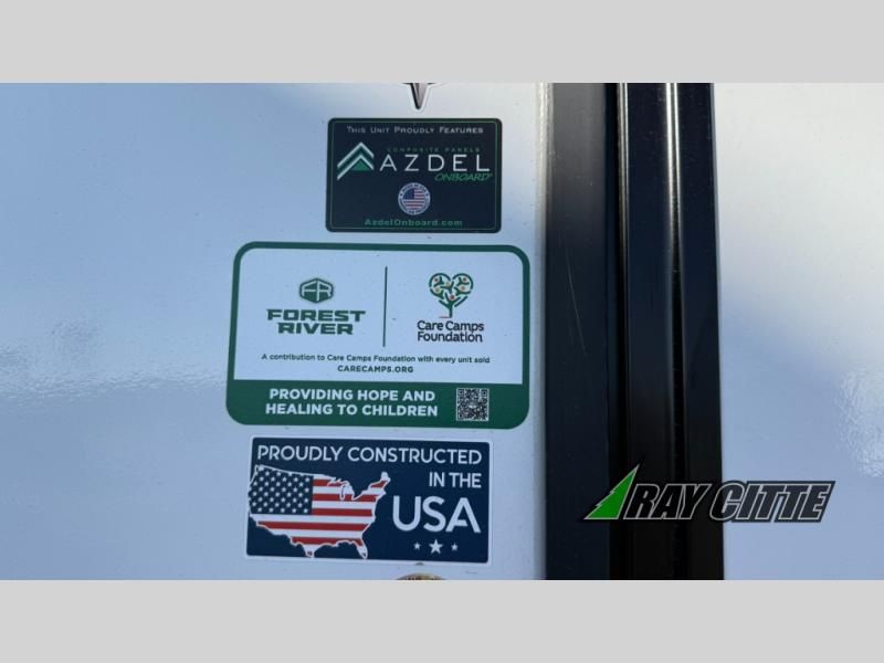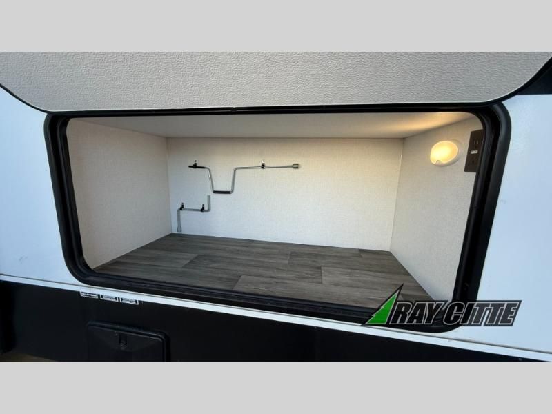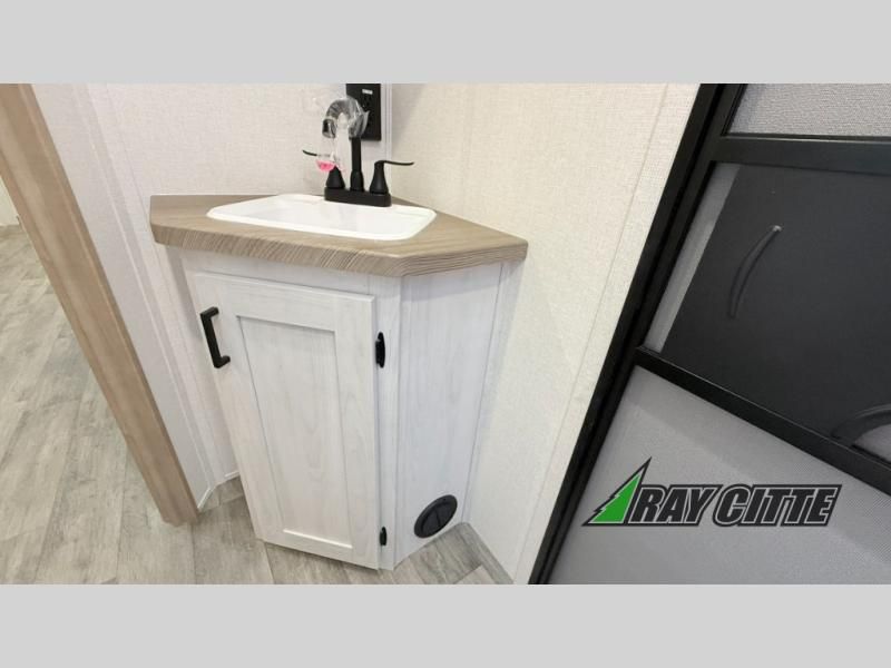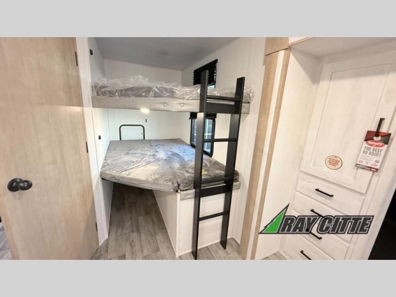 The whole family will have a fun time camping in this travel trailer! The kiddos or guests can sleep on the rear corner double over double bunk beds with additional storage, and you can sleep on the queen bed located in the front private bedroom. Everyone can rinse the sand out of their hair in the rear corner bathroom with the ABS tub surround, plus it has one of the dual entry doors. The fireplace adds comfort while you are relaxing on the tri-fold sofa which can be replaced for optional theater seating. With a countertop extension and air fryer microwave, the chef will have an easy time preparing delicious home cooked meals that can be enjoyed at the booth dinette with storage underneath. There is not only an interior 10.7 cu. ft. residential inspired refrigerator, but also an exterior 1.6 cu. ft. refrigerator. There is plenty of exterior storage and even an outside shower with hot and cold water!