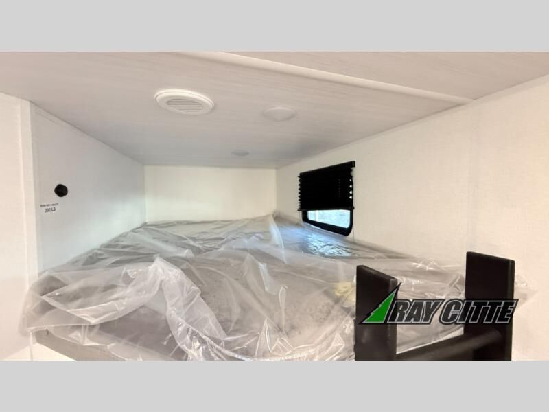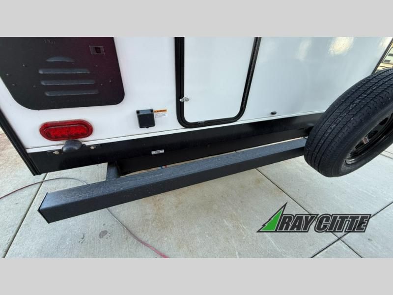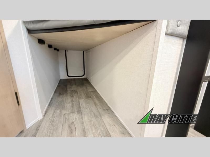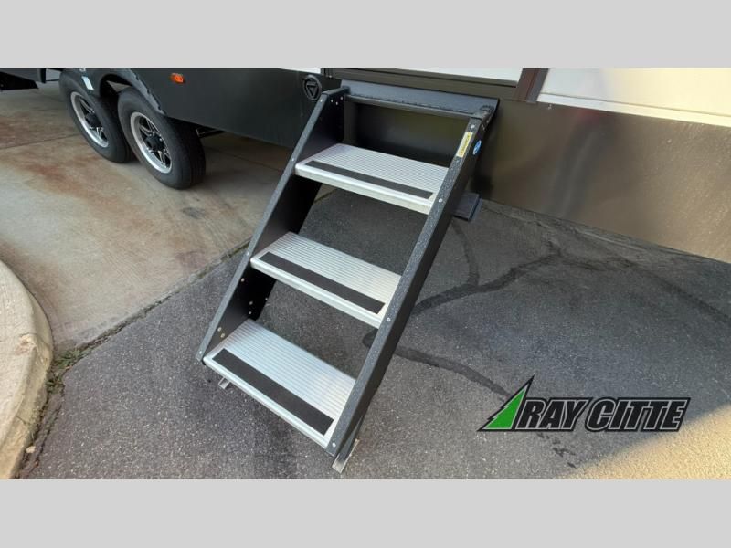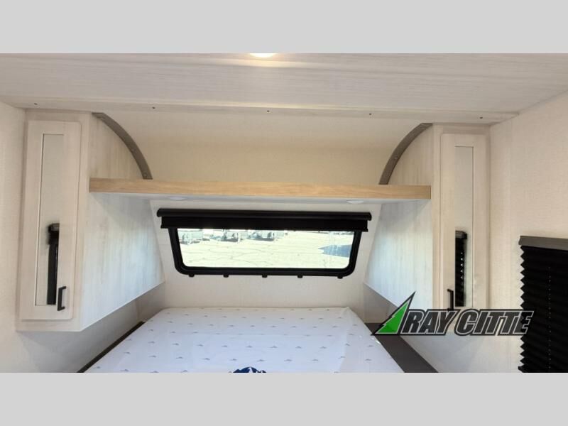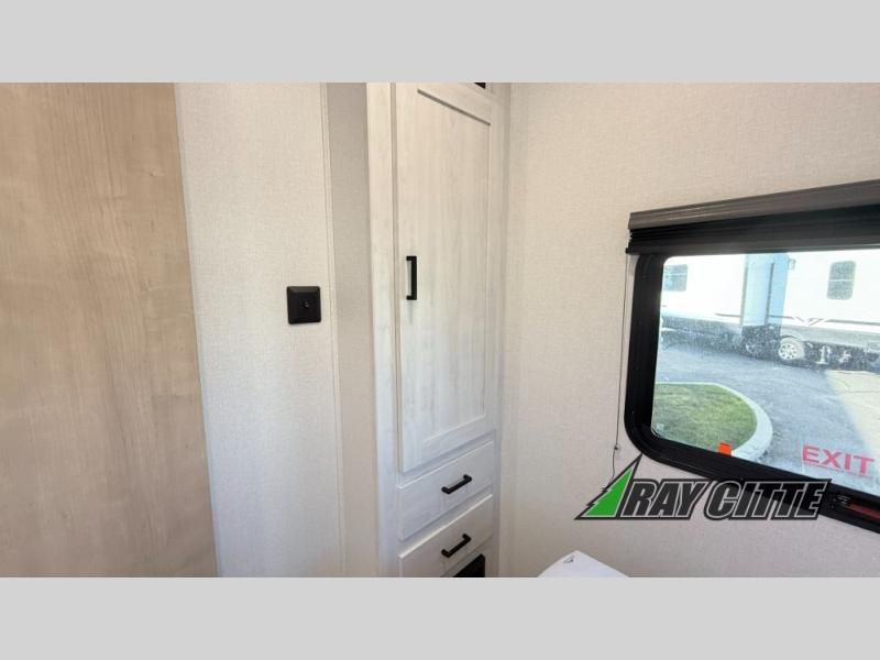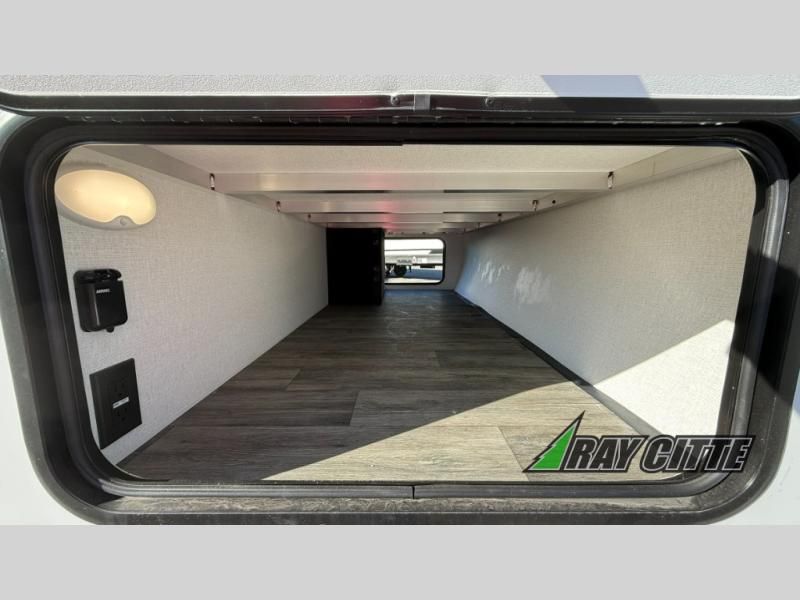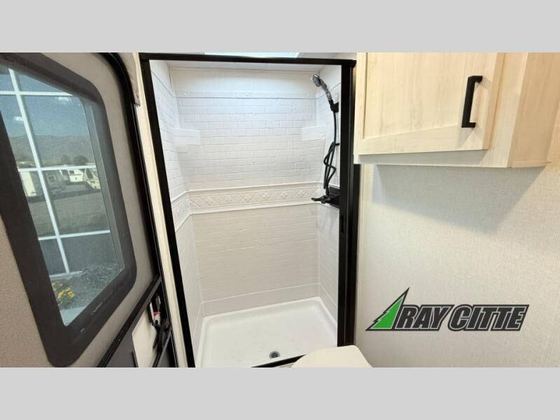 The whole family will have a fun time camping in this travel trailer! The kiddos or guests can sleep on the rear corner double over double bunk beds with additional storage, and you can sleep on the queen bed located in the front private bedroom. Everyone can rinse the sand out of their hair in the rear corner bathroom with the ABS tub surround, plus it has one of the dual entry doors. The fireplace adds comfort while you are relaxing on the tri-fold sofa which can be replaced for optional theater seating. With a countertop extension and air fryer microwave, the chef will have an easy time preparing delicious home cooked meals that can be enjoyed at the booth dinette with storage underneath. There is not only an interior 10.7 cu. ft. residential inspired refrigerator, but also an exterior 1.6 cu. ft. refrigerator. There is plenty of exterior storage and even an outside shower with hot and cold water!