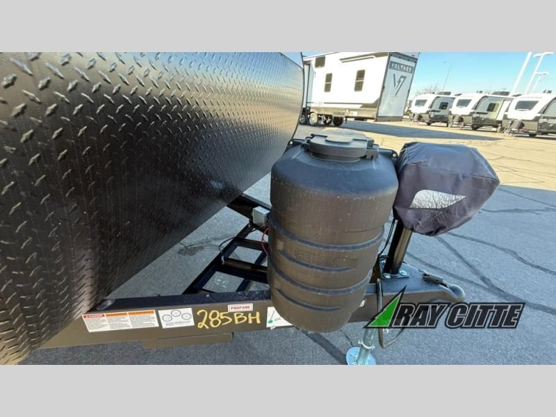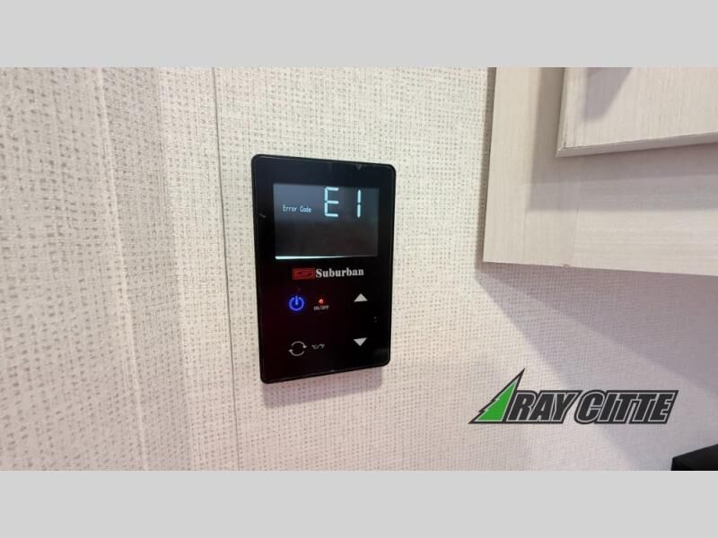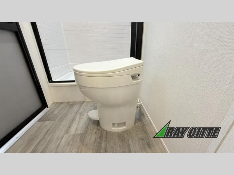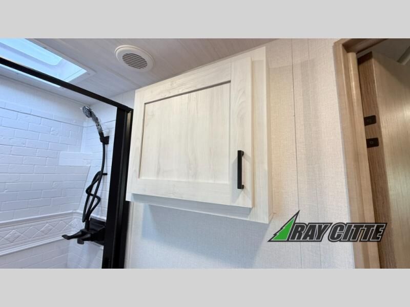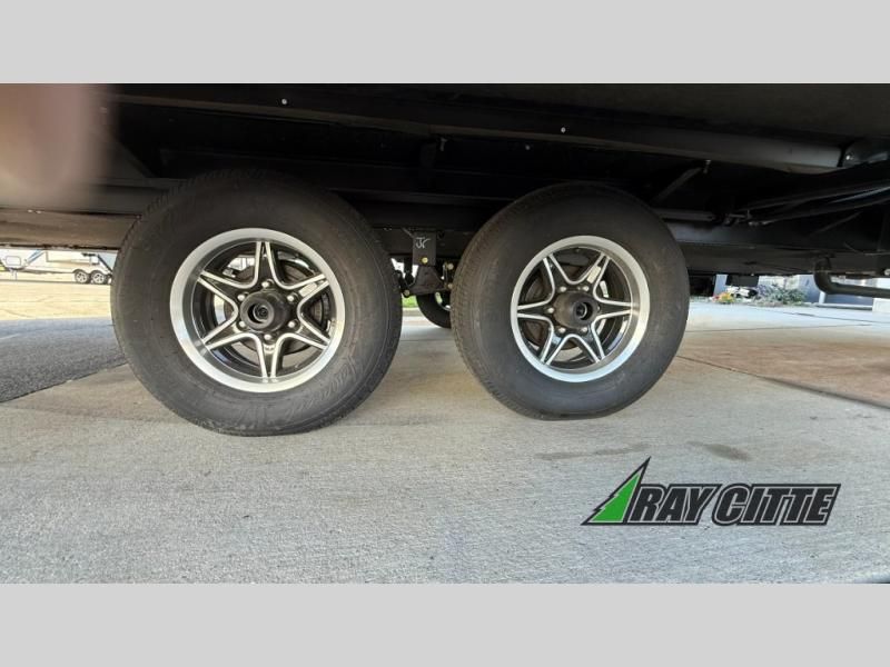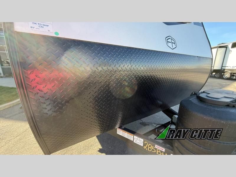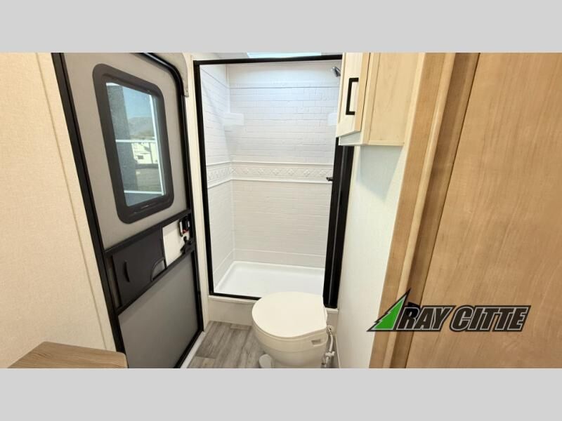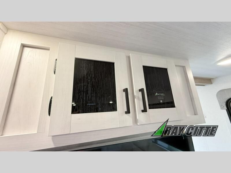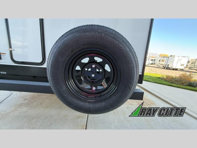The whole family will have a fun time camping in this travel trailer! The kiddos or guests can sleep on the rear corner double over double bunk beds with additional storage, and you can sleep on the queen bed located in the front private bedroom. Everyone can rinse the sand out of their hair in the rear corner bathroom with the ABS tub surround, plus it has one of the dual entry doors. The fireplace adds comfort while you are relaxing on the tri-fold sofa which can be replaced for optional theater seating. With a countertop extension and air fryer microwave, the chef will have an easy time preparing delicious home cooked meals that can be enjoyed at the booth dinette with storage underneath. There is not only an interior 10.7 cu. ft. residential inspired refrigerator, but also an exterior 1.6 cu. ft. refrigerator. There is plenty of exterior storage and even an outside shower with hot and cold water!