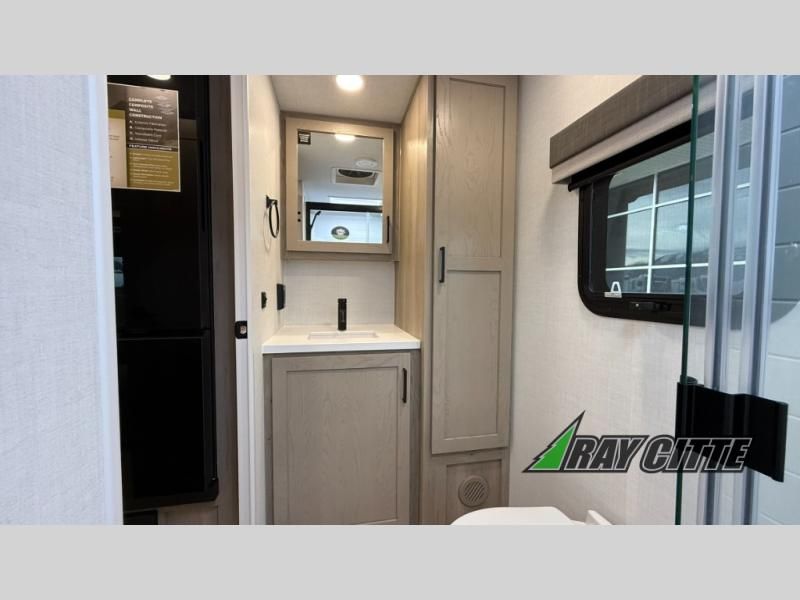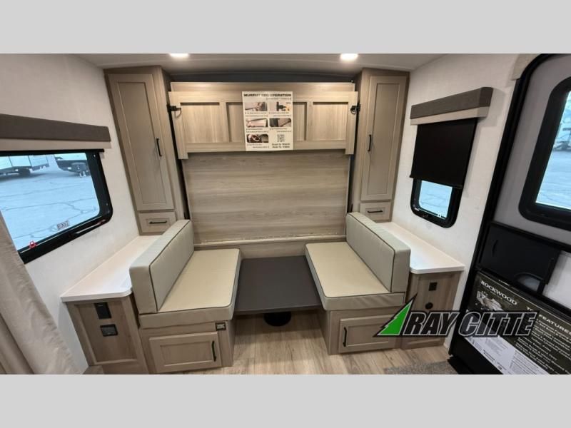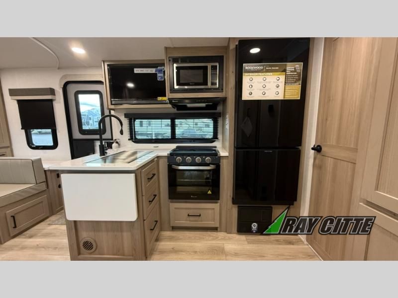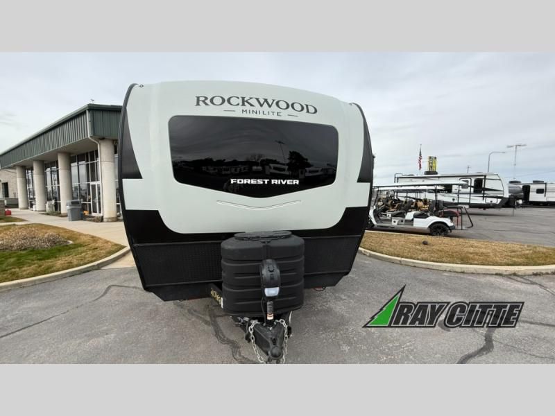 Each Rockwood Mini Lite travel trailer by Forest River is constructed with a fully laminated one-piece walkable roof, sleek frameless windows, and a six-sided full aluminum frame for strength and durability. The 12V thermostatically controlled heated tanks, plus radiant foil in the underbelly will allow you to camp well into the colder months, and the 200W roof solar panel will be perfect for a little off-gridding. Each model includes solid surface kitchen countertops, hidden hinge cabinet doors, roller shades, plus many more interior features. Having an AIR 360+ omnidirectional antenna with WiFi prep on board gives you the option to get some work done if it's needed, and the power tongue jack provides hassle-free set up, so you can enjoy more time relaxing!