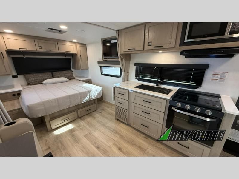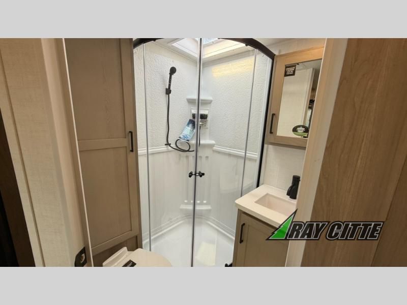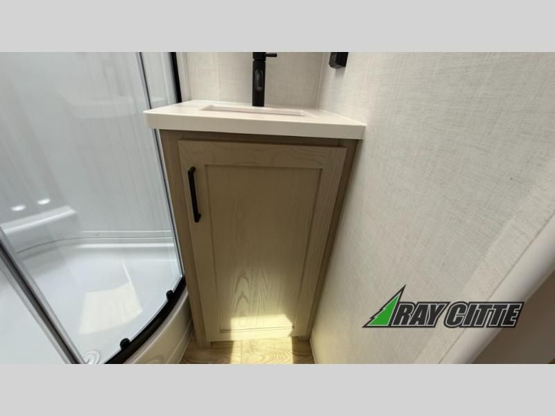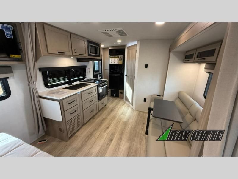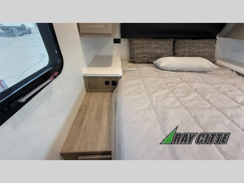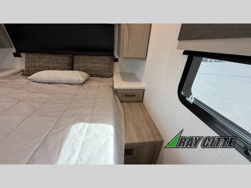 Wherever you decide to camp, you will love every minute in this cute couple's trailer. The sofa slide with a table will provide a place to relax, eat, and even sleep an extra guest if you have one, and the front RV queen bed includes a privacy curtain to enjoy your own space. There are dual bedroom wardrobes to keep your clothes tidy, and you'll find two pass-through storage compartments for your larger gear. Since there is a full bath on board you won't have to use the camp's facilities, and you can make it a movie night with the TV in the main living area!