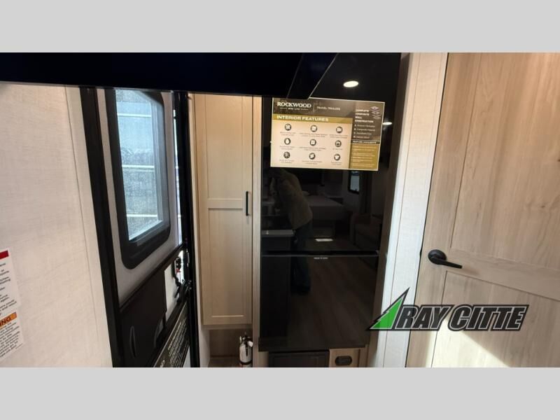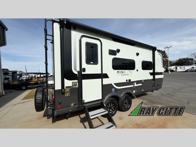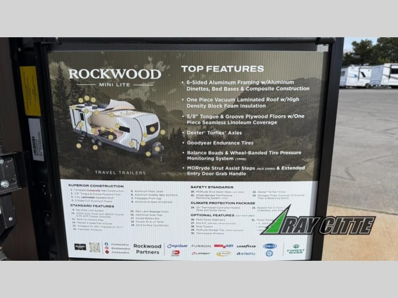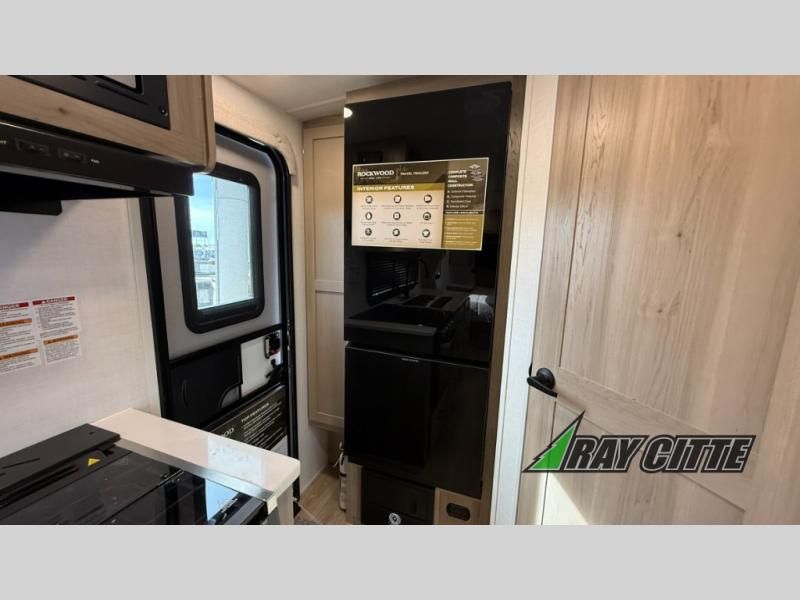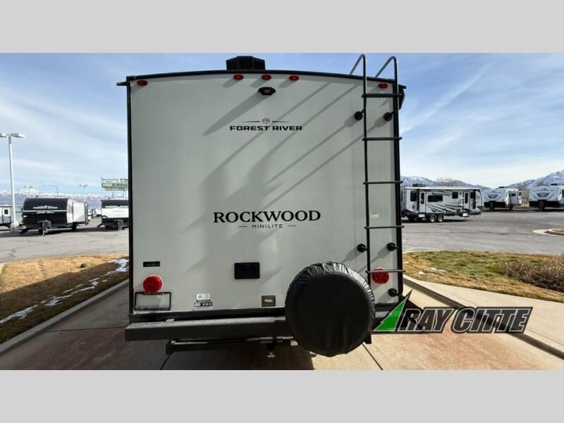 Each Rockwood Mini Lite travel trailer by Forest River is constructed with a fully laminated one-piece walkable roof, sleek frameless windows, and a six-sided full aluminum frame for strength and durability. The 12V thermostatically controlled heated tanks, plus radiant foil in the underbelly will allow you to camp well into the colder months, and the 200W roof solar panel will be perfect for a little off-gridding. Each model includes solid surface kitchen countertops, hidden hinge cabinet doors, roller shades, plus many more interior features. Having an AIR 360+ omnidirectional antenna with WiFi prep on board gives you the option to get some work done if it's needed, and the power tongue jack provides hassle-free set up, so you can enjoy more time relaxing!