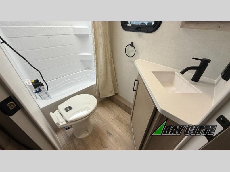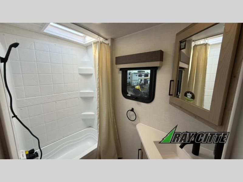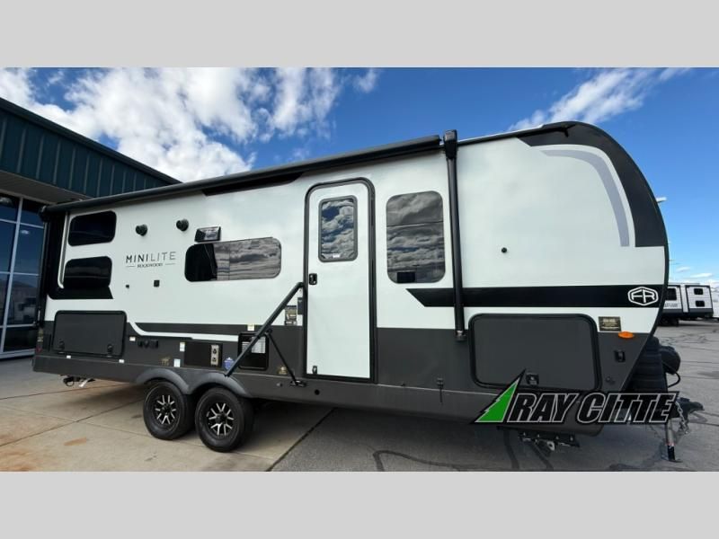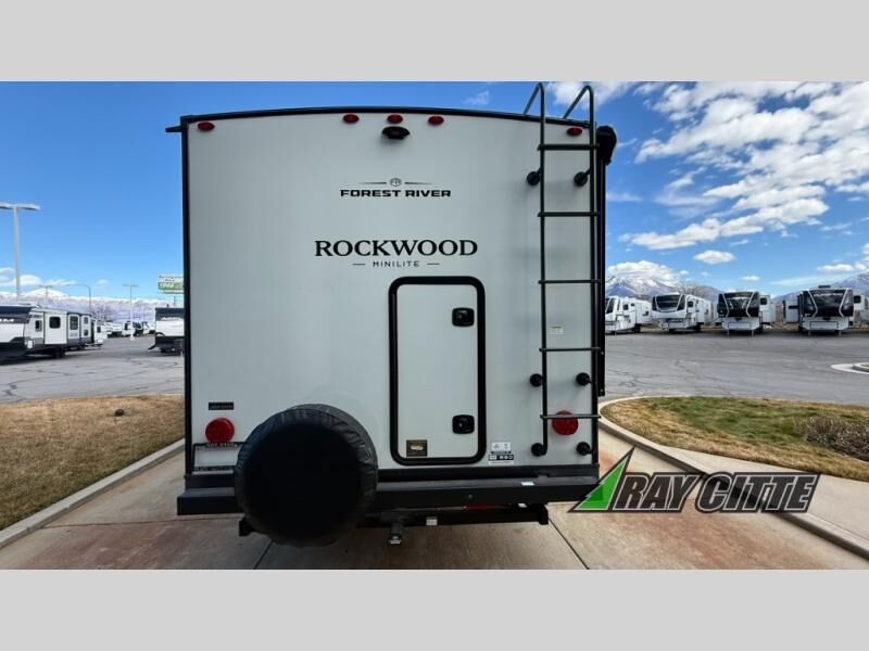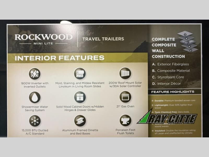 Each Rockwood Mini Lite travel trailer by Forest River is constructed with a fully laminated one-piece walkable roof, sleek frameless windows, and a six-sided full aluminum frame for strength and durability. The 12V thermostatically controlled heated tanks, plus radiant foil in the underbelly will allow you to camp well into the colder months, and the 200W roof solar panel will be perfect for a little off-gridding. Each model includes solid surface kitchen countertops, hidden hinge cabinet doors, roller shades, plus many more interior features. Having an AIR 360+ omnidirectional antenna with WiFi prep on board gives you the option to get some work done if it's needed, and the power tongue jack provides hassle-free set up, so you can enjoy more time relaxing!