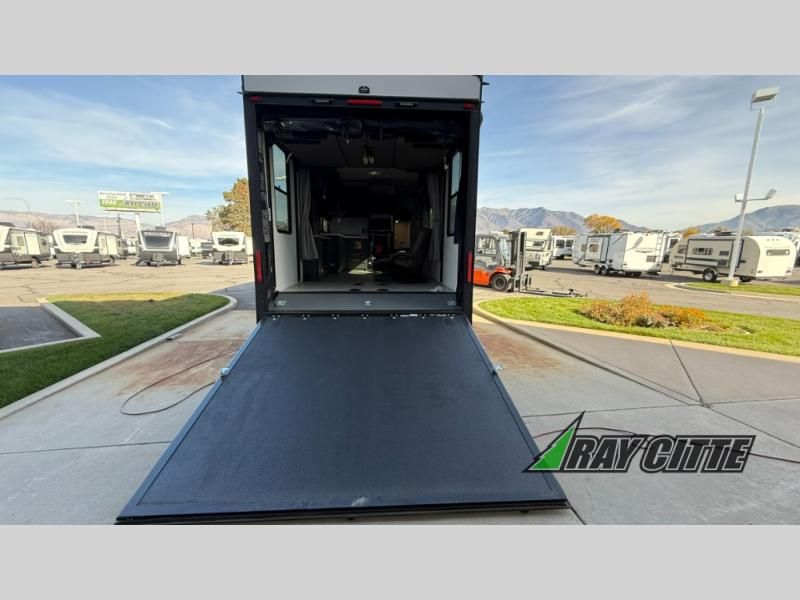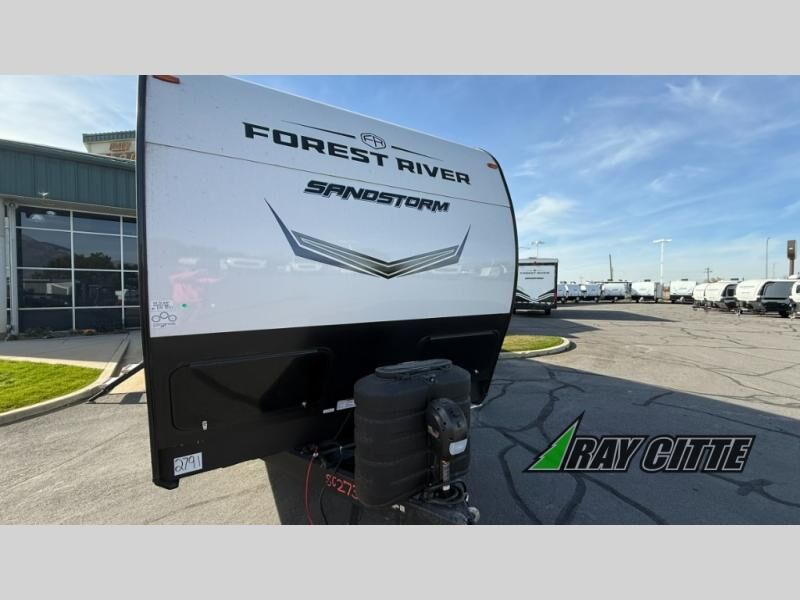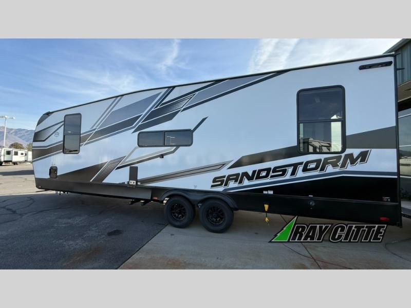 The Sandstorm toy haulers by Forest River let you take your adventures up a notch! There are four different build levels to choose from to best fit your needs, budget, and style. Each travel trailer and fifth wheel include flipped axles with no interior drive on wheel wells, F****lip tread solid entry steps, and tie-downs mounted to steel throughout to keep toys secure on the way to the campground. The power tongue jack will make it easier than ever to hitch up and go, and the Lippert ladder prep means you can add this option to easily access the roof. A 40 gallon fuel station comes standard to keep your toys ready to go when you are, and the dual 20 lbs. propane tanks will let you hook up the grill to make dinner for your whole crew. Some of the other convenient features include a spare tire (with carrier on tongue pull) if an unfortunate flat happens, a 335W solar panel, and a 1.5 cu. ft. convection microwave. And don't forget about the available options that will allow you to customize your toy hauler exactly how you want it!