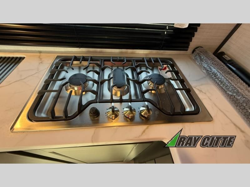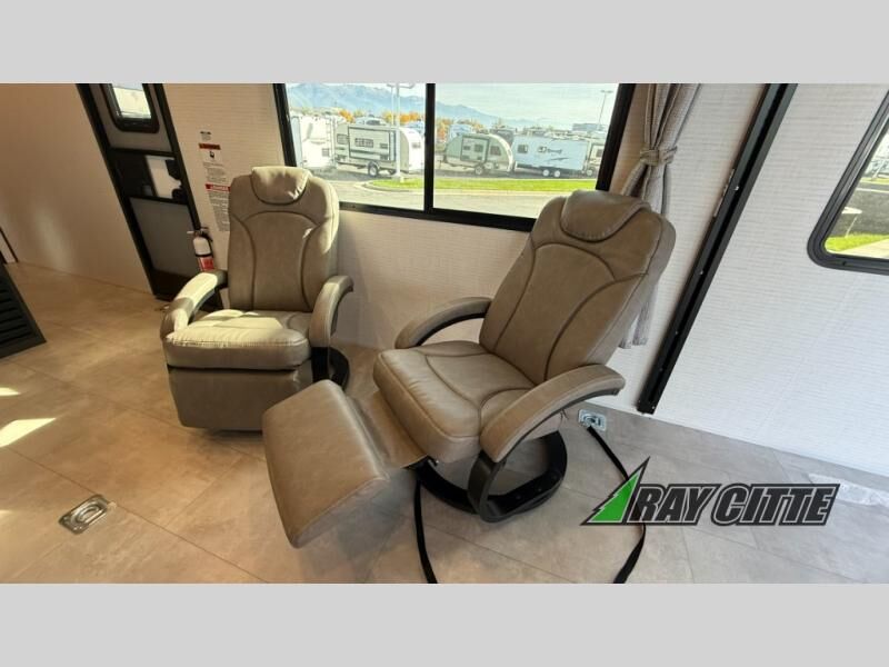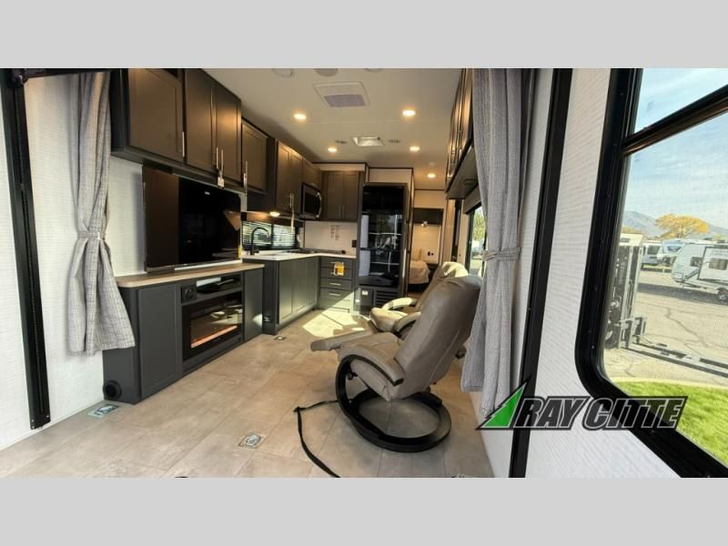 Spend your weekends riding the trails with this toy hauler in tow! There is 16' 1" total garage space for your toys and a ramp door for quick unloading. While the chef of your group is preparing lunch on the cooktop, everyone else can play a card game at the electric pass-thru dinette. This model includes an entertainment center directly across from the dual lounge chairs for all-around comfort. The king bed in the front private bedroom is sure to bring a great night's rest, while your guests sleep on the dinette or drop-down electric bed above!