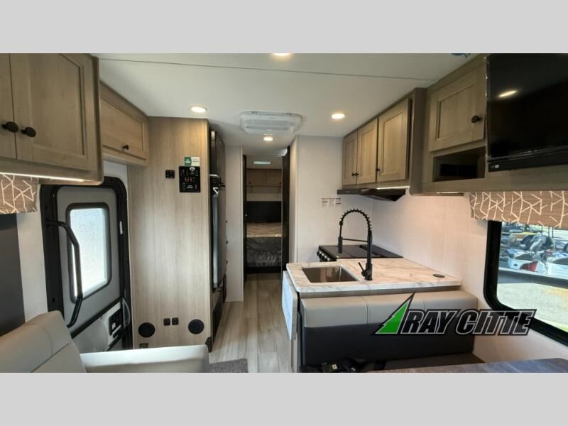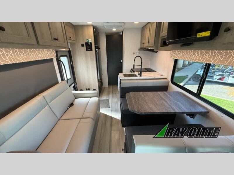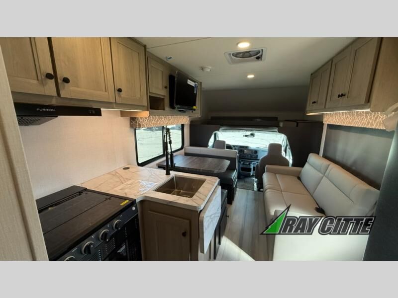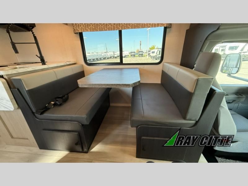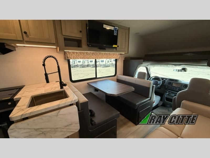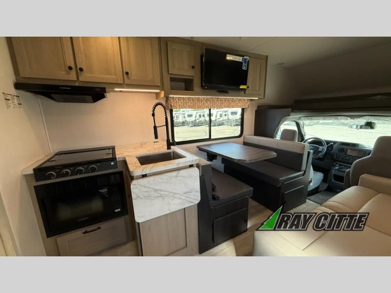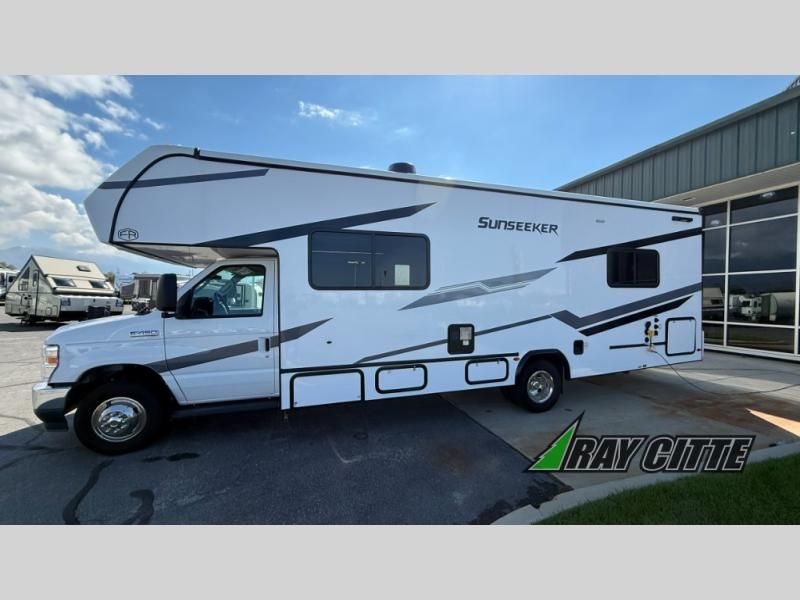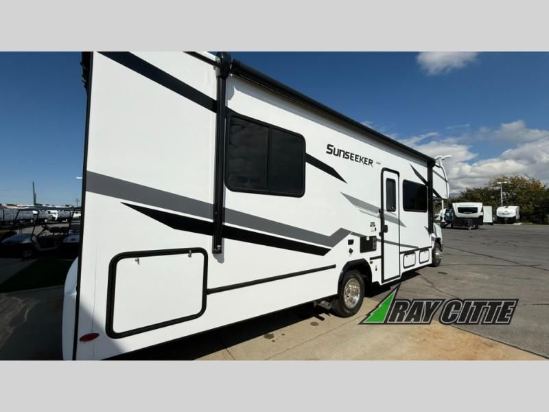 This Sunseeker LE Class C gas motorhome will allow you to travel to other states with your favorite people beside you! You can take a moment to enjoy a fresh cup of coffee in the morning while sitting at the booth dinette or on the sofa, or you can spend a little extra time creating a hearty breakfast in the kitchen on the recessed three-burner range. The 10.7-cubic foot refrigerator will store your cheese and milk, and the convection microwave will heat up leftovers with ease. The separated bathroom leads into the rear bedroom where you will find an RV queen bed with wardrobes on either side, and you can also head outside to enjoy the 18' electric awning with LED lights before bed.