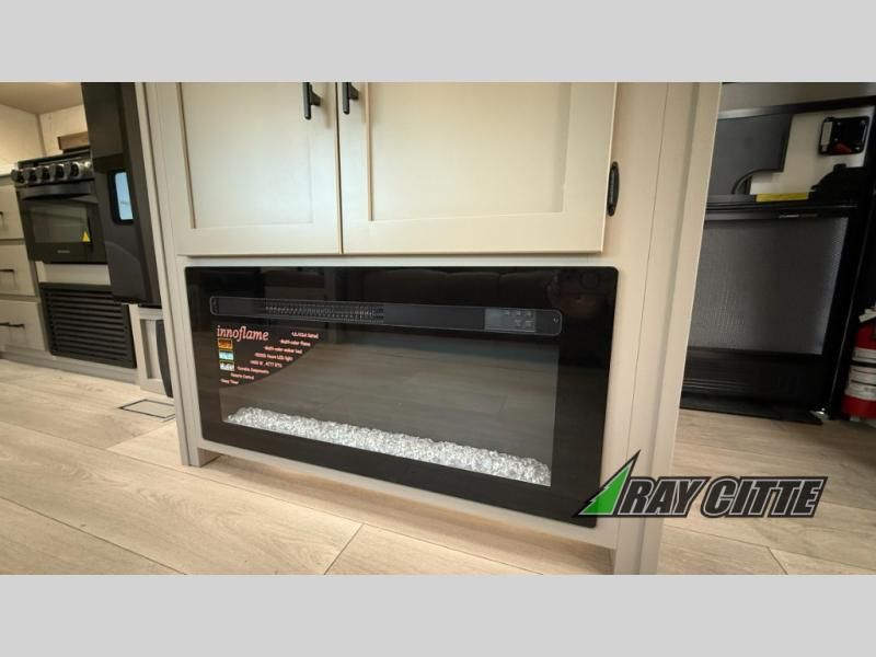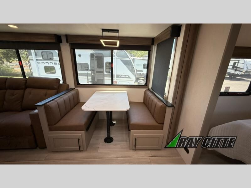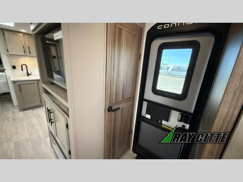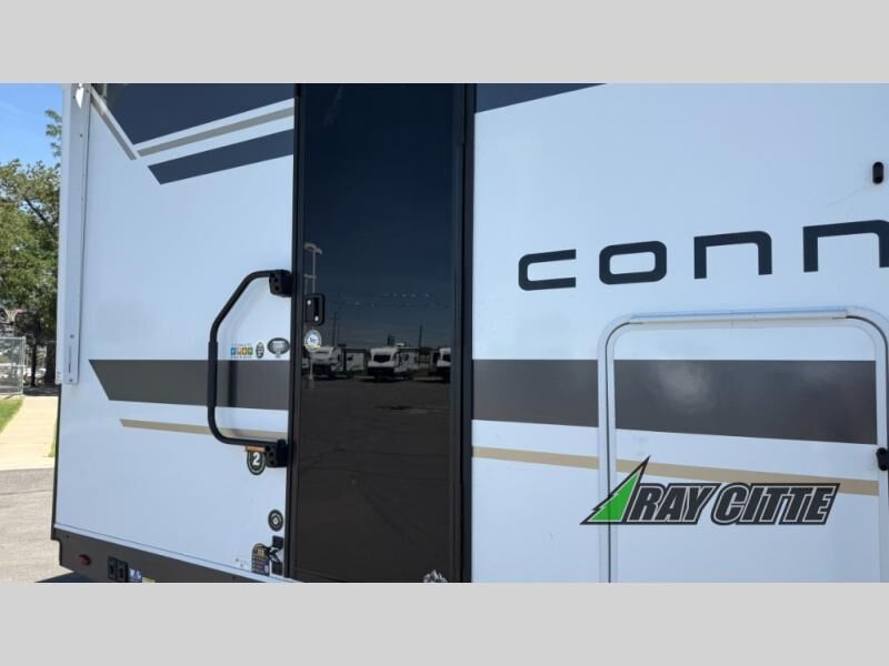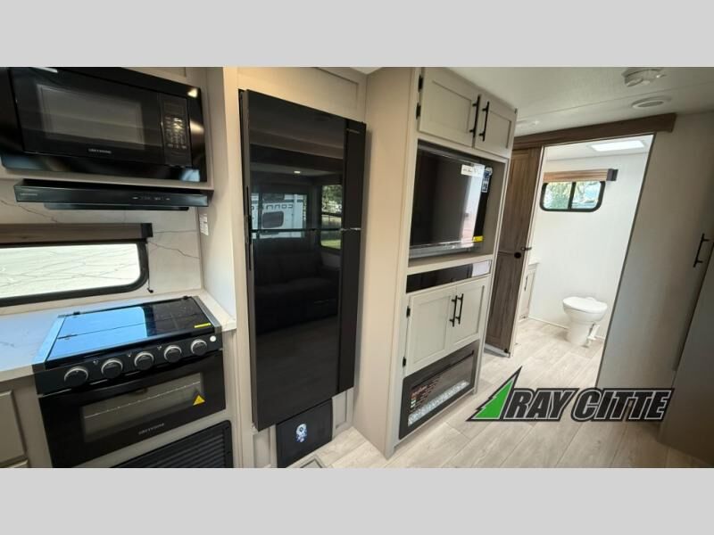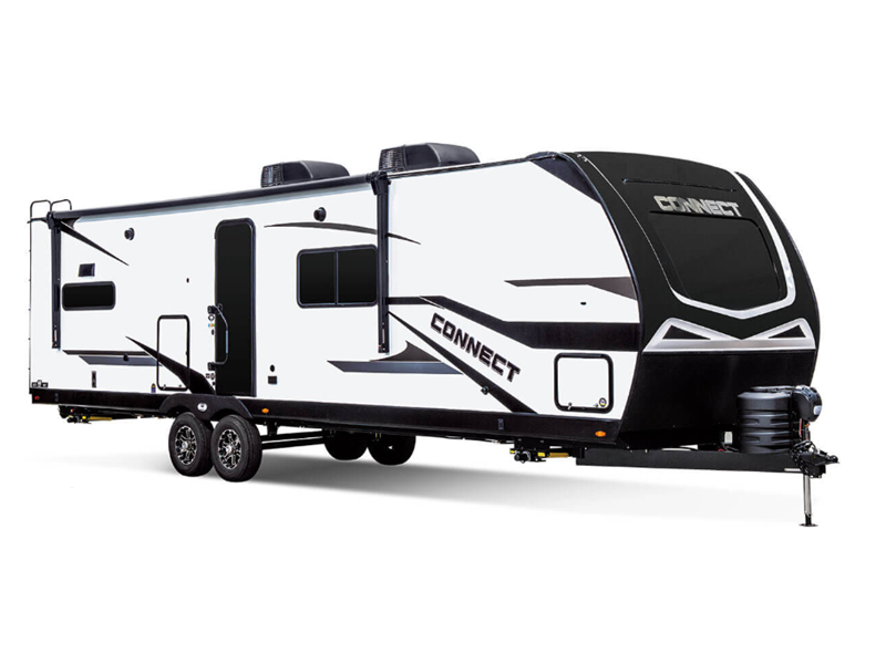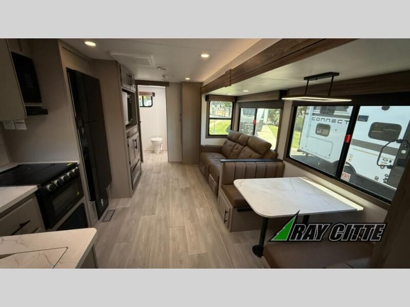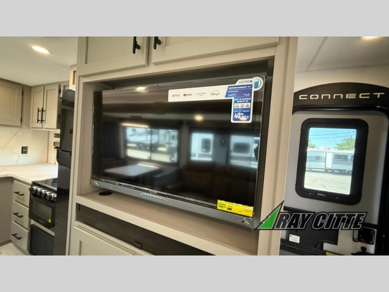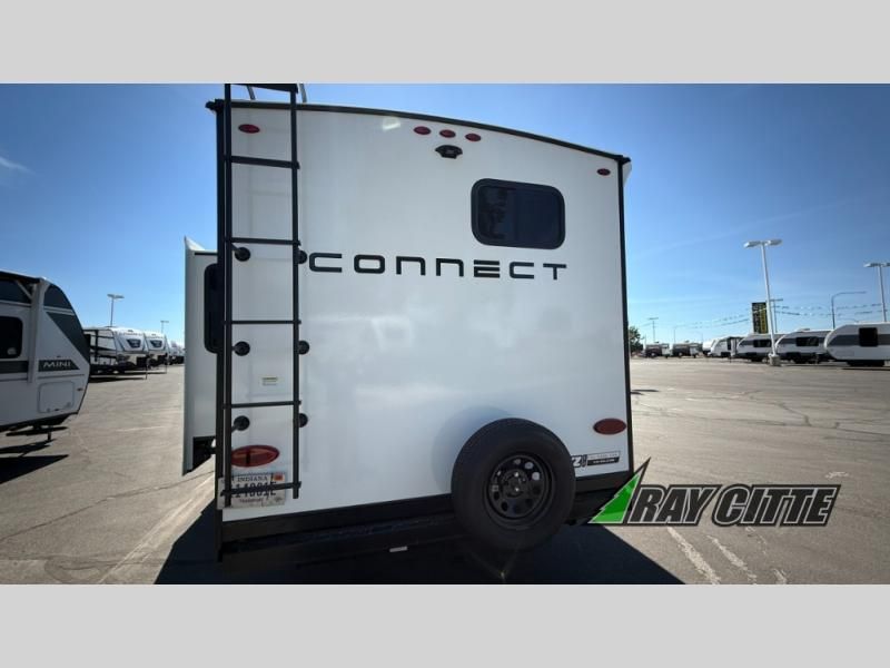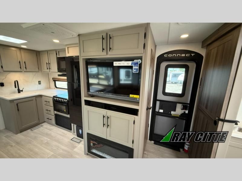 Your needs will be met and your desires will be fulfilled with this Connect travel trailer! Probably the thing you miss most when you camp is your comfortable bed back at home, and that's exactly why this trailer comes with a Serta Comfort foam king mattress in the private bedroom. The other thing you are prone to miss is your bathroom, and the full rear bathroom on this trailer is an excellent replacement with its 30" x 36" shower, skylight, linen closet, MaxxAir vent, porcelain foot-flush toilet, and dual sink vanity. Sit back on the hide-a-bed sofa and enjoy a night of relaxation in front of the LED TV and 34" fireplace. You can even grab a couple of drinks from the 10 cu. ft. 12V refrigerator, snacks from the walk-in pantry with coat hooks, or you can make it a fun evening by playing a game together at the booth dinette.