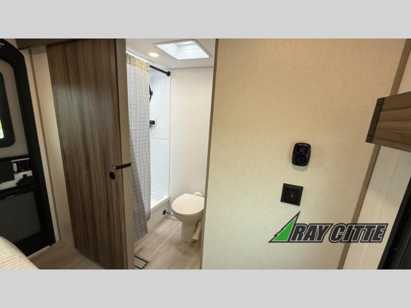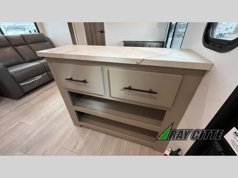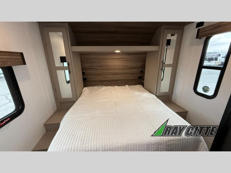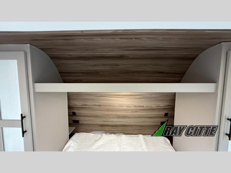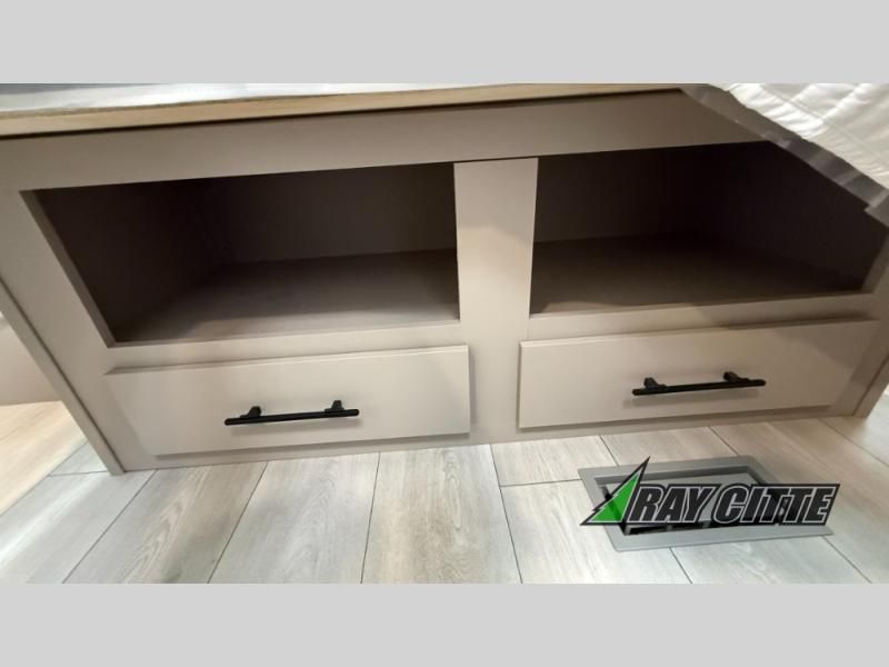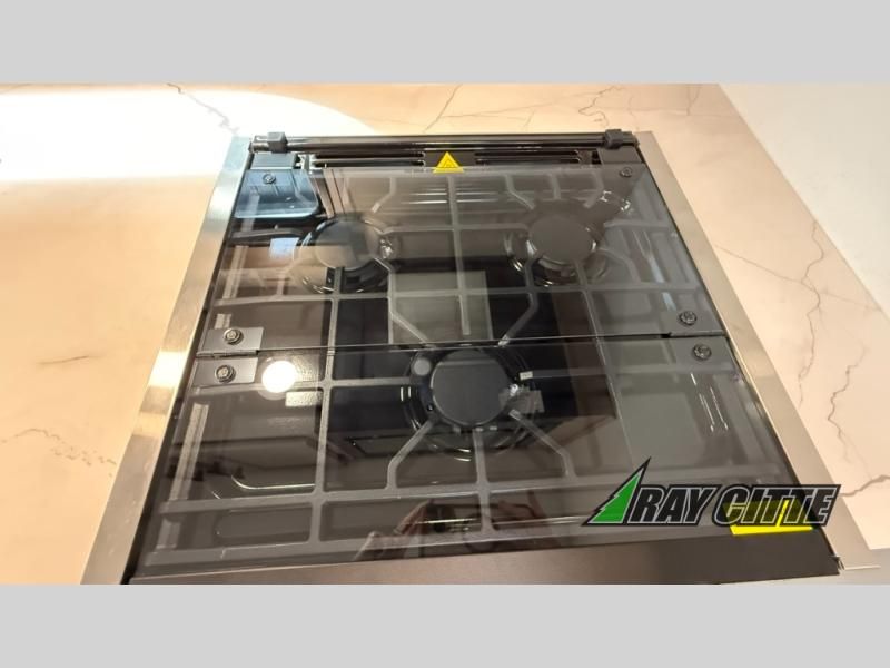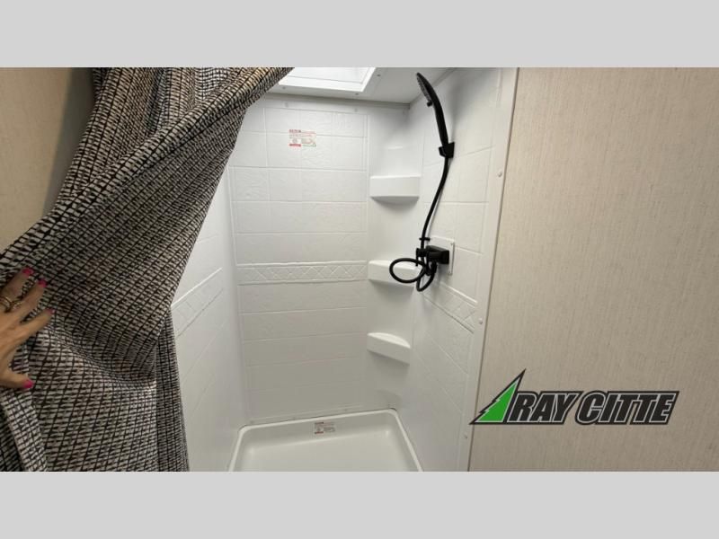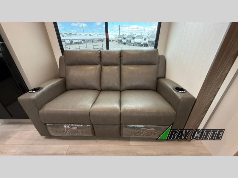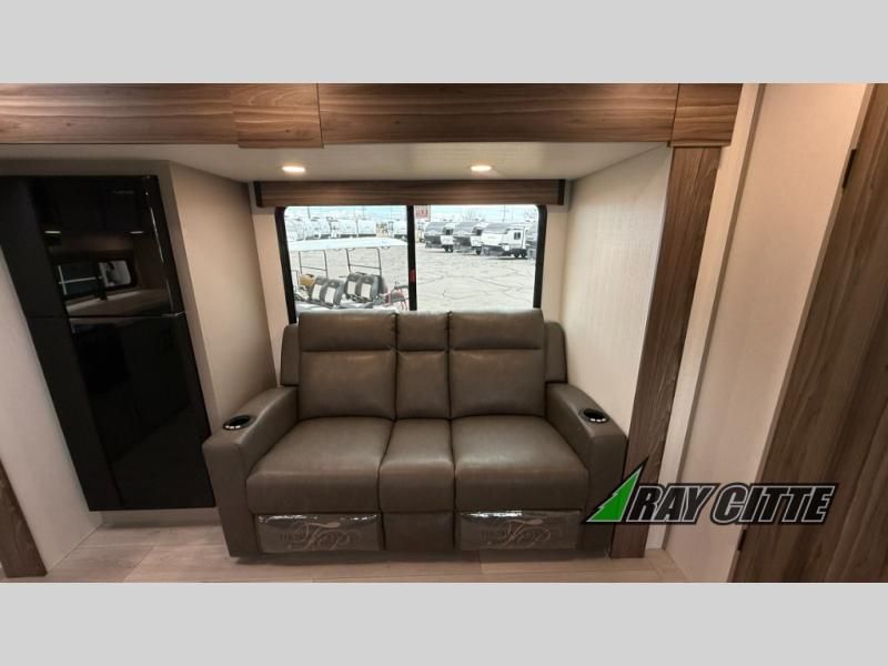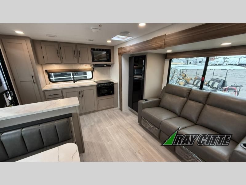 The spacious rear kitchen is equipped with a pantry for ample storage, a three-burner cooktop for culinary creativity, a refrigerator, and a cozy booth dinette for meals or socializing. This unit also has a hutch for additional storage and display. You can unwind in the plush theater seating, organize all of your footwear in the convenient shoe storage. Further, you can relax and refresh after a long day of adventures in the walk-through bath, which provides easy access and convenience, and have a good night's sleep in the spacious front bedroom boasting an ample queen bed and two wardrobes to keep your favorite outfits neat. Finally, head outside and create unforgettable memories under the protection of the exterior power awning.
