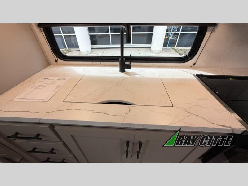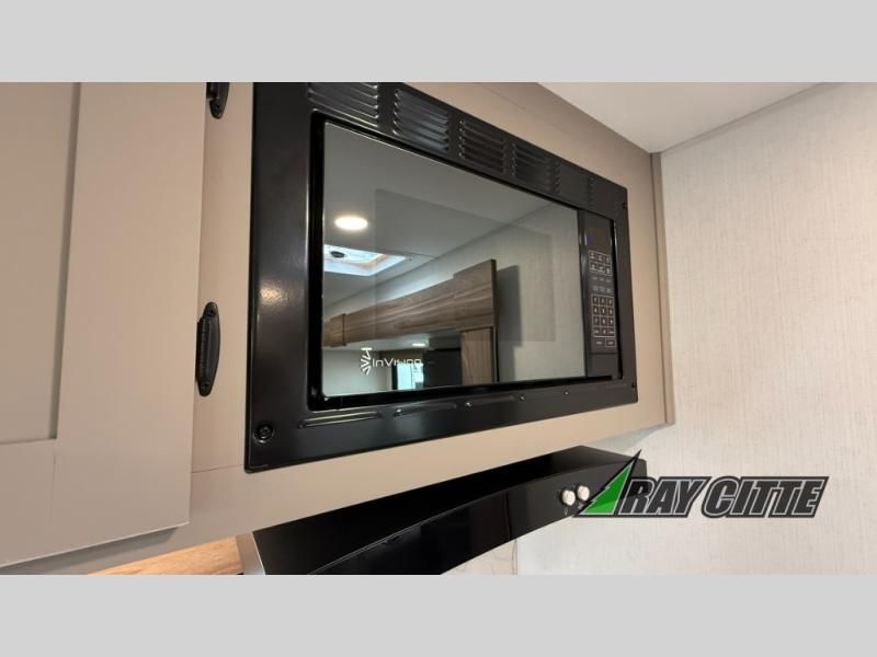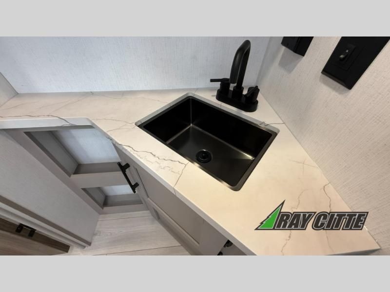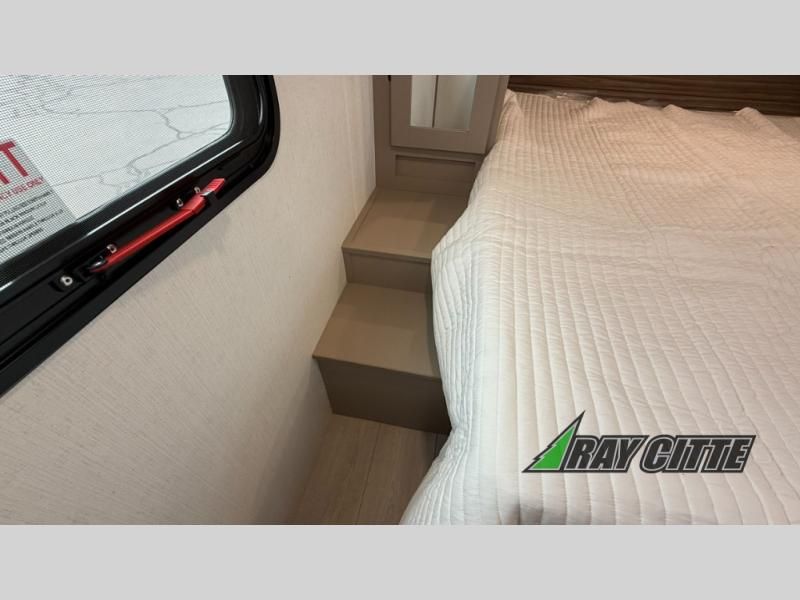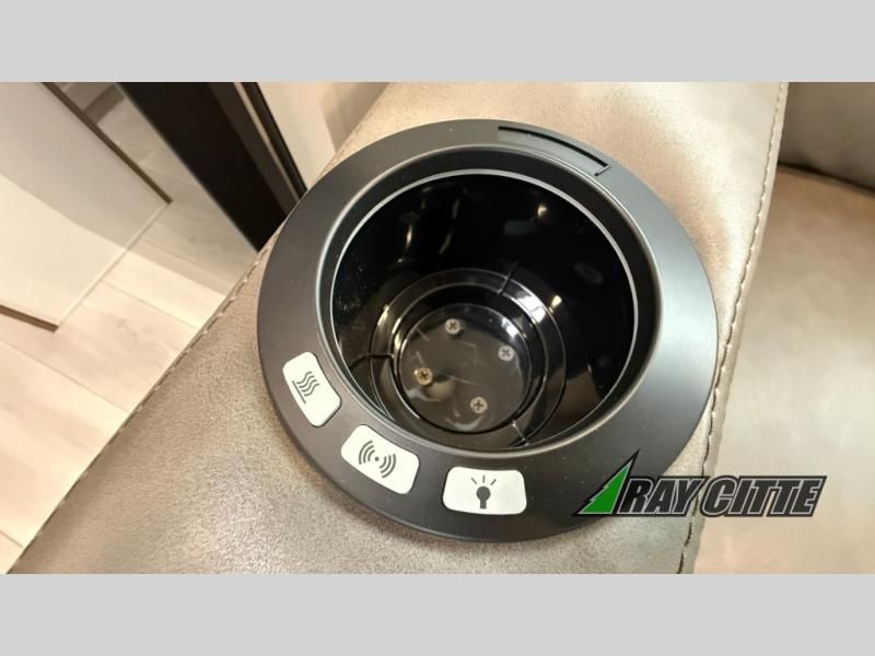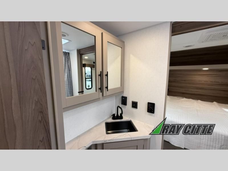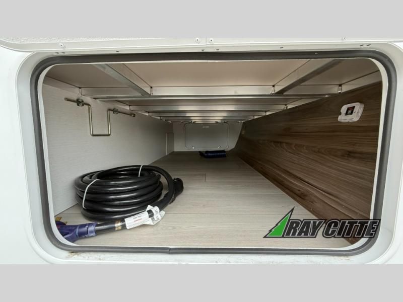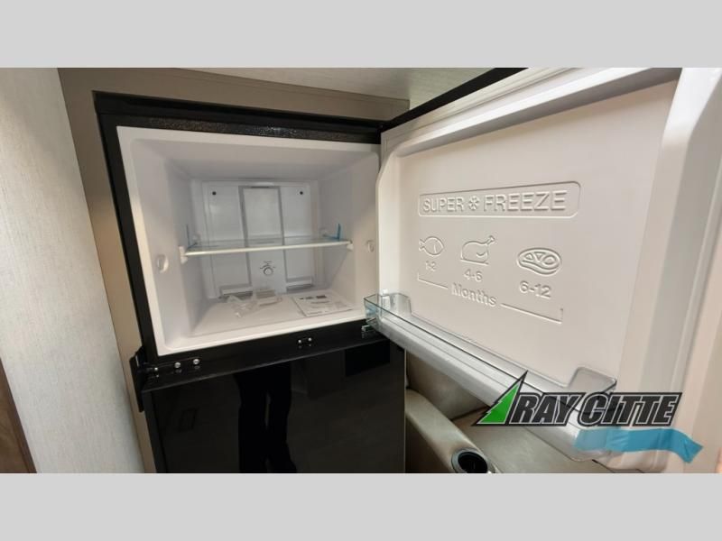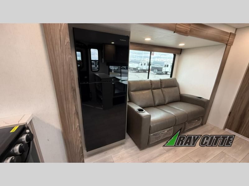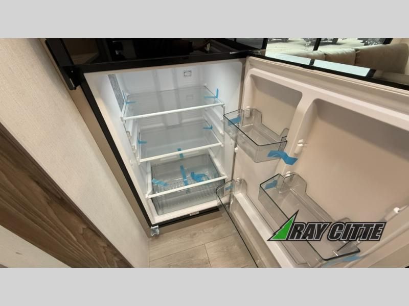 The spacious rear kitchen is equipped with a pantry for ample storage, a three-burner cooktop for culinary creativity, a refrigerator, and a cozy booth dinette for meals or socializing. This unit also has a hutch for additional storage and display. You can unwind in the plush theater seating, organize all of your footwear in the convenient shoe storage. Further, you can relax and refresh after a long day of adventures in the walk-through bath, which provides easy access and convenience, and have a good night's sleep in the spacious front bedroom boasting an ample queen bed and two wardrobes to keep your favorite outfits neat. Finally, head outside and create unforgettable memories under the protection of the exterior power awning.