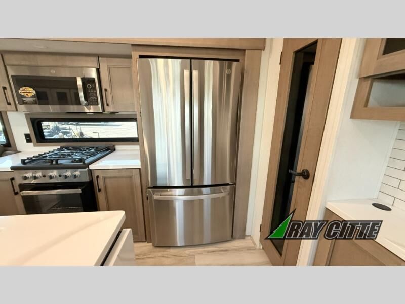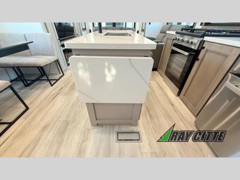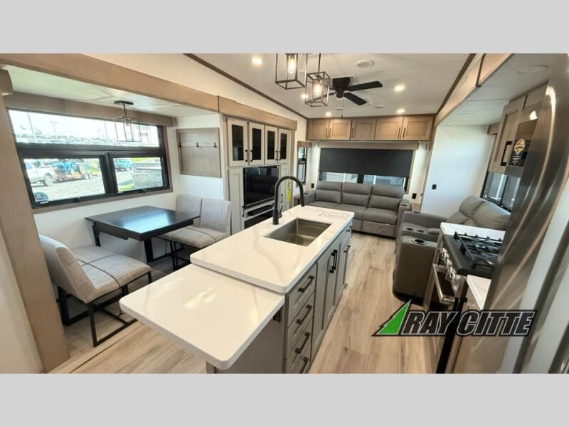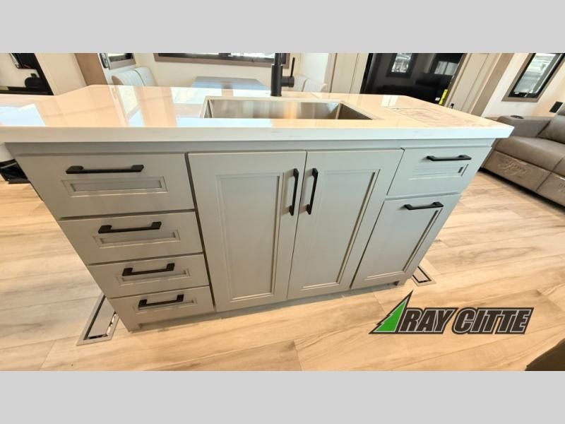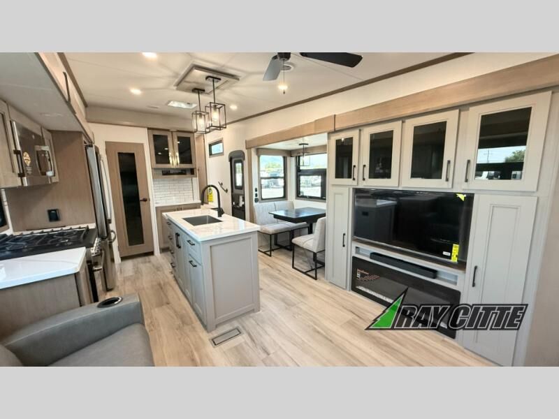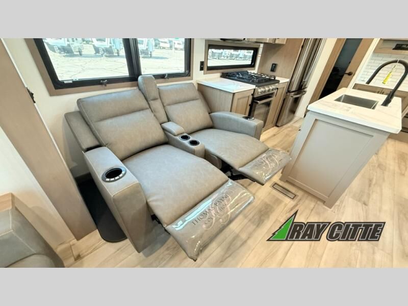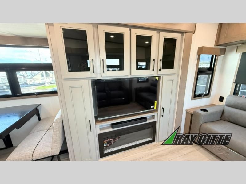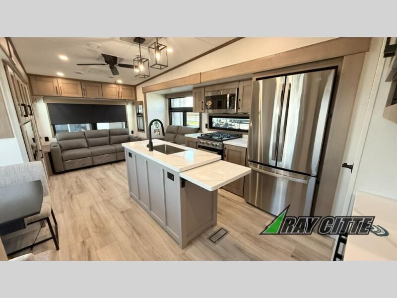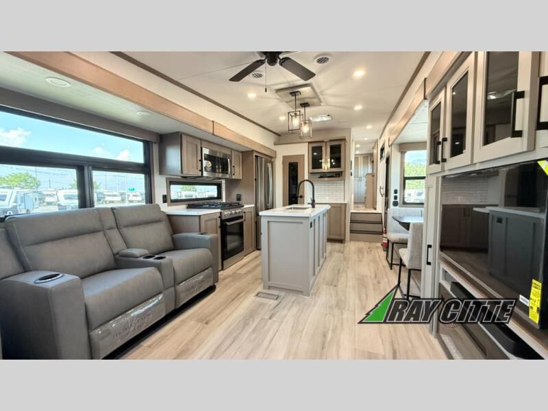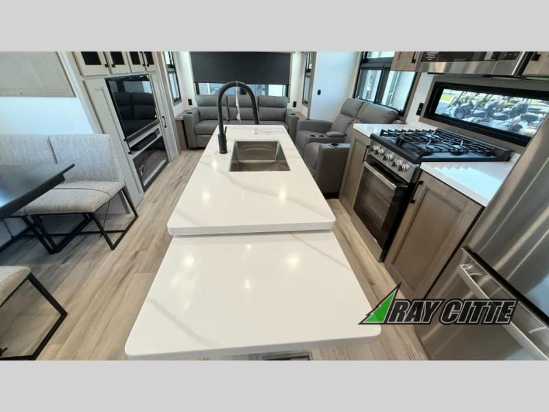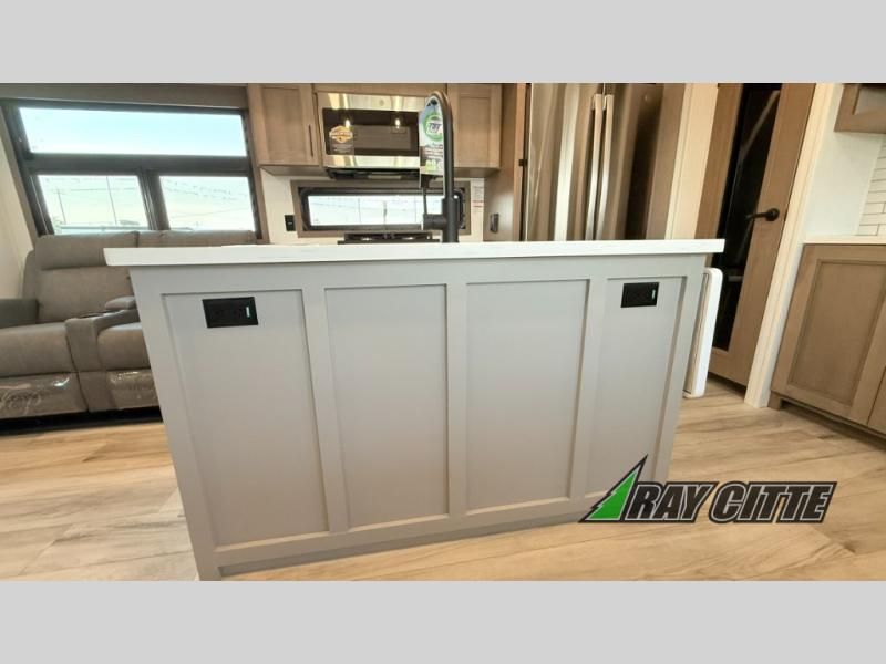 Start camping in luxury with this fifth wheel! The front private bedroom has a king bed slide which can be switched for an optional queen instead, a dresser, and a front wardrobe with washer and dryer prep. Start each morning feeling clean and fresh after showering in the 48" x 30" residential shower with a seat in the full bathroom. The kitchen has an island ideal for enjoying your morning coffee while reading the newspaper and socializing with the chef whipping up some scrambled eggs on the four burner range. The hutch can store your dishes, the pantry can store your canned goods, and the 18 cu. ft. refrigerator will keep your perishables fresh. If mother nature is raining on your parade then read a book on the rear hide-a-bed sofa or relax in the theater seating which has USB charging. And the entertainment center with a fireplace and 43" smart LED TV will keep you entertained!