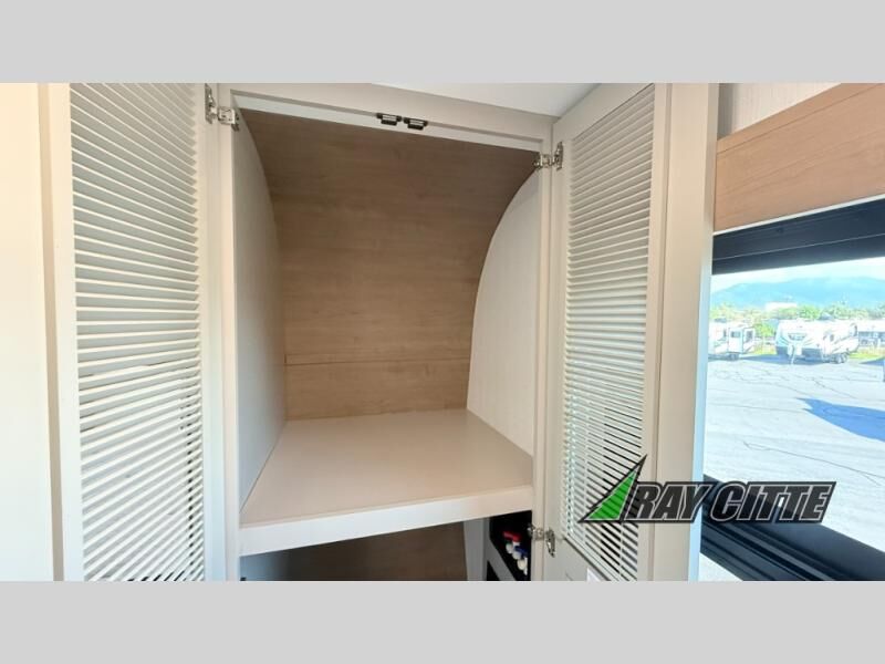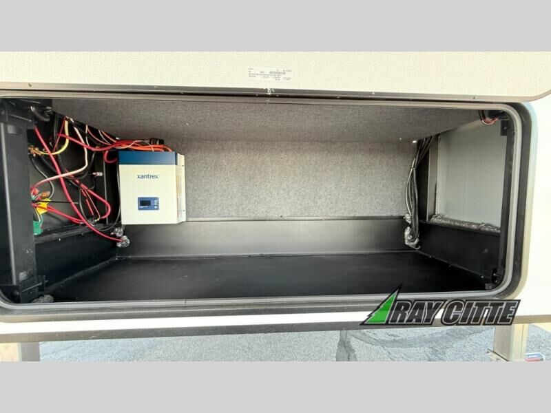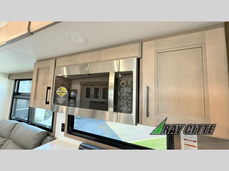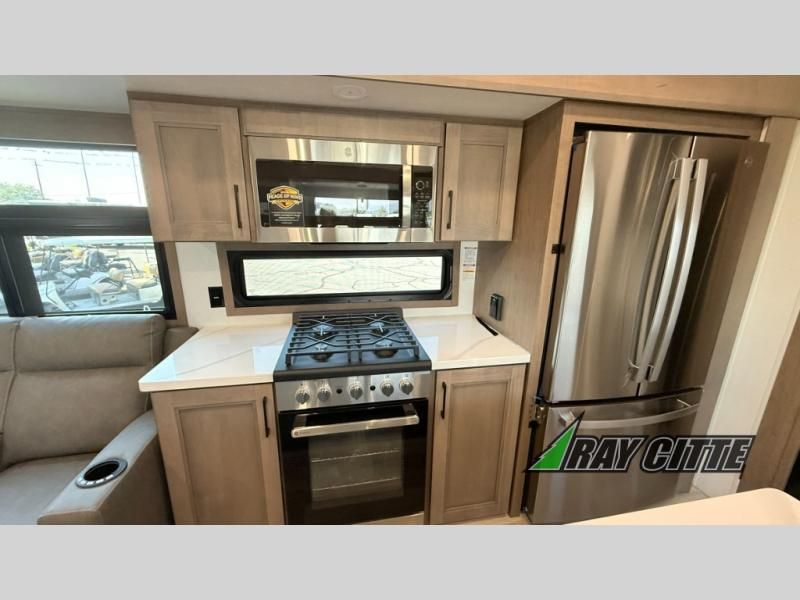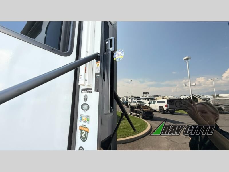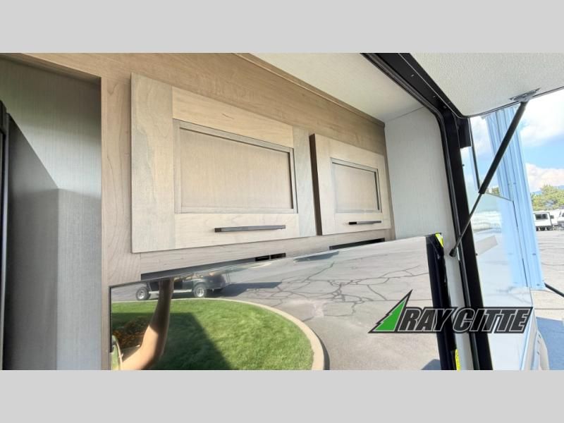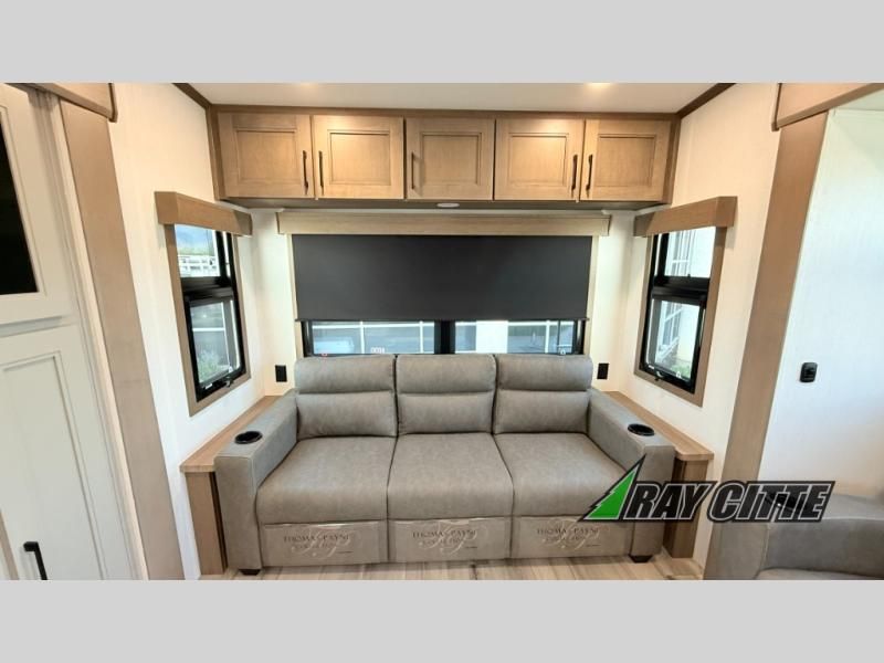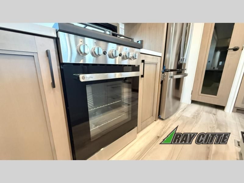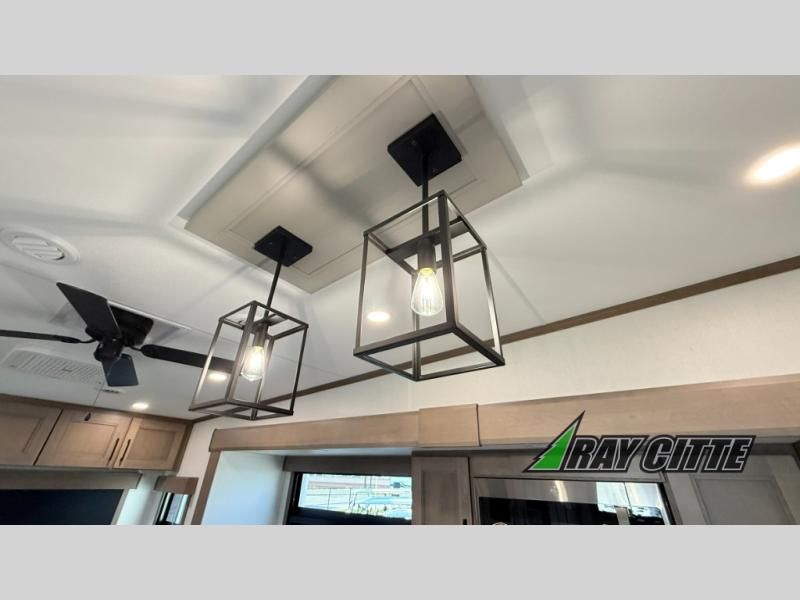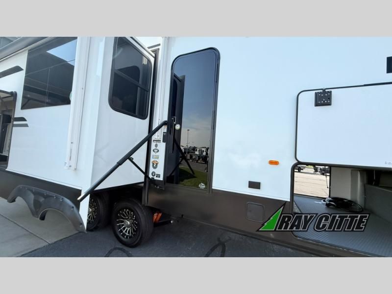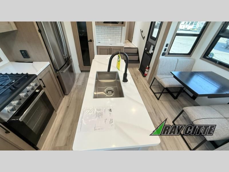 Start camping in luxury with this fifth wheel! The front private bedroom has a king bed slide which can be switched for an optional queen instead, a dresser, and a front wardrobe with washer and dryer prep. Start each morning feeling clean and fresh after showering in the 48" x 30" residential shower with a seat in the full bathroom. The kitchen has an island ideal for enjoying your morning coffee while reading the newspaper and socializing with the chef whipping up some scrambled eggs on the four burner range. The hutch can store your dishes, the pantry can store your canned goods, and the 18 cu. ft. refrigerator will keep your perishables fresh. If mother nature is raining on your parade then read a book on the rear hide-a-bed sofa or relax in the theater seating which has USB charging. And the entertainment center with a fireplace and 43" smart LED TV will keep you entertained!