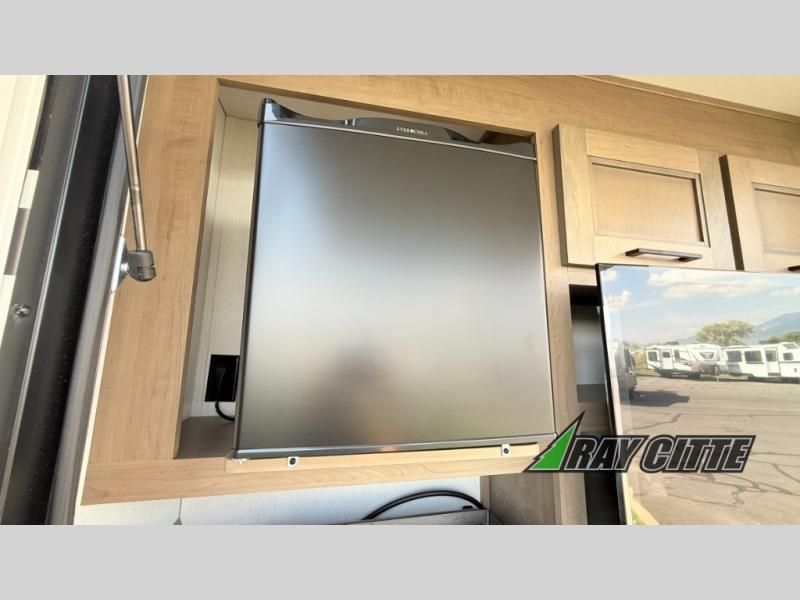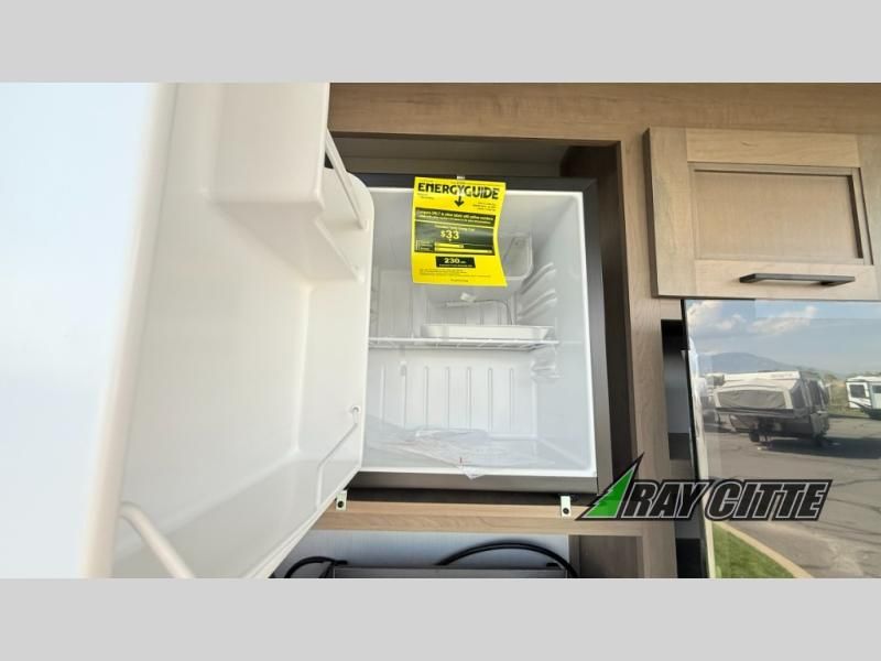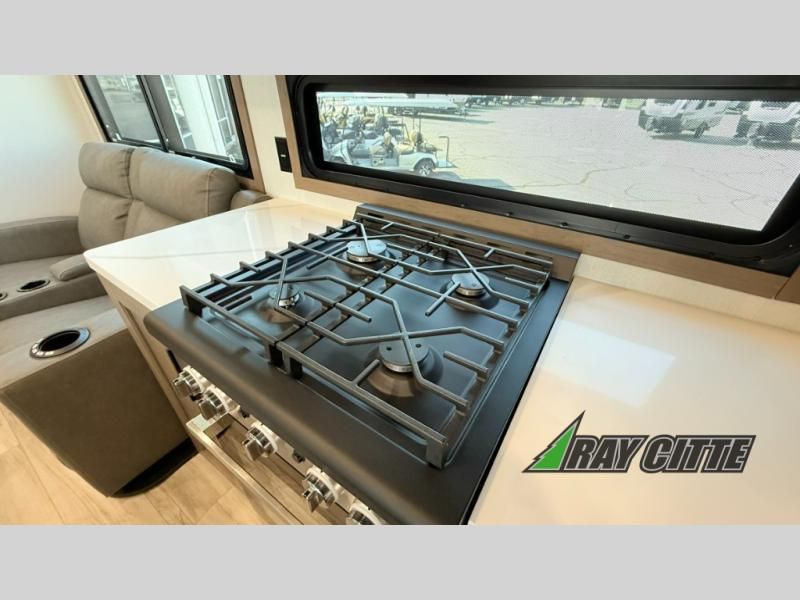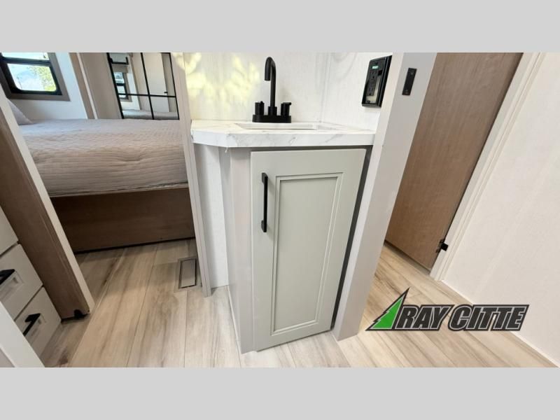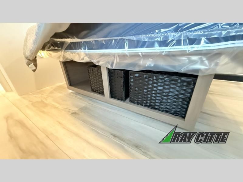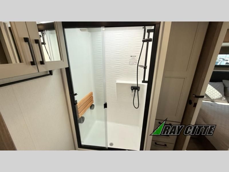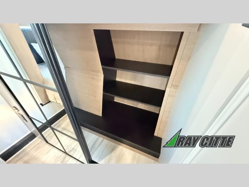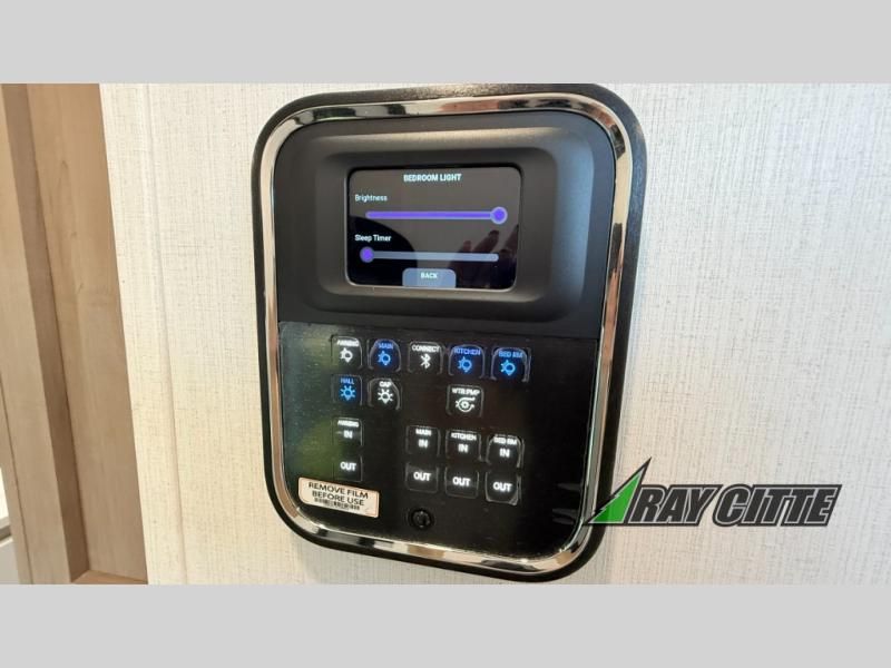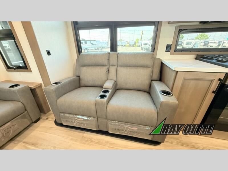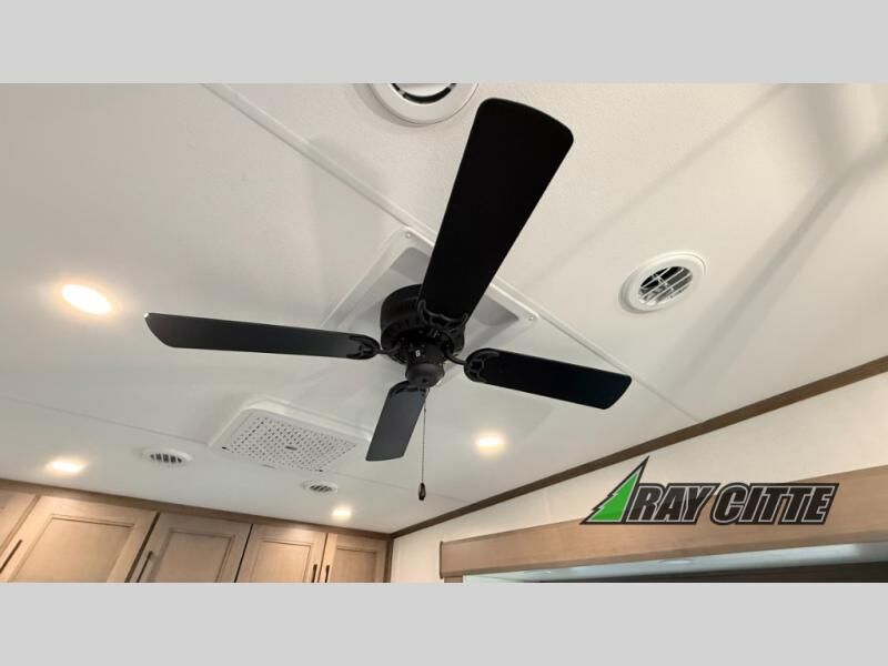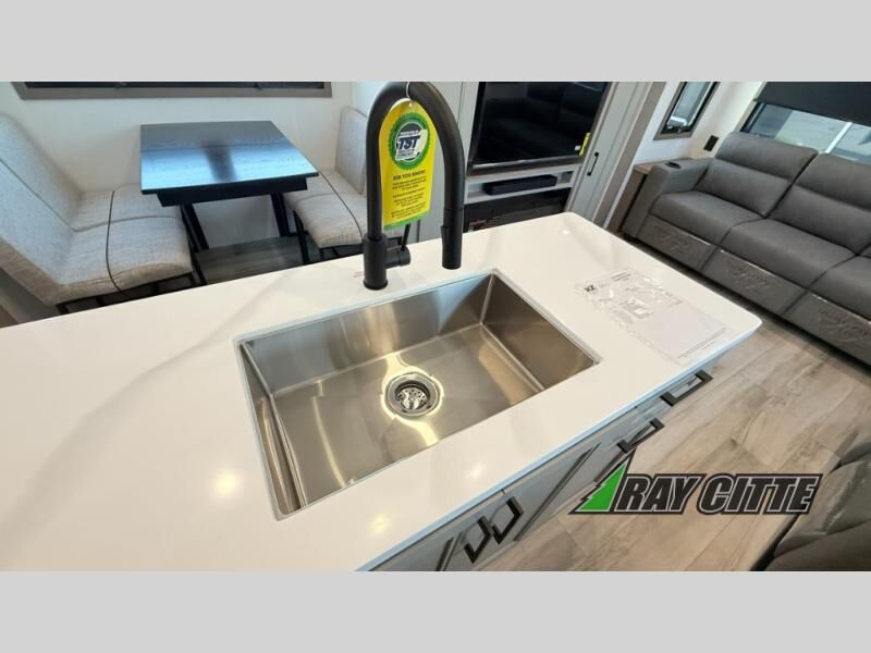 Start camping in luxury with this fifth wheel! The front private bedroom has a king bed slide which can be switched for an optional queen instead, a dresser, and a front wardrobe with washer and dryer prep. Start each morning feeling clean and fresh after showering in the 48" x 30" residential shower with a seat in the full bathroom. The kitchen has an island ideal for enjoying your morning coffee while reading the newspaper and socializing with the chef whipping up some scrambled eggs on the four burner range. The hutch can store your dishes, the pantry can store your canned goods, and the 18 cu. ft. refrigerator will keep your perishables fresh. If mother nature is raining on your parade then read a book on the rear hide-a-bed sofa or relax in the theater seating which has USB charging. And the entertainment center with a fireplace and 43" smart LED TV will keep you entertained!