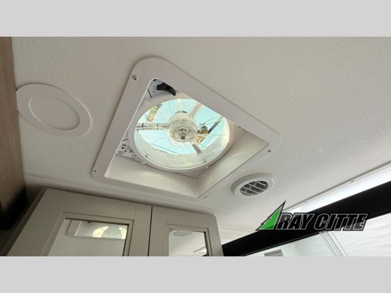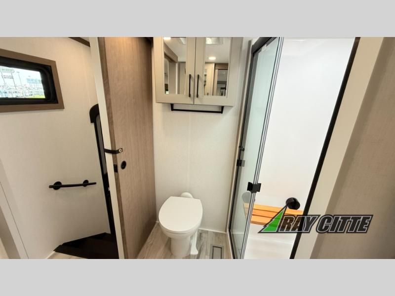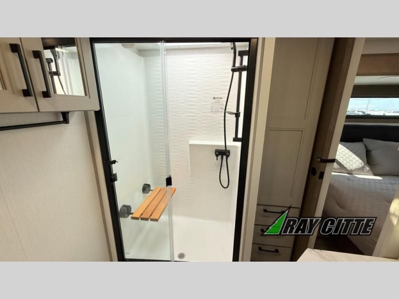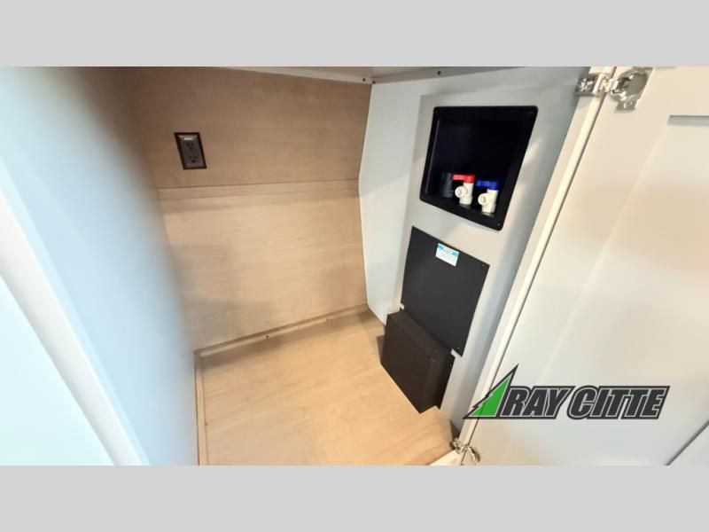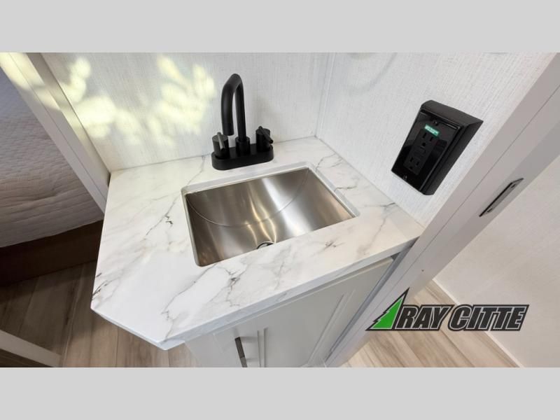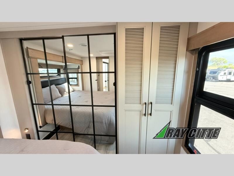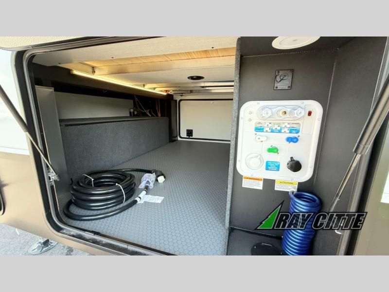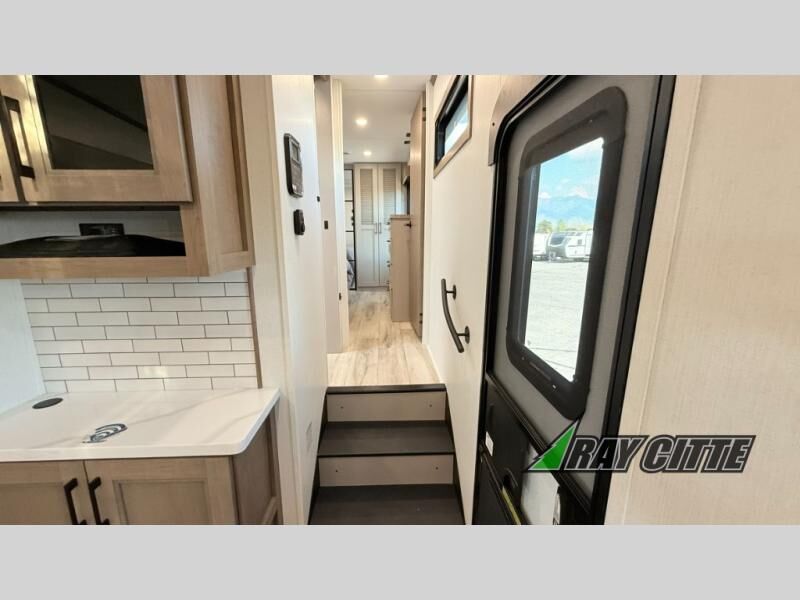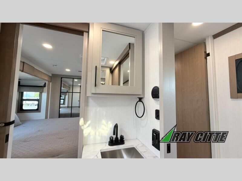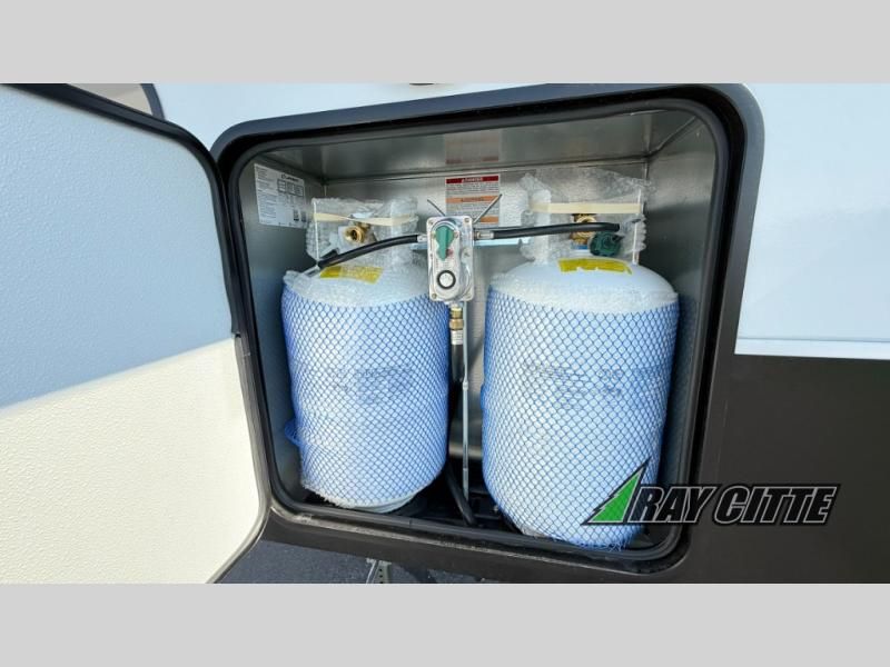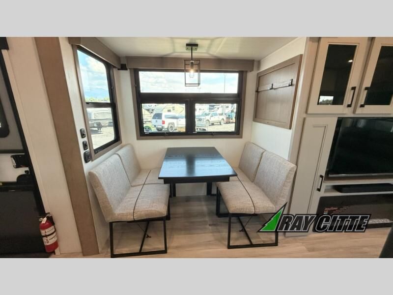 Start camping in luxury with this fifth wheel! The front private bedroom has a king bed slide which can be switched for an optional queen instead, a dresser, and a front wardrobe with washer and dryer prep. Start each morning feeling clean and fresh after showering in the 48" x 30" residential shower with a seat in the full bathroom. The kitchen has an island ideal for enjoying your morning coffee while reading the newspaper and socializing with the chef whipping up some scrambled eggs on the four burner range. The hutch can store your dishes, the pantry can store your canned goods, and the 18 cu. ft. refrigerator will keep your perishables fresh. If mother nature is raining on your parade then read a book on the rear hide-a-bed sofa or relax in the theater seating which has USB charging. And the entertainment center with a fireplace and 43" smart LED TV will keep you entertained!