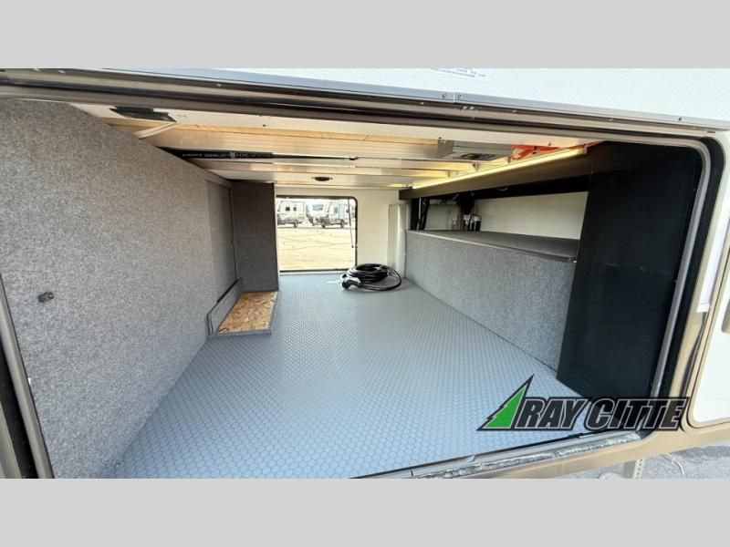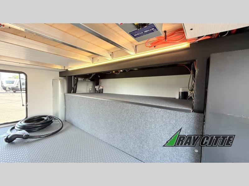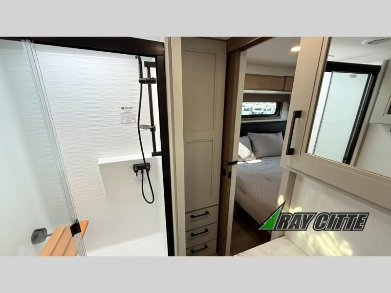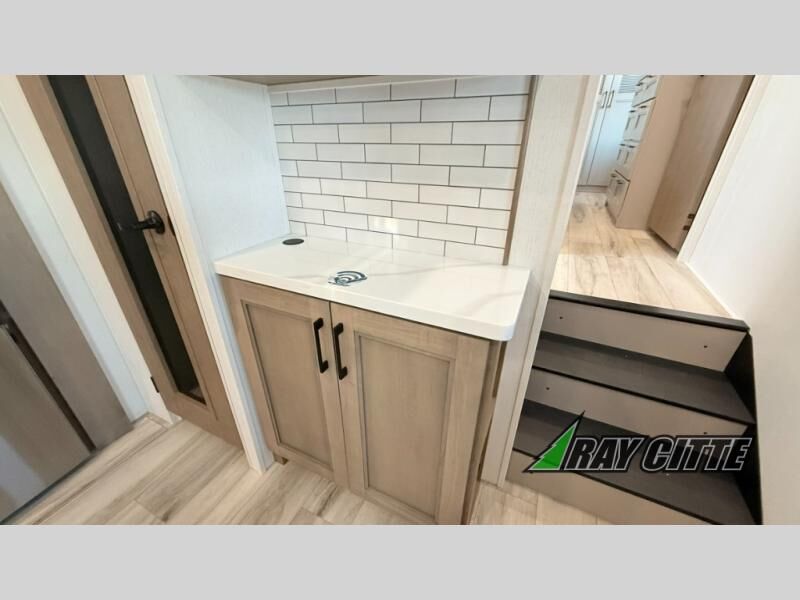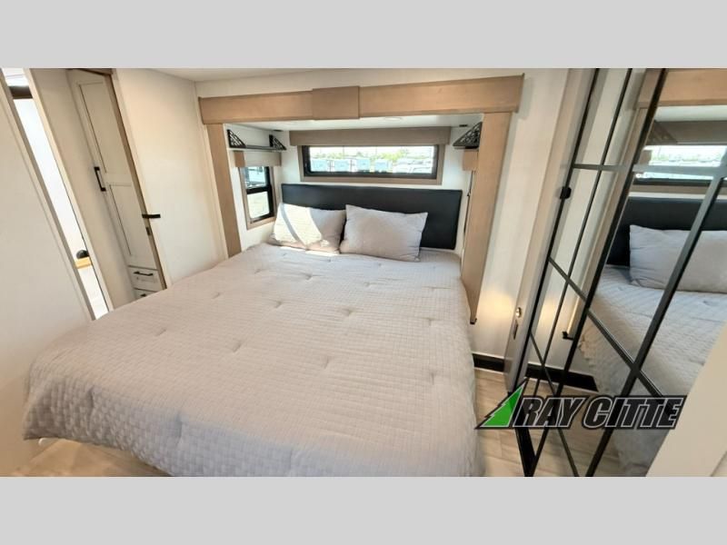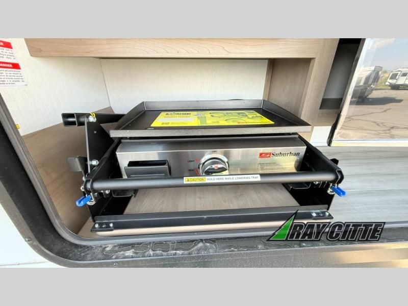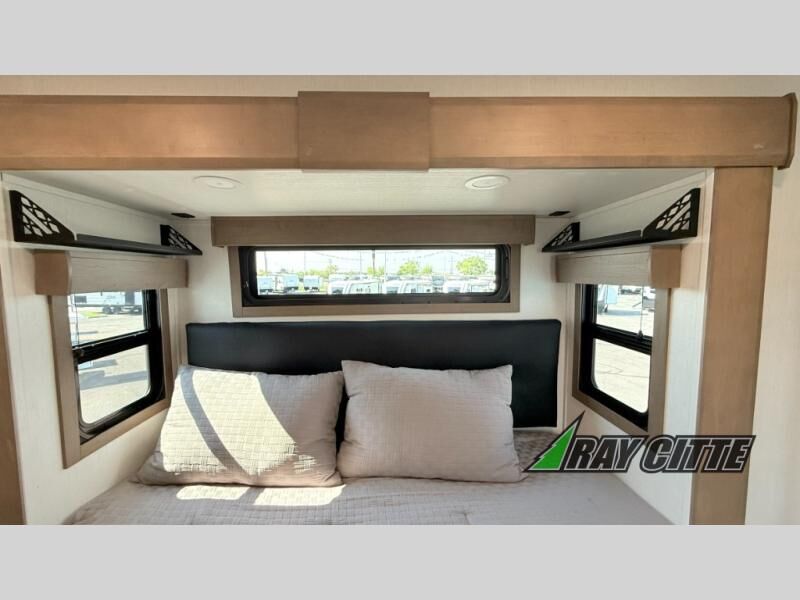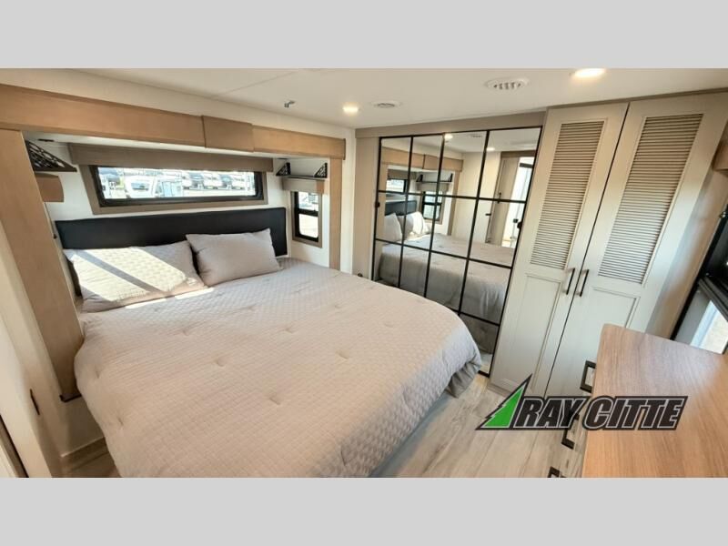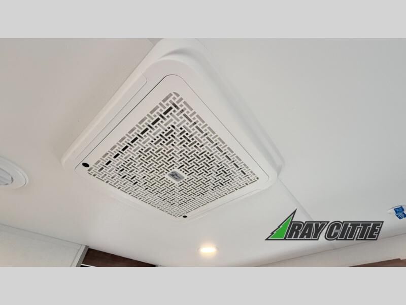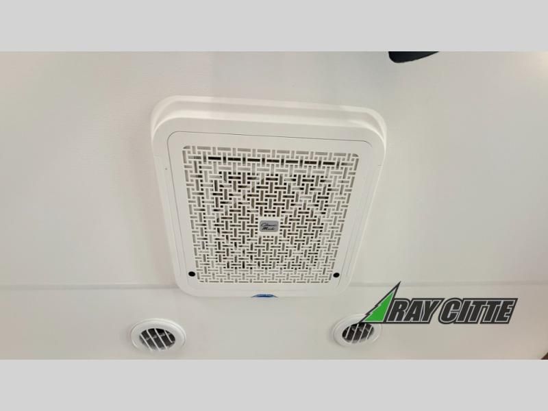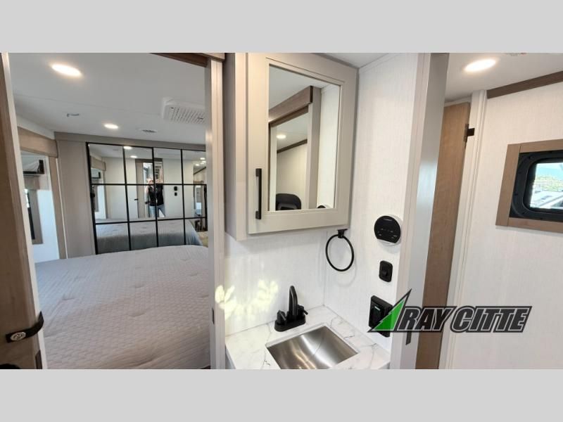 Start camping in luxury with this fifth wheel! The front private bedroom has a king bed slide which can be switched for an optional queen instead, a dresser, and a front wardrobe with washer and dryer prep. Start each morning feeling clean and fresh after showering in the 48" x 30" residential shower with a seat in the full bathroom. The kitchen has an island ideal for enjoying your morning coffee while reading the newspaper and socializing with the chef whipping up some scrambled eggs on the four burner range. The hutch can store your dishes, the pantry can store your canned goods, and the 18 cu. ft. refrigerator will keep your perishables fresh. If mother nature is raining on your parade then read a book on the rear hide-a-bed sofa or relax in the theater seating which has USB charging. And the entertainment center with a fireplace and 43" smart LED TV will keep you entertained!