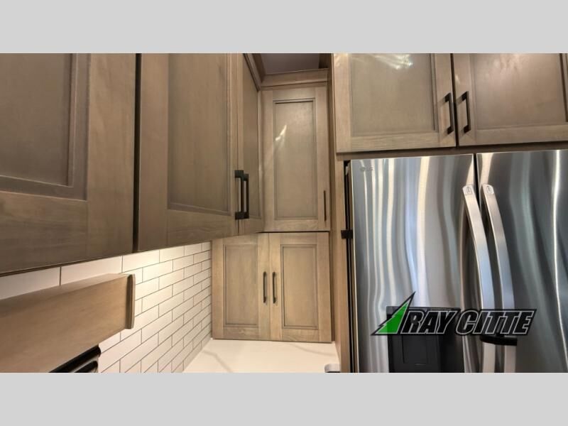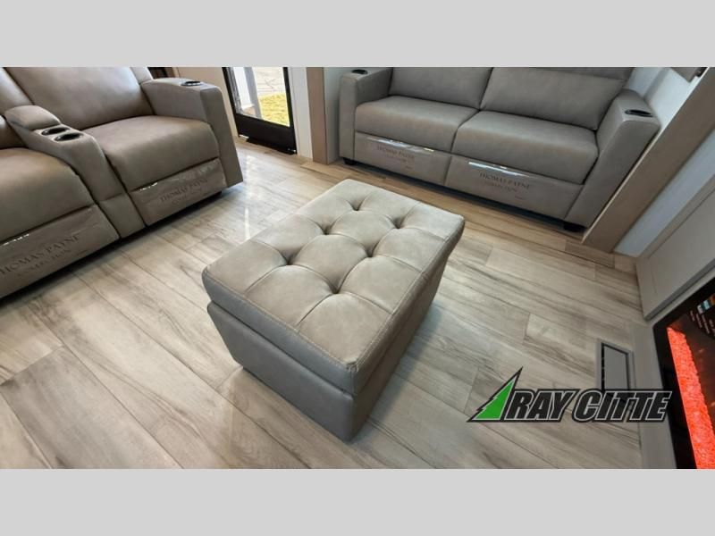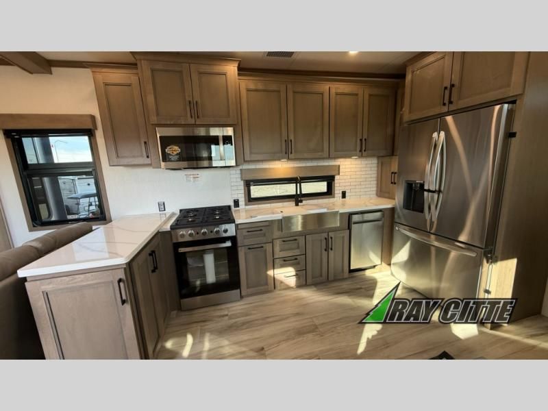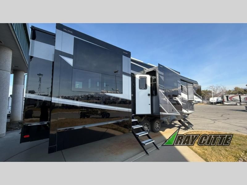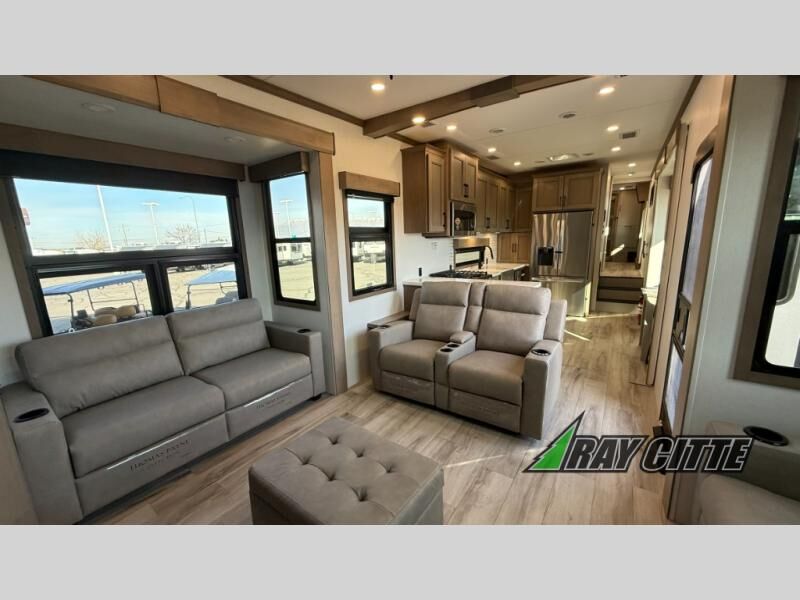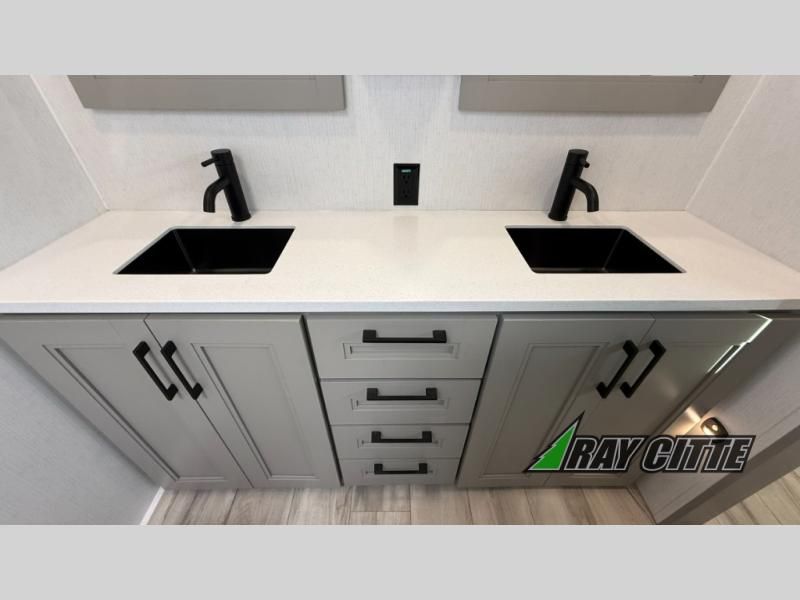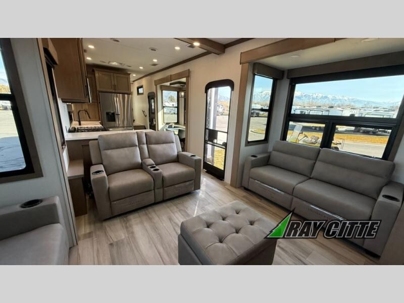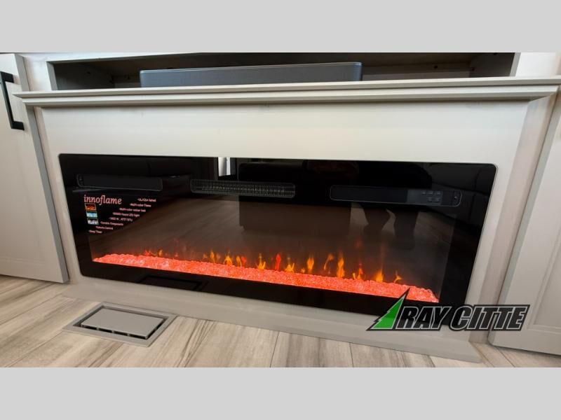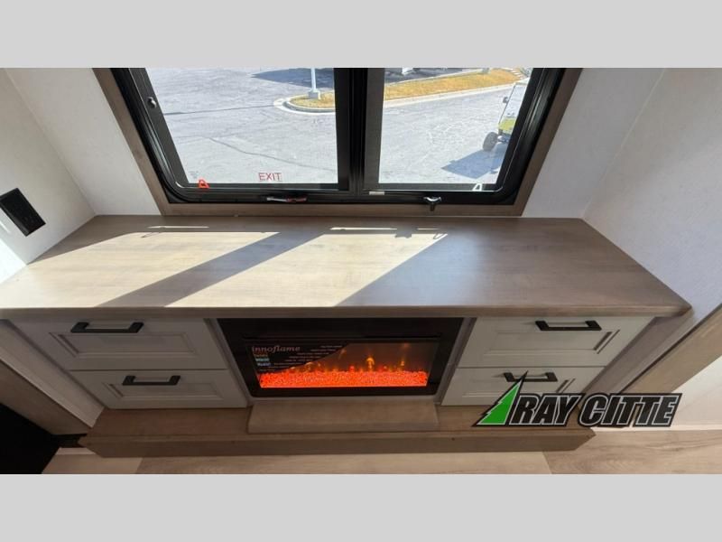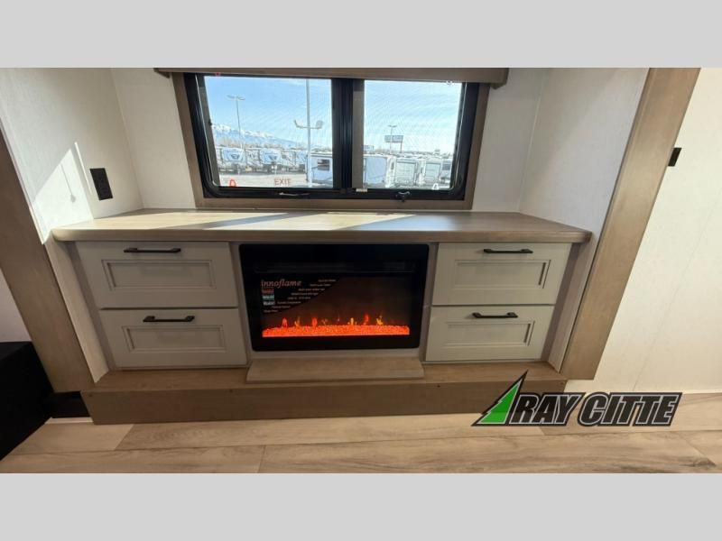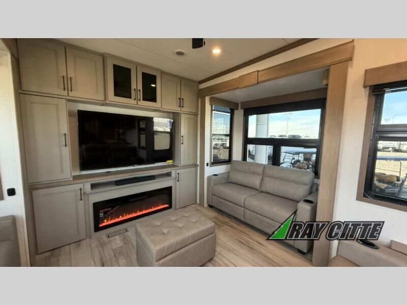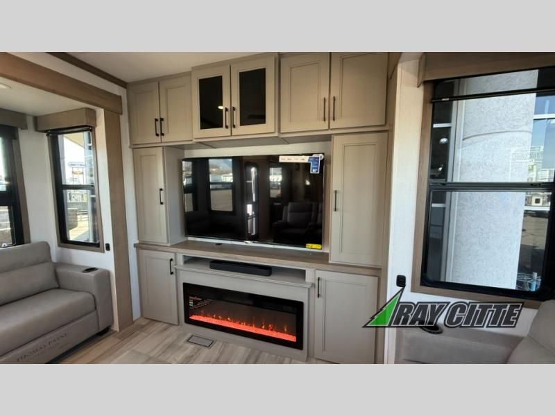 Experience the pinnacle of luxury fifth-wheel living! Retreat to the serene bedroom, featuring an electric tilt king bed with drawers under the bed, a spacious wardrobe, and washer/dryer prep. Enjoy entertainment on the 39” Smart LED TV and ample storage in the dresser. The gourmet kitchen is equipped with a pantry, 26 cu. refrigerator, convection microwave, and sliding table/desk for effortless dining and work-from-home convenience. The living room is a haven of relaxation, boasting a stunning 65” Smart LED TV, warm fireplace, theater seating, and double hide-a-bed sofas ideal for hosting guests with ease. Unwind in style in the full bathroom, featuring a dual sink vanity and ample storage. Also, enjoy the convenience of two entry/two exit doors. This fifth wheel is a masterpiece of comfort, style, and functionality, perfect for full-time living.