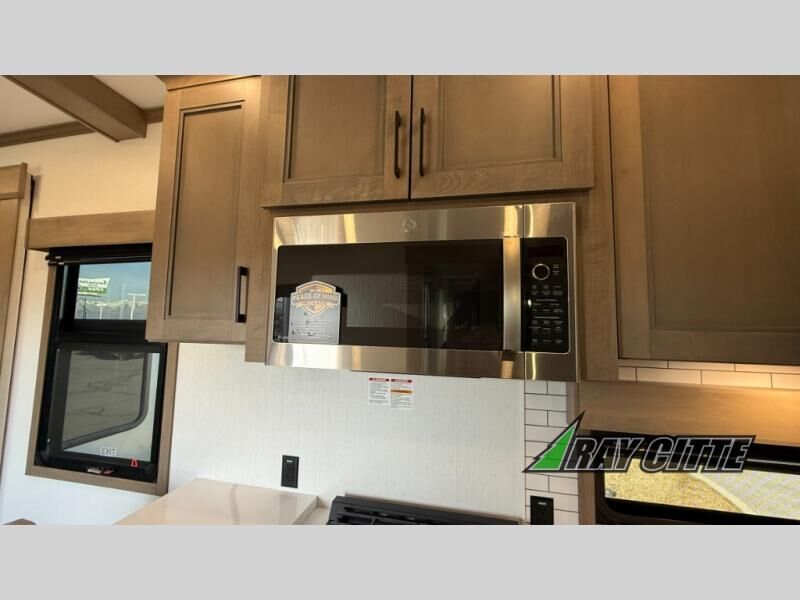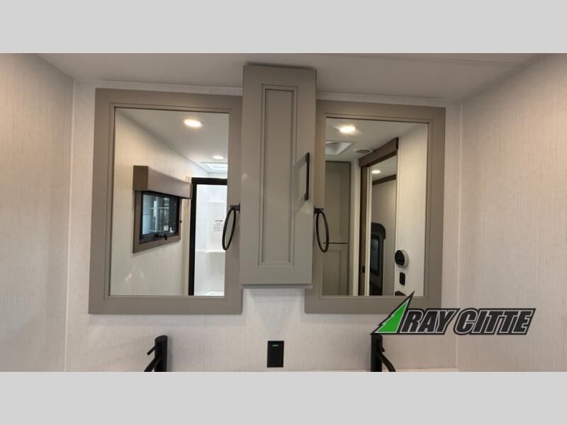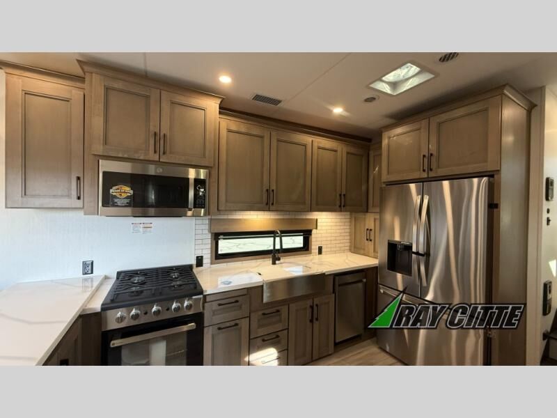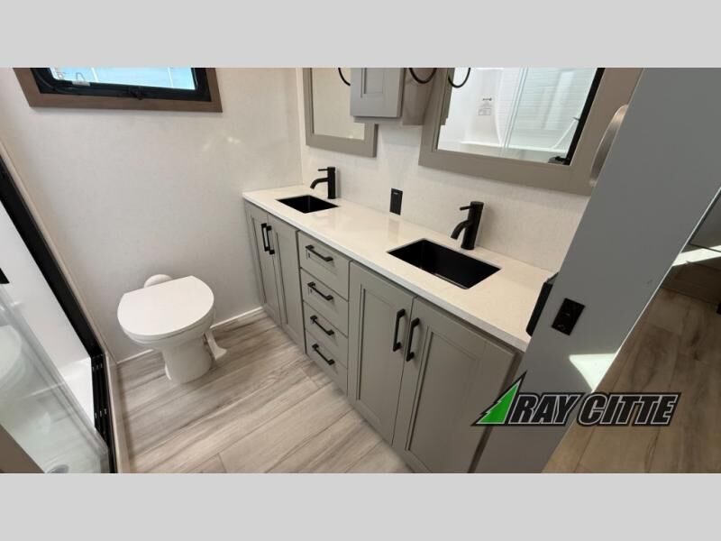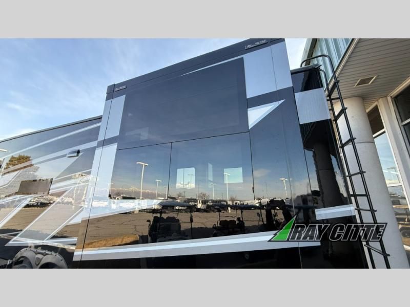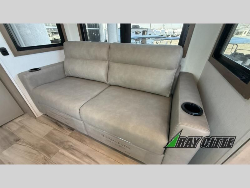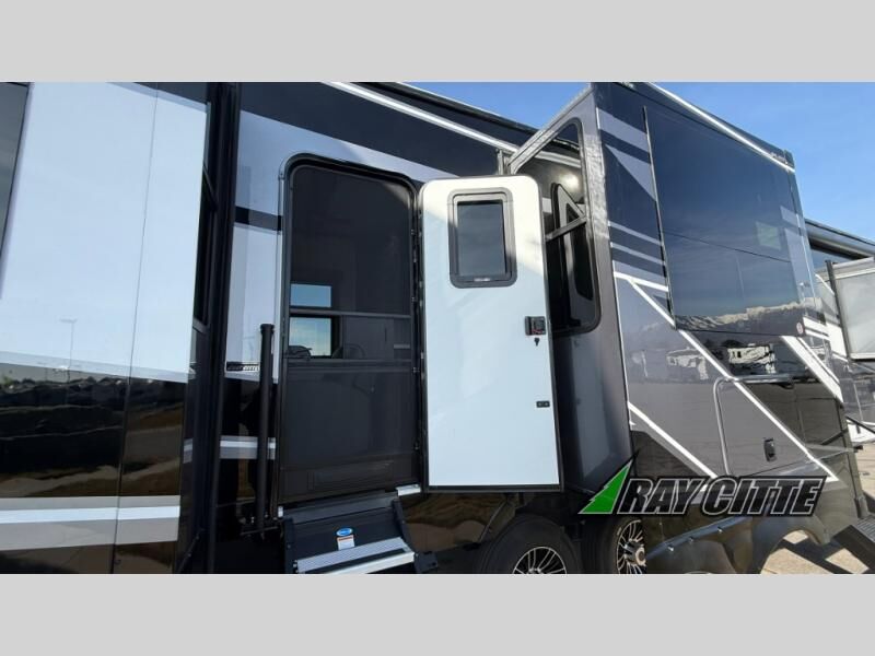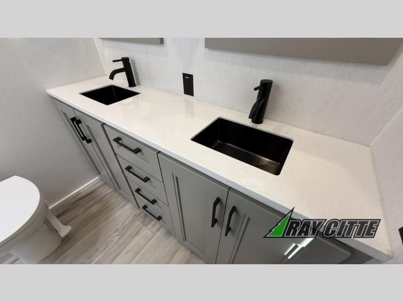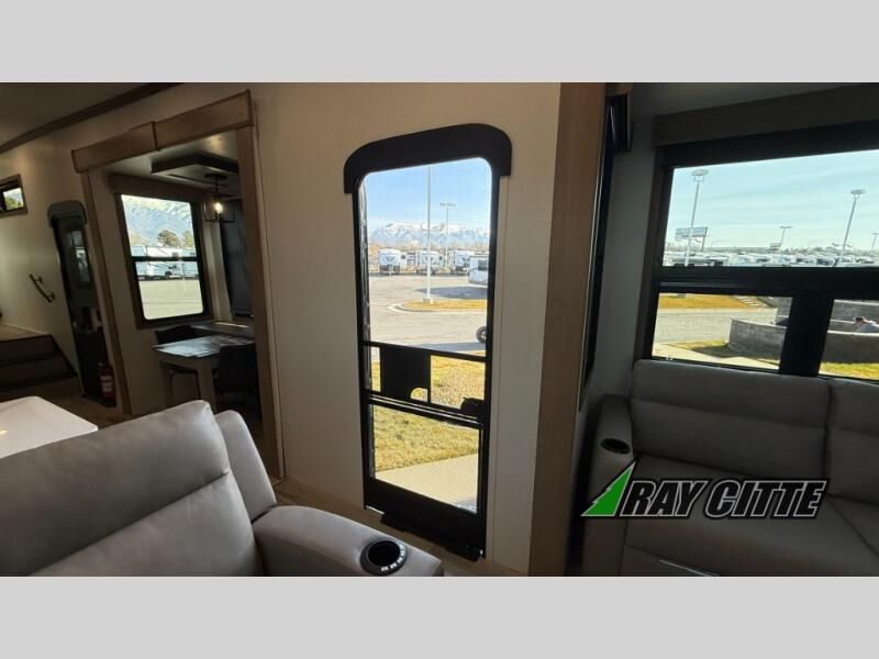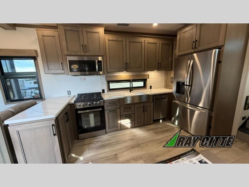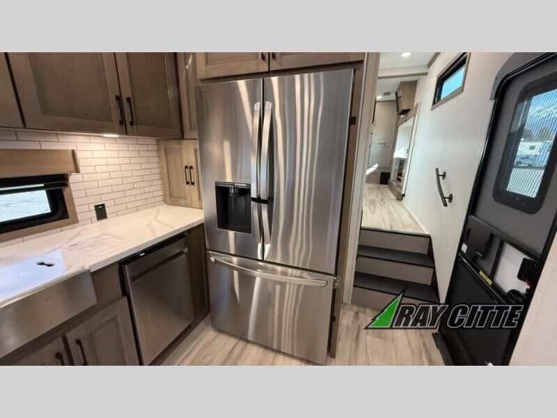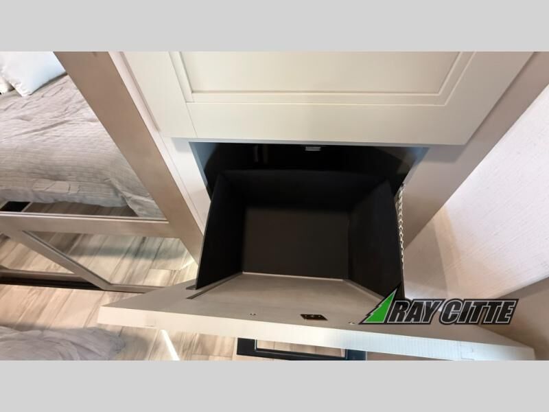 Experience the pinnacle of luxury fifth-wheel living! Retreat to the serene bedroom, featuring an electric tilt king bed with drawers under the bed, a spacious wardrobe, and washer/dryer prep. Enjoy entertainment on the 39” Smart LED TV and ample storage in the dresser. The gourmet kitchen is equipped with a pantry, 26 cu. refrigerator, convection microwave, and sliding table/desk for effortless dining and work-from-home convenience. The living room is a haven of relaxation, boasting a stunning 65” Smart LED TV, warm fireplace, theater seating, and double hide-a-bed sofas ideal for hosting guests with ease. Unwind in style in the full bathroom, featuring a dual sink vanity and ample storage. Also, enjoy the convenience of two entry/two exit doors. This fifth wheel is a masterpiece of comfort, style, and functionality, perfect for full-time living.