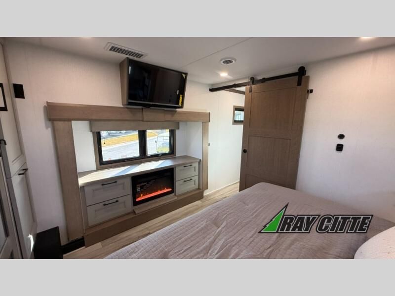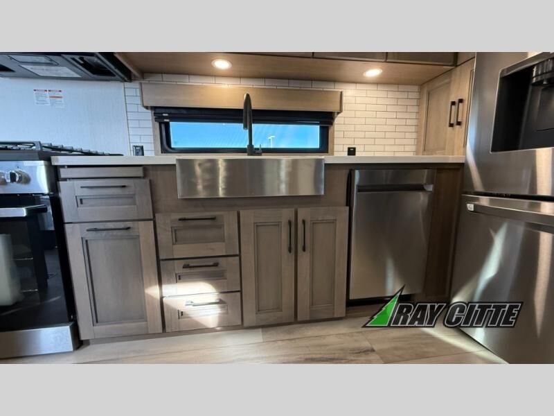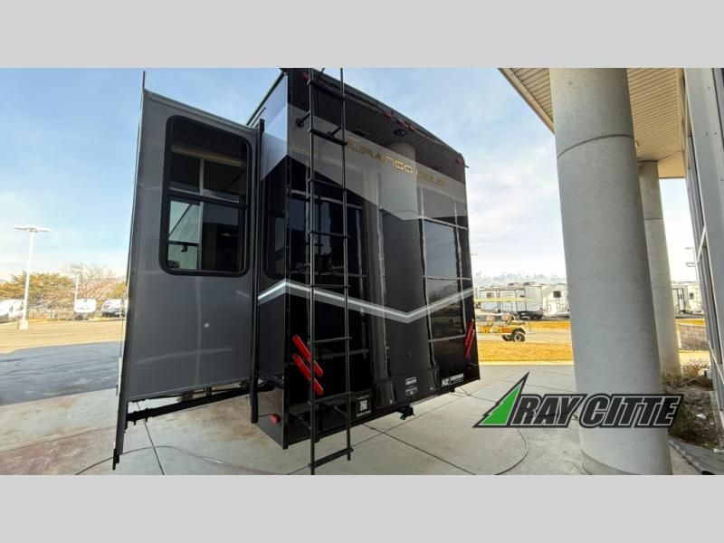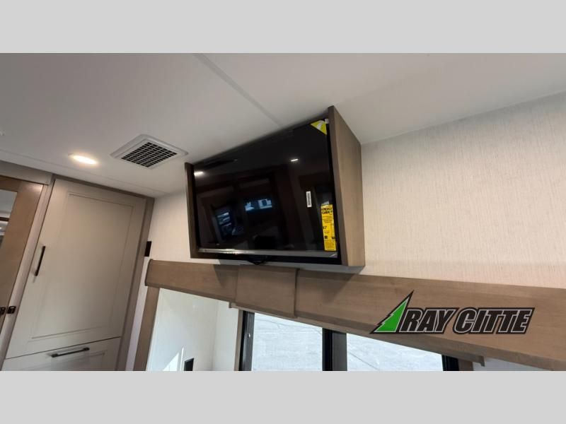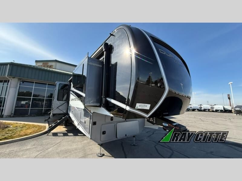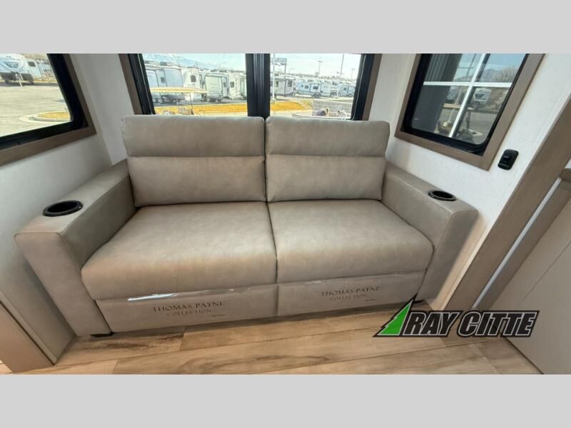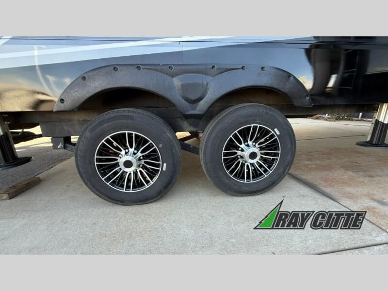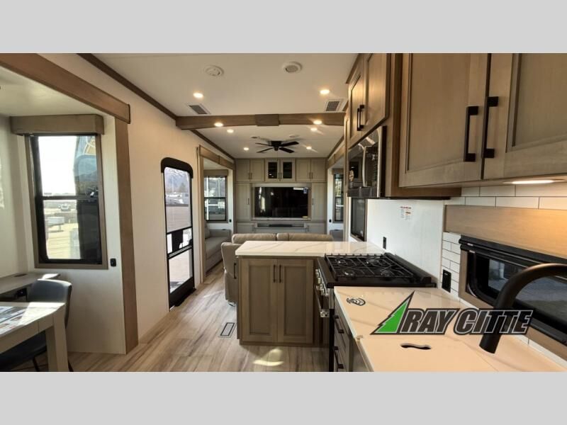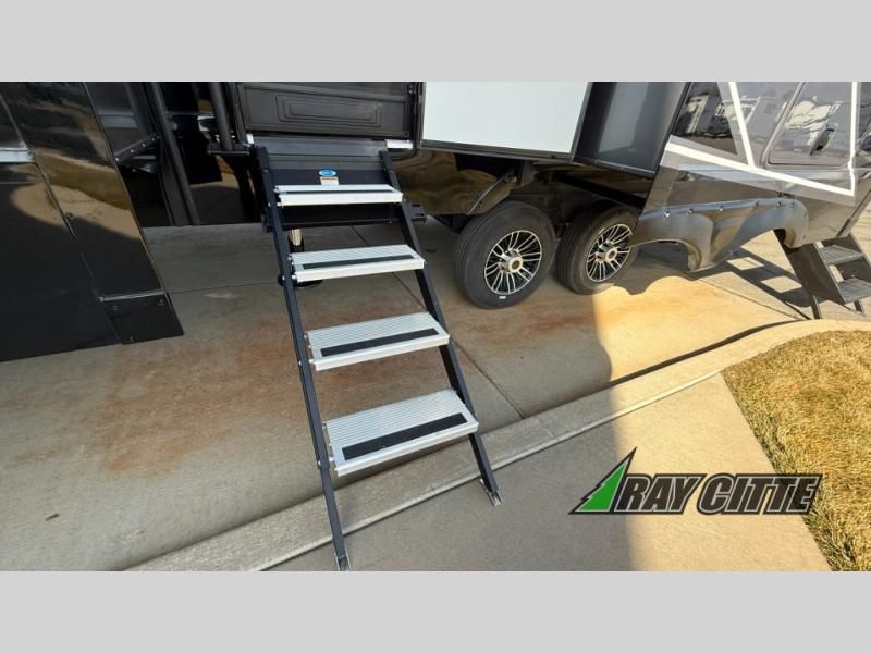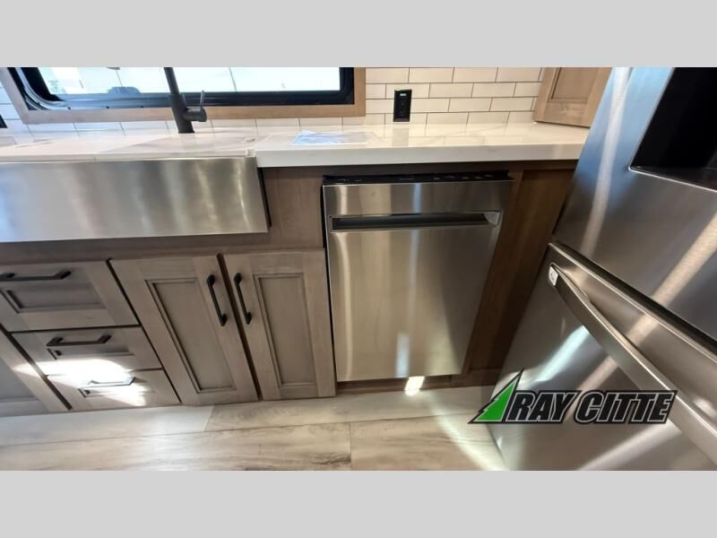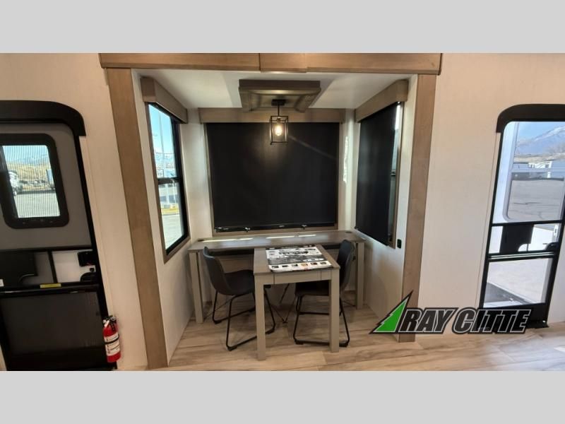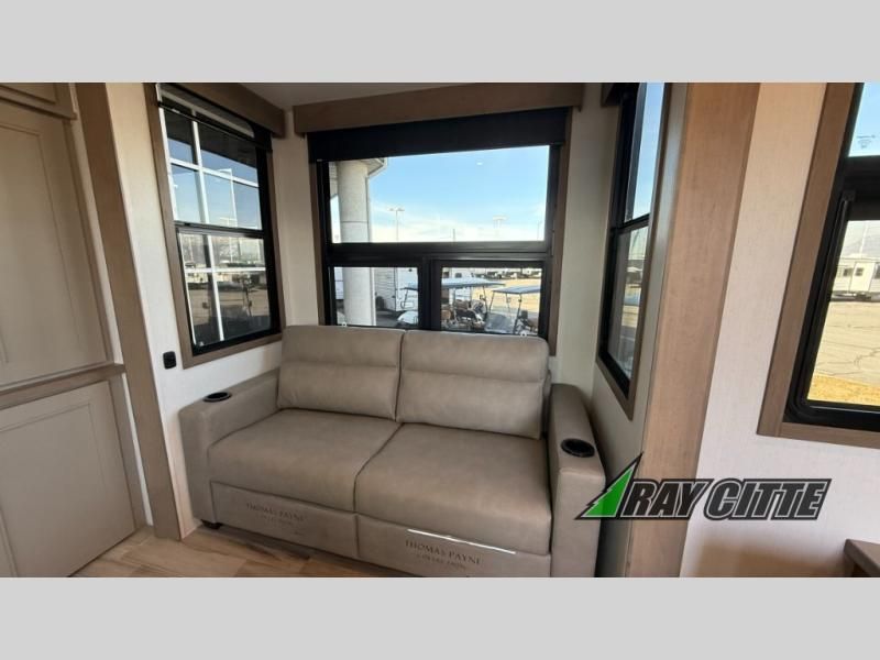 Experience the pinnacle of luxury fifth-wheel living! Retreat to the serene bedroom, featuring an electric tilt king bed with drawers under the bed, a spacious wardrobe, and washer/dryer prep. Enjoy entertainment on the 39” Smart LED TV and ample storage in the dresser. The gourmet kitchen is equipped with a pantry, 26 cu. refrigerator, convection microwave, and sliding table/desk for effortless dining and work-from-home convenience. The living room is a haven of relaxation, boasting a stunning 65” Smart LED TV, warm fireplace, theater seating, and double hide-a-bed sofas ideal for hosting guests with ease. Unwind in style in the full bathroom, featuring a dual sink vanity and ample storage. Also, enjoy the convenience of two entry/two exit doors. This fifth wheel is a masterpiece of comfort, style, and functionality, perfect for full-time living.