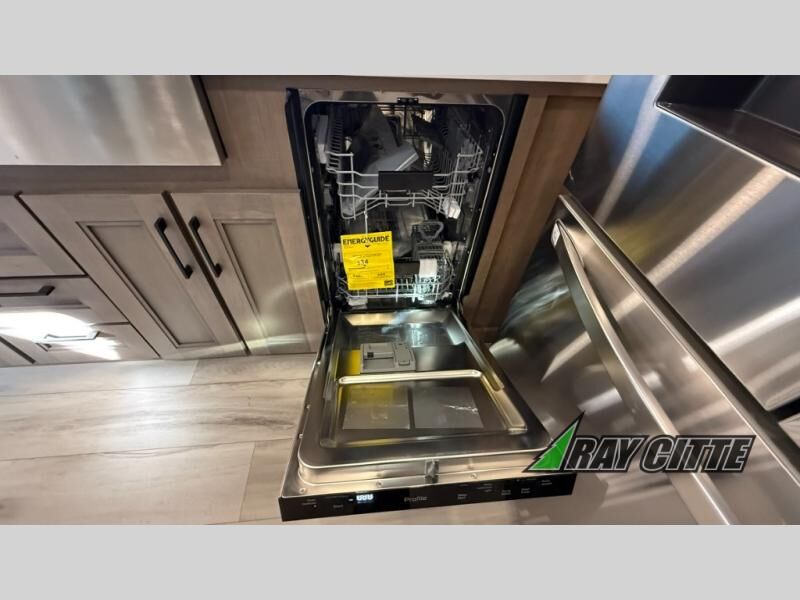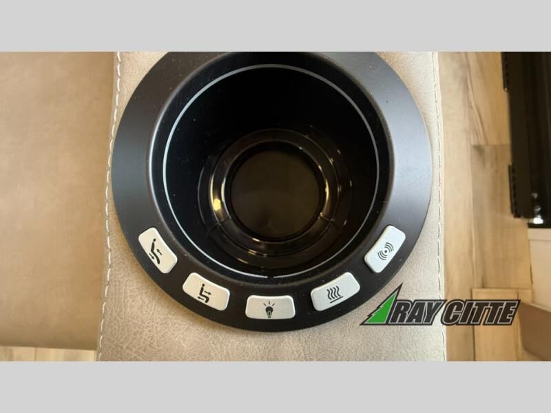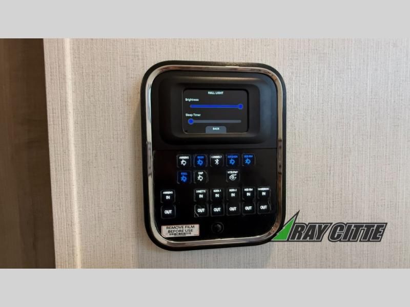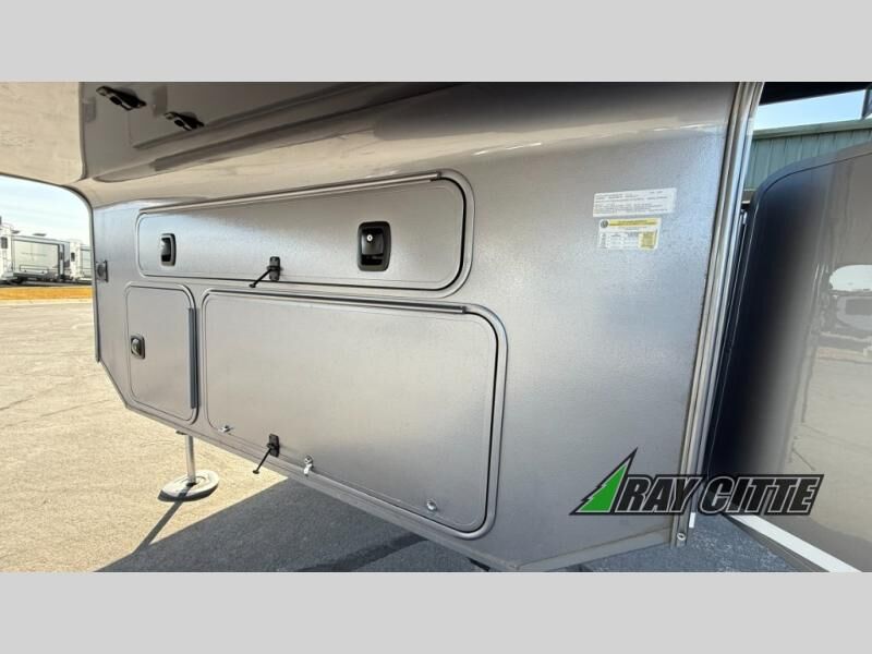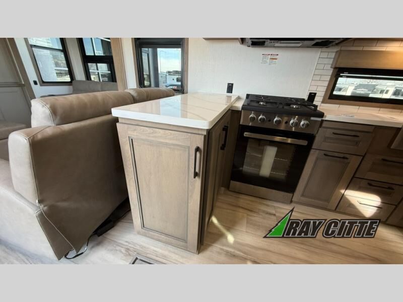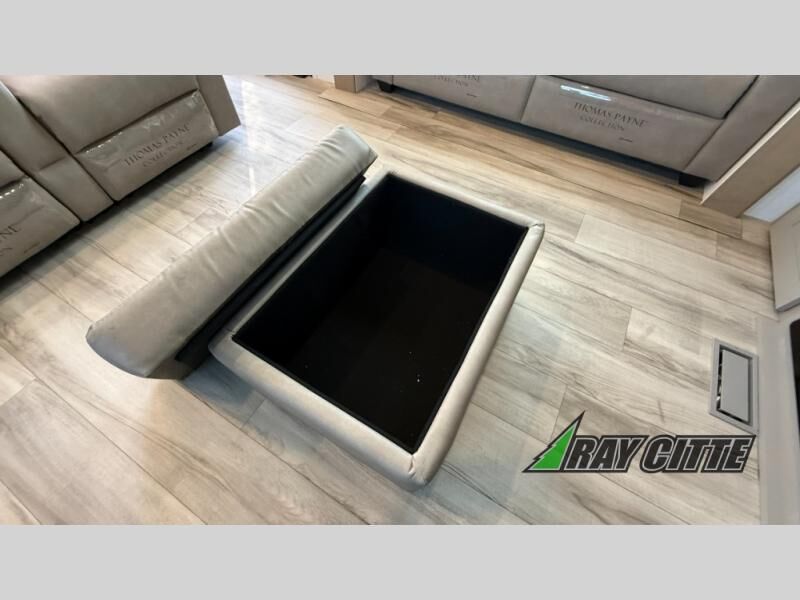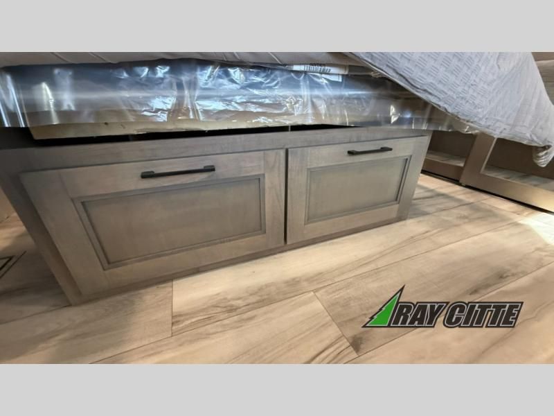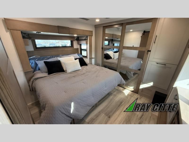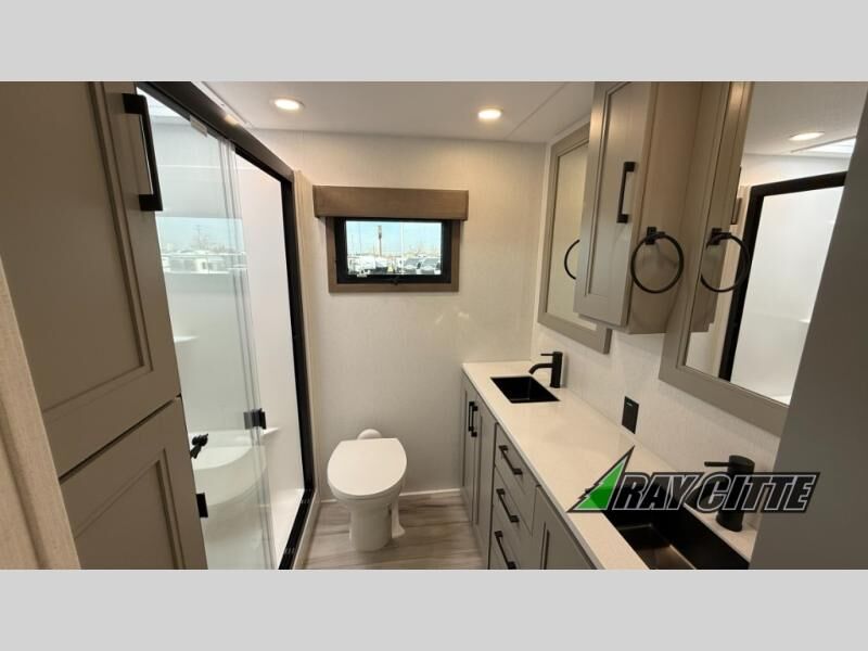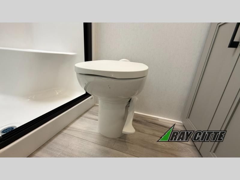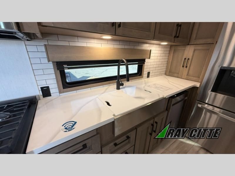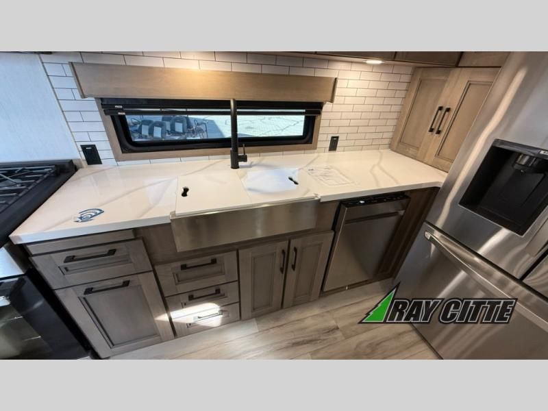 Experience the pinnacle of luxury fifth-wheel living! Retreat to the serene bedroom, featuring an electric tilt king bed with drawers under the bed, a spacious wardrobe, and washer/dryer prep. Enjoy entertainment on the 39” Smart LED TV and ample storage in the dresser. The gourmet kitchen is equipped with a pantry, 26 cu. refrigerator, convection microwave, and sliding table/desk for effortless dining and work-from-home convenience. The living room is a haven of relaxation, boasting a stunning 65” Smart LED TV, warm fireplace, theater seating, and double hide-a-bed sofas ideal for hosting guests with ease. Unwind in style in the full bathroom, featuring a dual sink vanity and ample storage. Also, enjoy the convenience of two entry/two exit doors. This fifth wheel is a masterpiece of comfort, style, and functionality, perfect for full-time living.