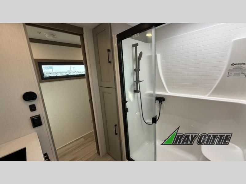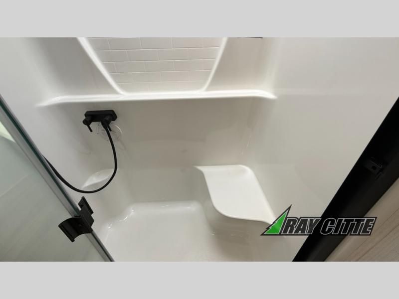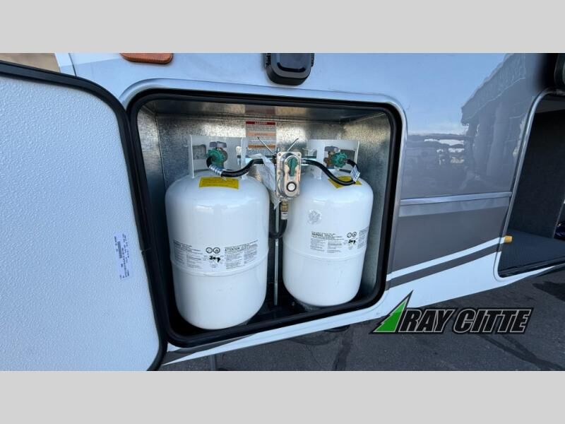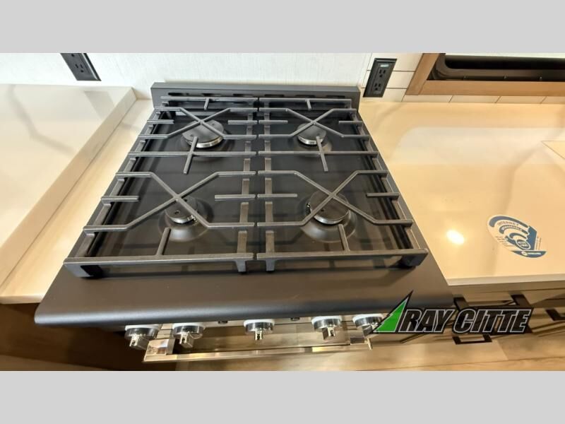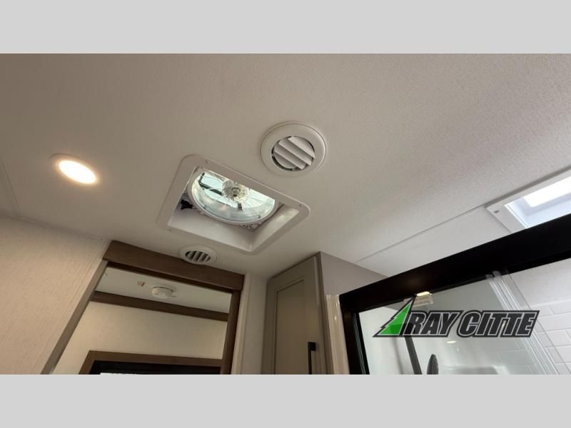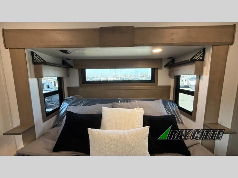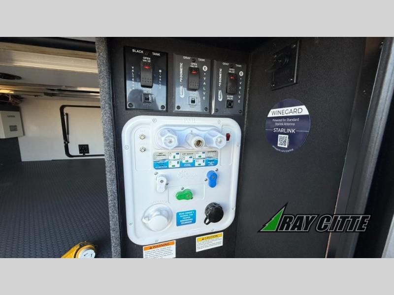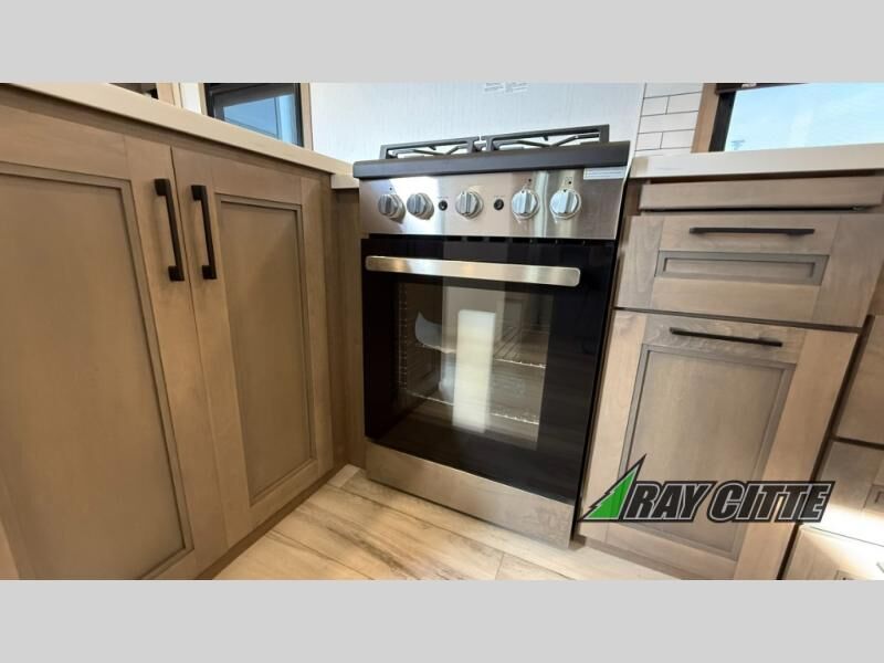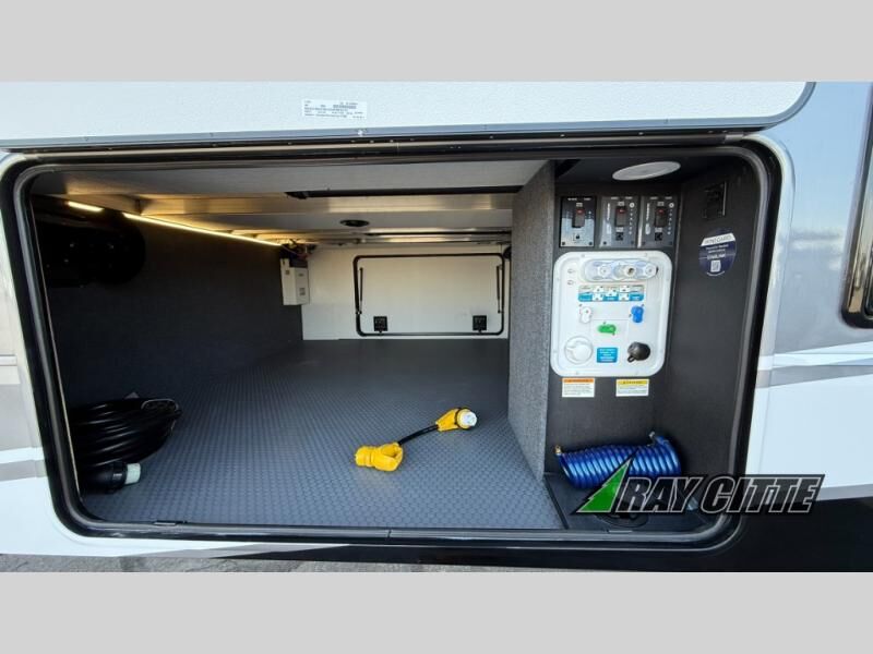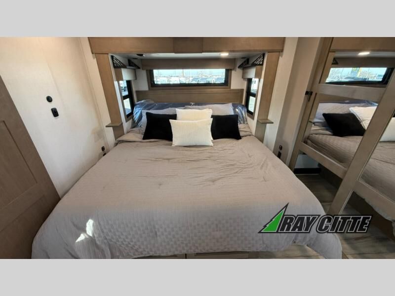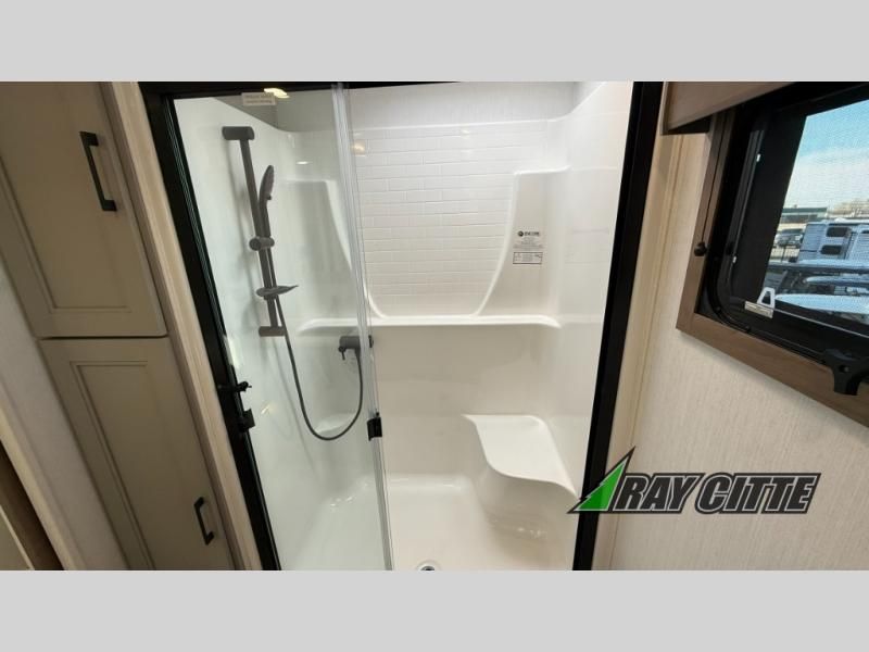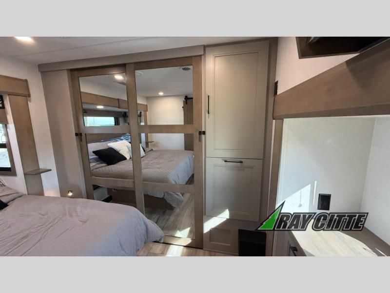 Experience the pinnacle of luxury fifth-wheel living! Retreat to the serene bedroom, featuring an electric tilt king bed with drawers under the bed, a spacious wardrobe, and washer/dryer prep. Enjoy entertainment on the 39” Smart LED TV and ample storage in the dresser. The gourmet kitchen is equipped with a pantry, 26 cu. refrigerator, convection microwave, and sliding table/desk for effortless dining and work-from-home convenience. The living room is a haven of relaxation, boasting a stunning 65” Smart LED TV, warm fireplace, theater seating, and double hide-a-bed sofas ideal for hosting guests with ease. Unwind in style in the full bathroom, featuring a dual sink vanity and ample storage. Also, enjoy the convenience of two entry/two exit doors. This fifth wheel is a masterpiece of comfort, style, and functionality, perfect for full-time living.