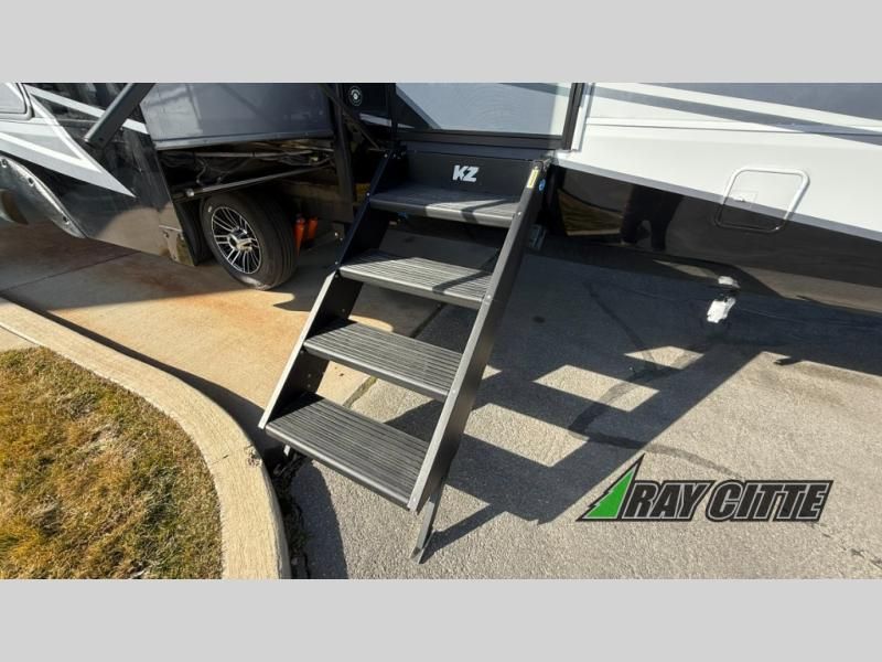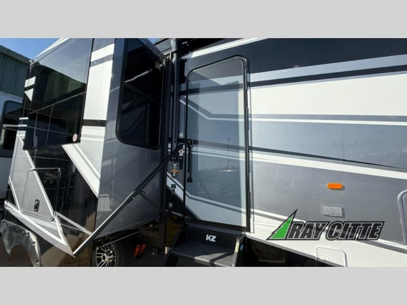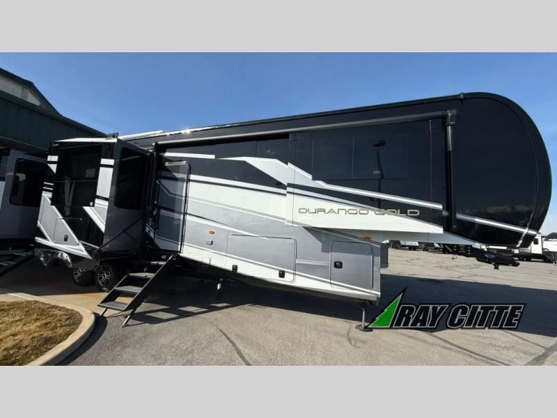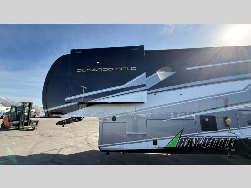 With any KZ Durango Gold full-time luxury fifth wheel, you will enjoy the new Blancher Maple and Morel Fog cabinetry, stainless steel appliances such as a 30" convection microwave and 24" oven with a four burner range, plus a stainless dishwasher. Other top features include an electric tilt bed with Serta Comfort foam king mattress, three 15K A/C units, plus theater seating with powered recline, heat and massage features. You will also appreciate a handy central vacuum system with attachments that stores out of sight. Each Durango Gold is constructed with six-sided aluminum framing, and has a heated, insulated and an enclosed underbelly. It is also constructed with Tufflex roofing material which is flexible, puncture resistant, and reflective. The now mandatory "Off The Grid" solar package includes two 200W solar panels, a 30A MPPT solar charge controller, and a 2,000W True Sine Wave inverter for off-grid capabilities.