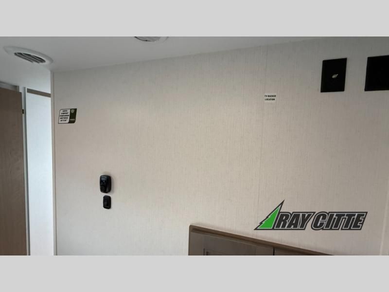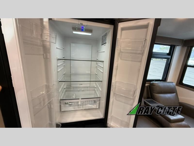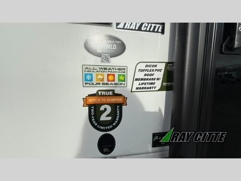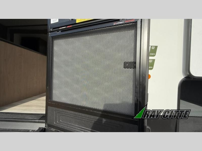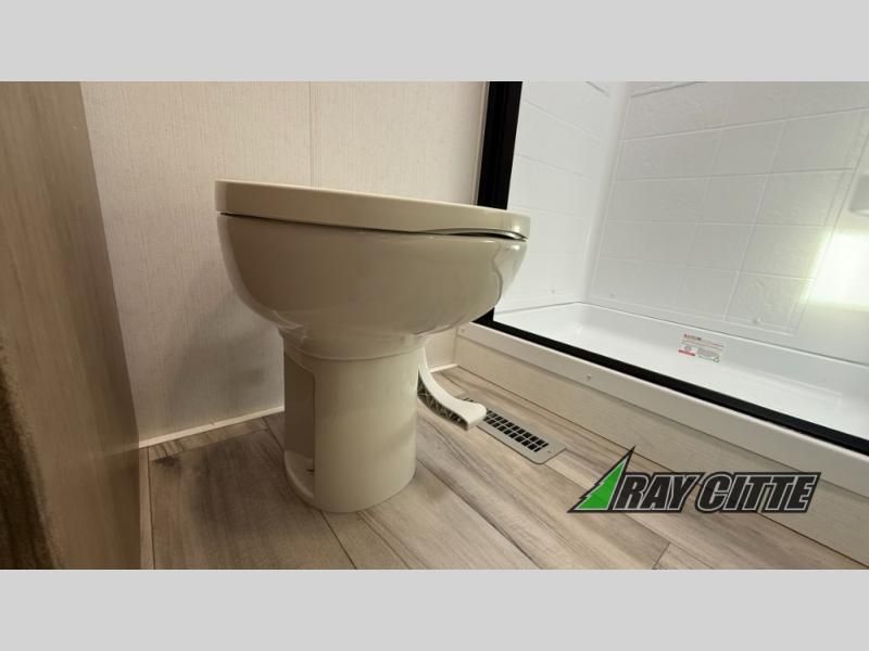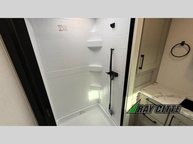 This fifth wheel has everything you need and more. Retreat to the serene bedroom, featuring a queen bed, spacious wardrobe, and washer/dryer prep for effortless laundry days. The kitchen is equipped with a pantry, 12-cu. refrigerator, and microwave for quick and easy meal prep. Enjoy meals with family and friends at the dinette, which features an EZ-adjustable table for customizable comfort. The living room boasts an entertainment center, hutch, and coat closet for ample storage. Relax in style in the full bathroom, featuring a spacious 36” x 30” shower. Finally, enjoy the convenience of pass-thru storage and stay in touch with nature under the shade of the 16“awning.