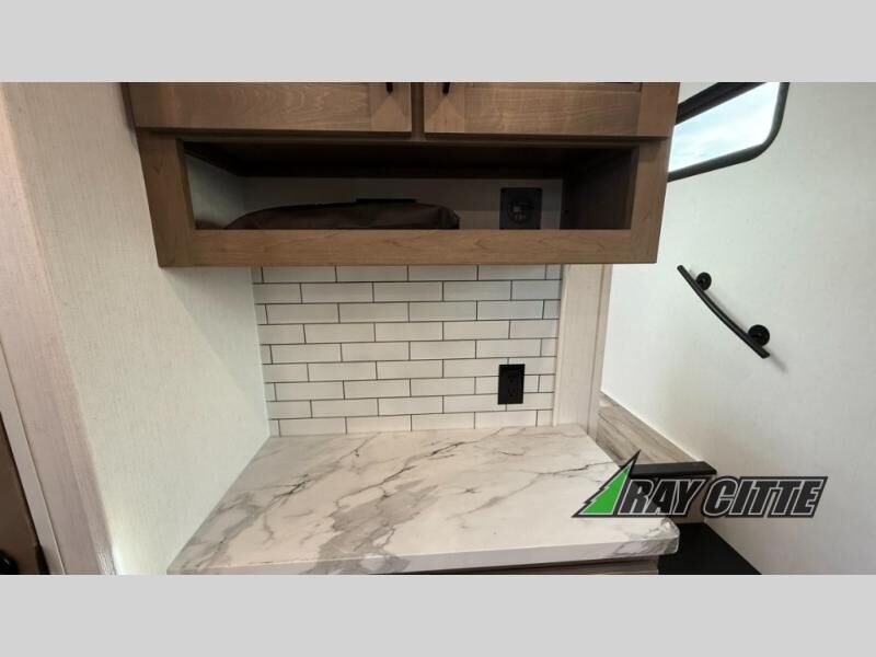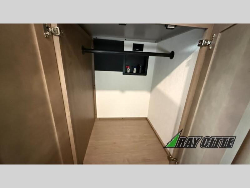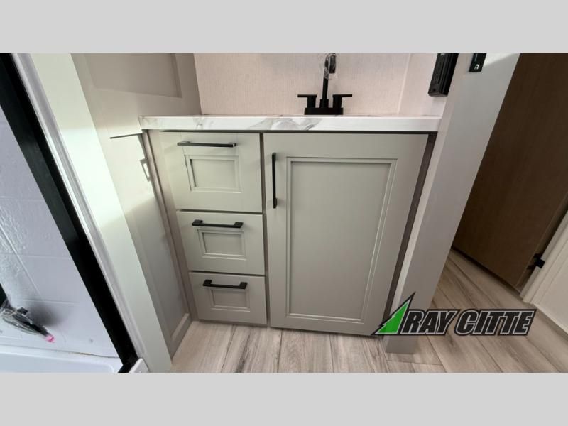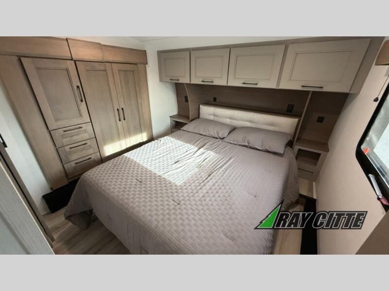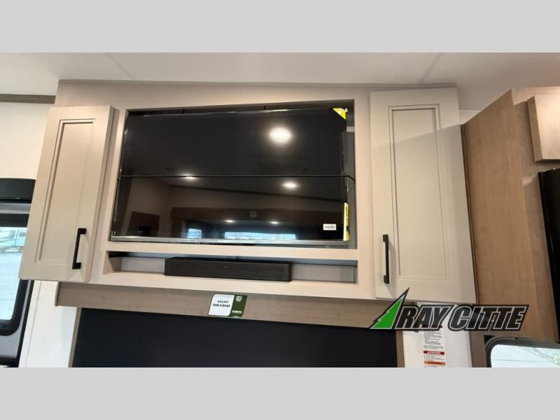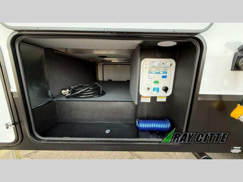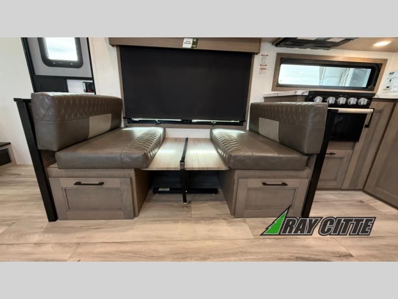 This fifth wheel has everything you need and more. Retreat to the serene bedroom, featuring a queen bed, spacious wardrobe, and washer/dryer prep for effortless laundry days. The kitchen is equipped with a pantry, 12-cu. refrigerator, and microwave for quick and easy meal prep. Enjoy meals with family and friends at the dinette, which features an EZ-adjustable table for customizable comfort. The living room boasts an entertainment center, hutch, and coat closet for ample storage. Relax in style in the full bathroom, featuring a spacious 36” x 30” shower. Finally, enjoy the convenience of pass-thru storage and stay in touch with nature under the shade of the 16“awning.