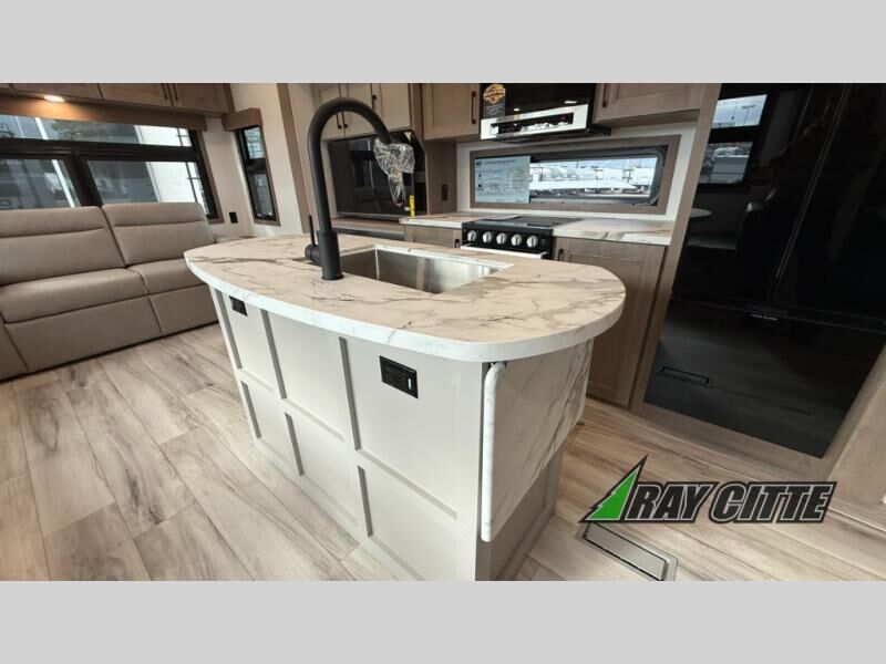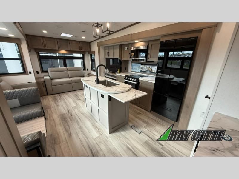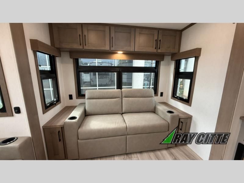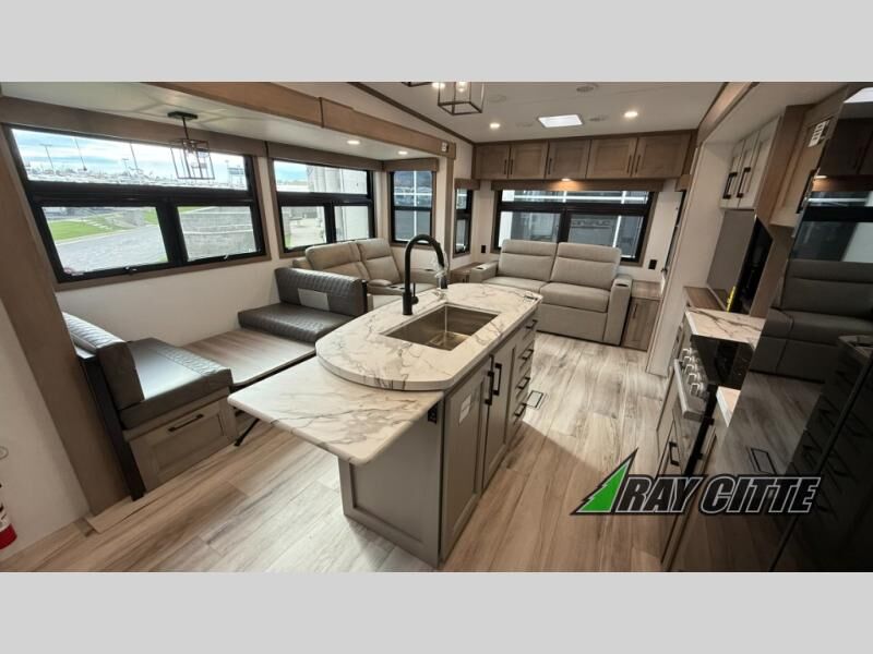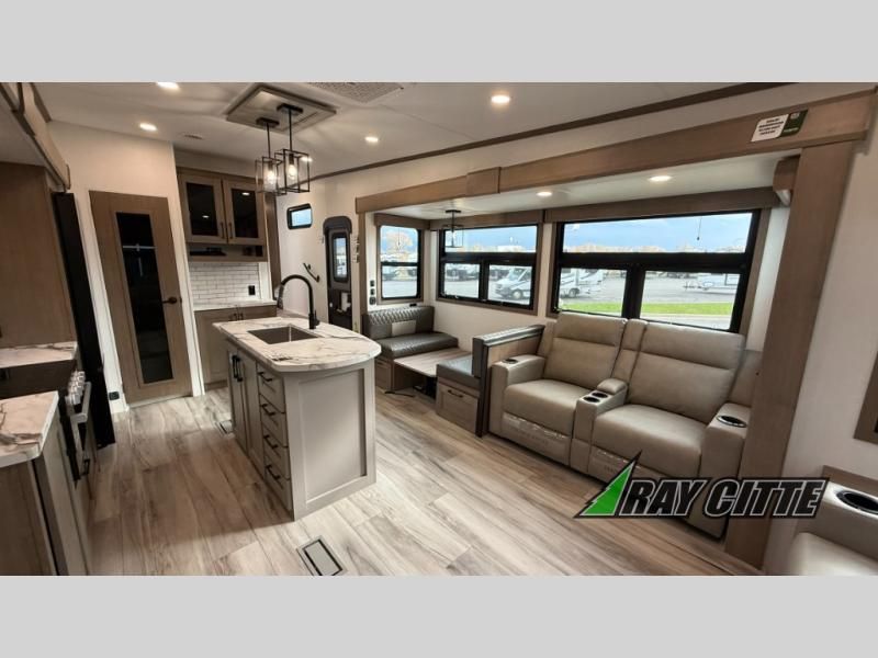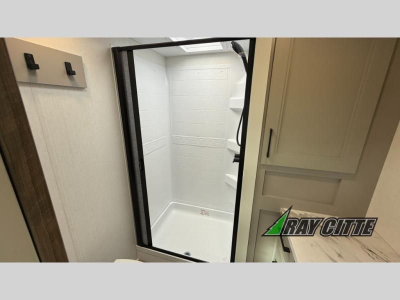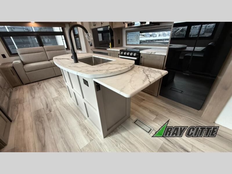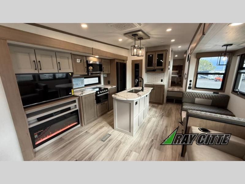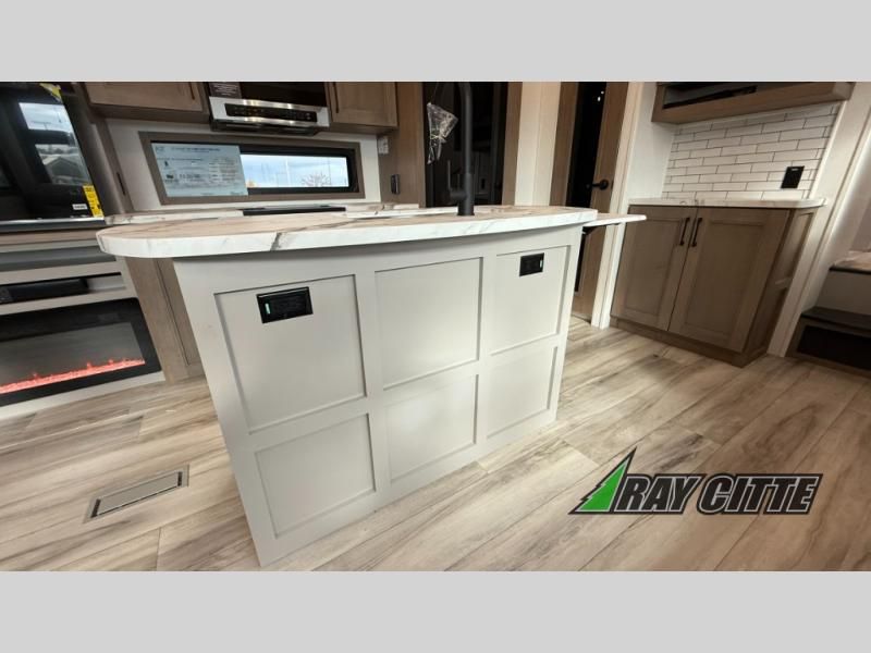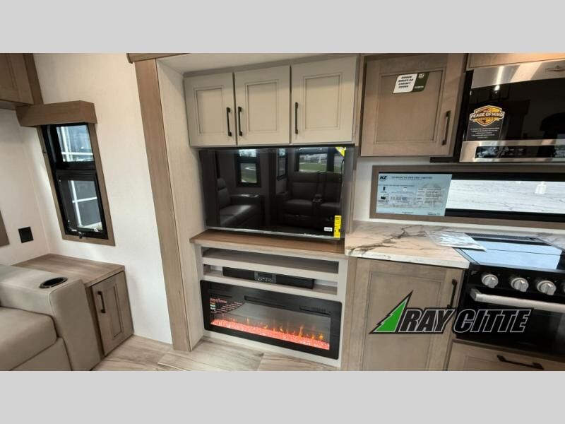 This fifth wheel will feel just like home with its kitchen island, theater seating, and front private bedroom! If you have any overnight guests, they can sleep on the rear hide-a-bed sofa. There is also a dinette with EZ adjust table for dining space, an entertainment center with a 43" Smart LED TV and an optional 40" fireplace. You will love the extra features that have been added, like the hutch in the kitchen for extra counter and storage space, the shower skylight in the spacious full bath, and the slide out wardrobe in the front bedroom!