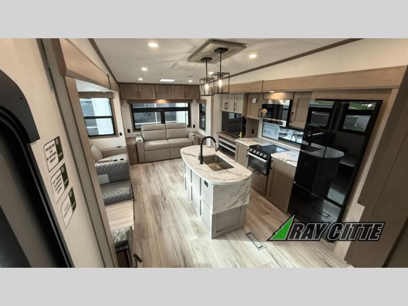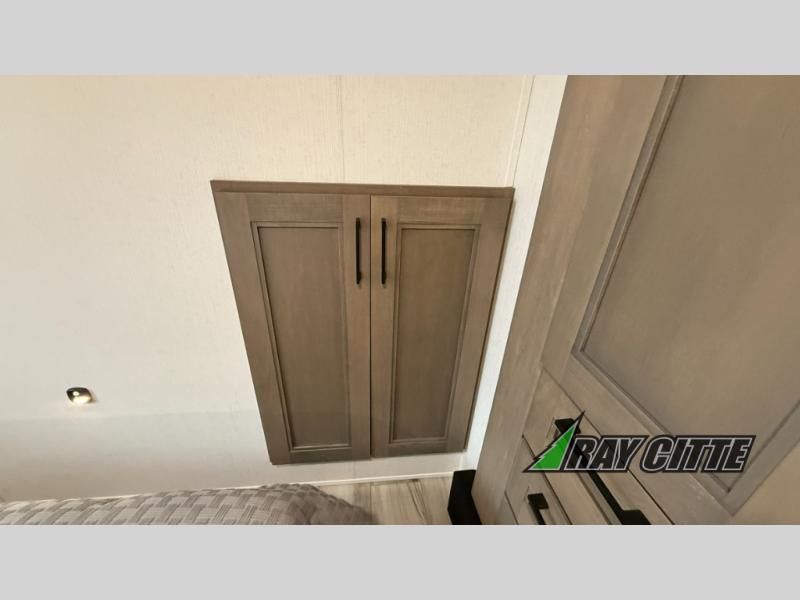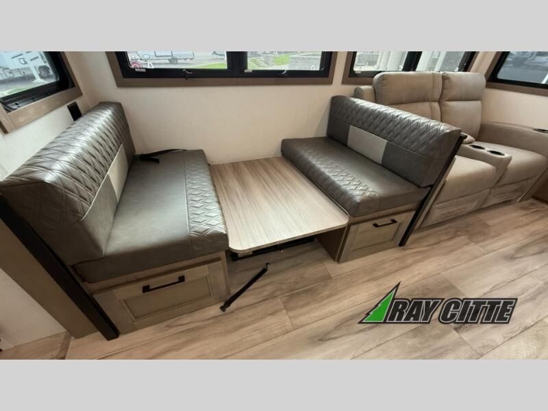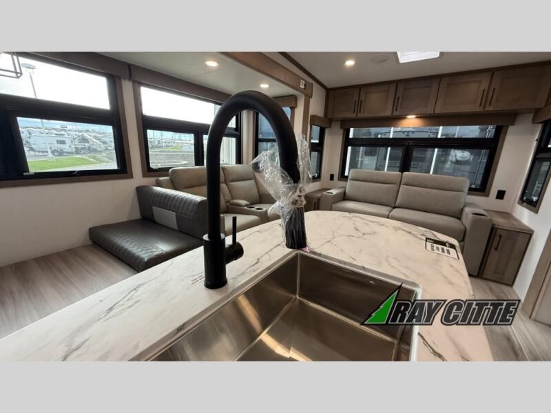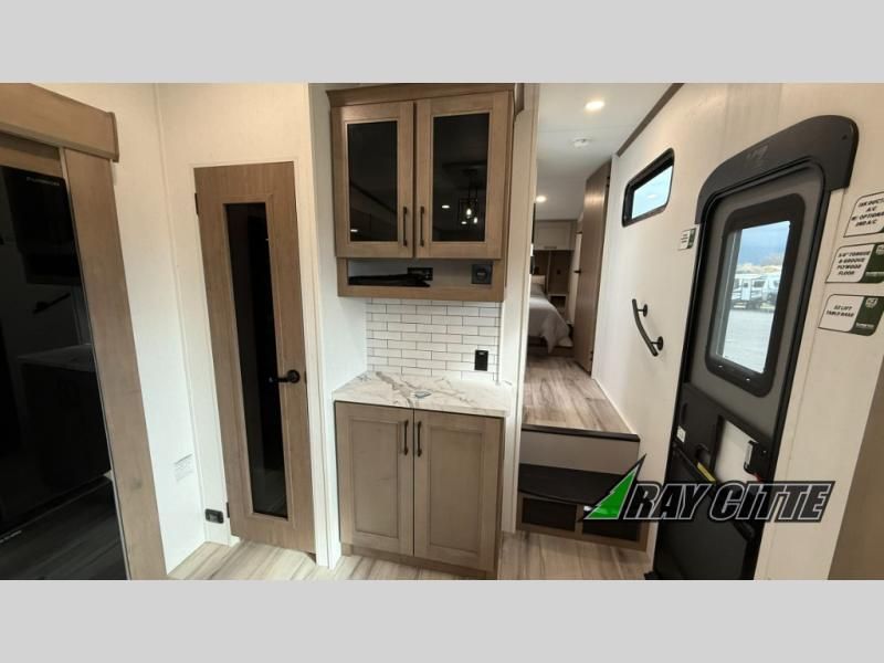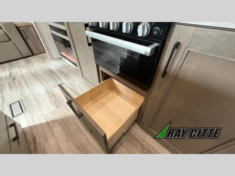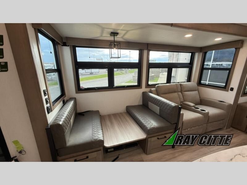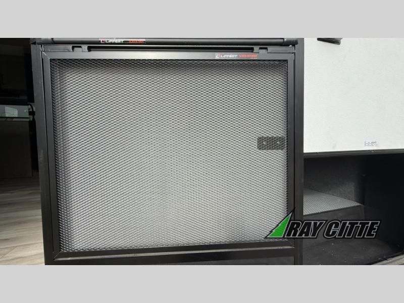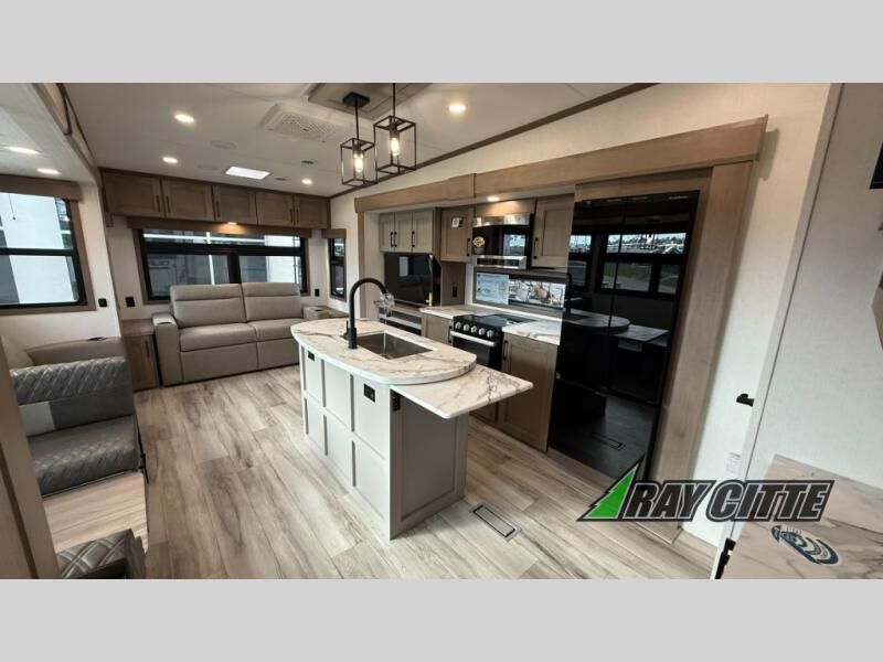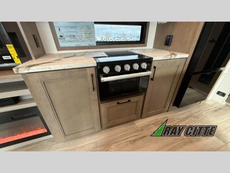 This fifth wheel will feel just like home with its kitchen island, theater seating, and front private bedroom! If you have any overnight guests, they can sleep on the rear hide-a-bed sofa. There is also a dinette with EZ adjust table for dining space, an entertainment center with a 43" Smart LED TV and an optional 40" fireplace. You will love the extra features that have been added, like the hutch in the kitchen for extra counter and storage space, the shower skylight in the spacious full bath, and the slide out wardrobe in the front bedroom!
