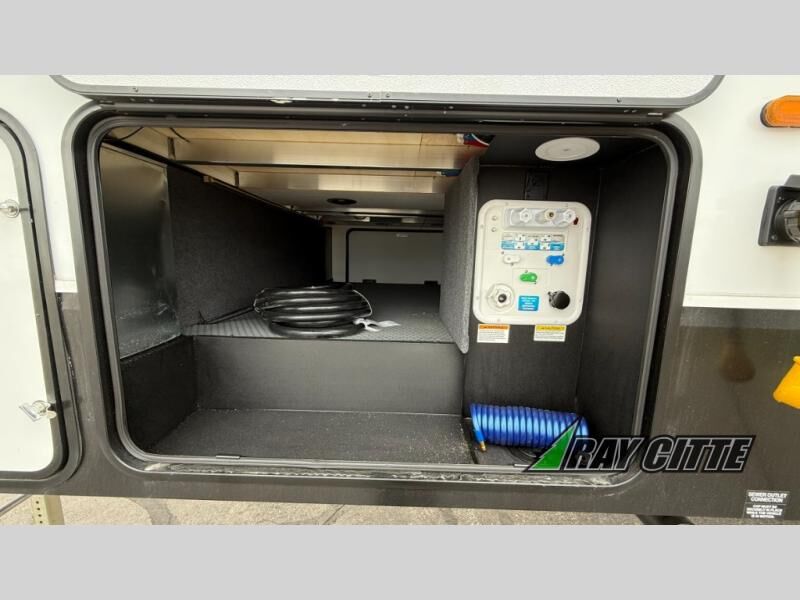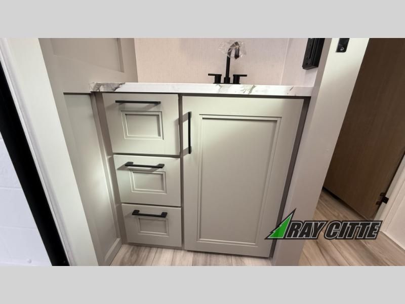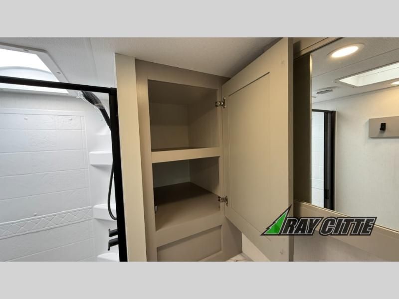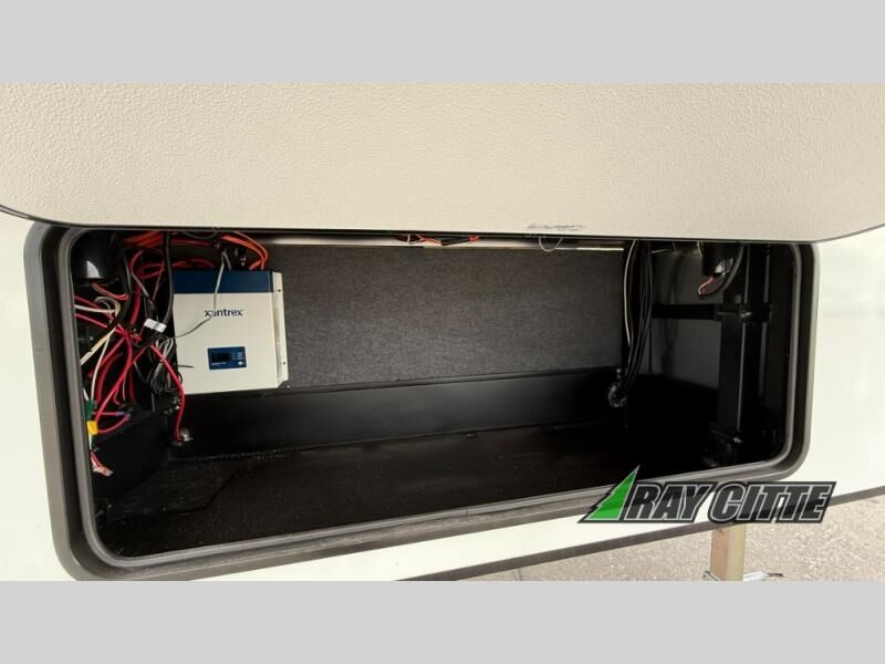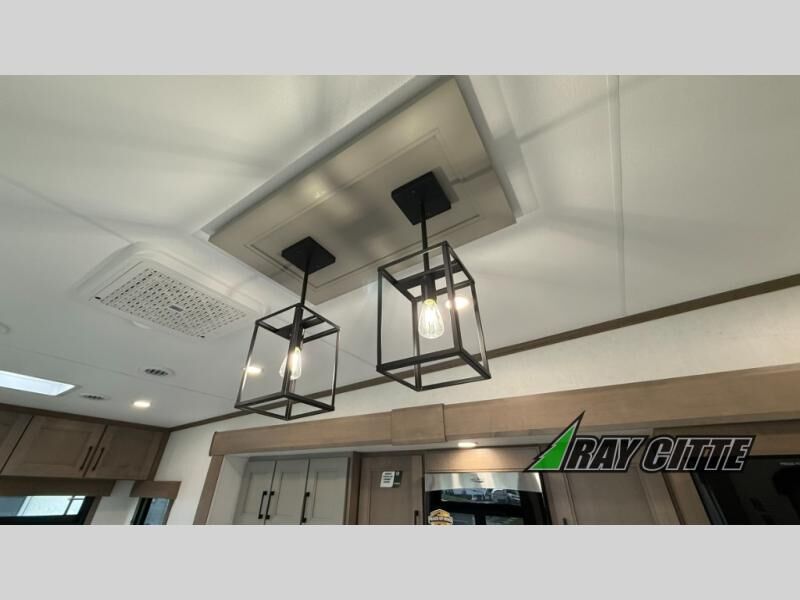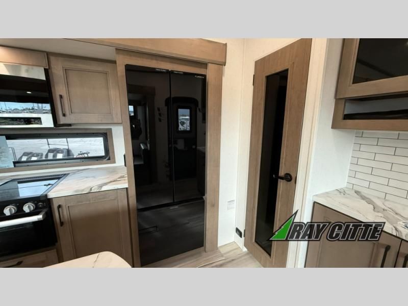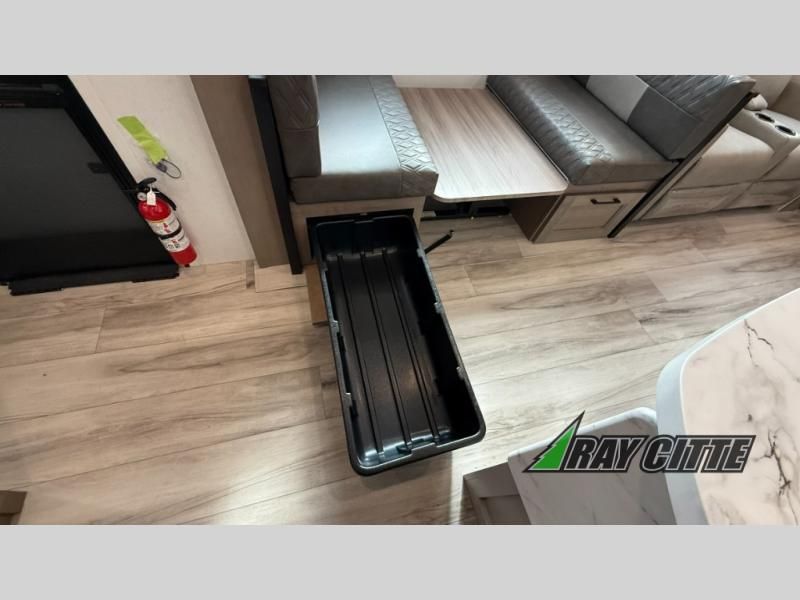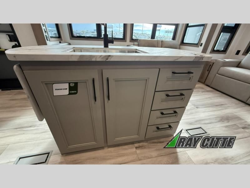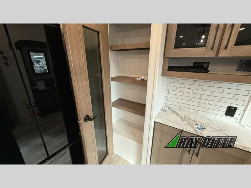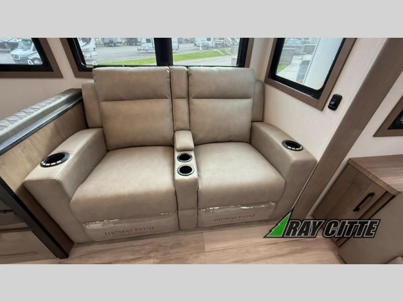 This fifth wheel will feel just like home with its kitchen island, theater seating, and front private bedroom! If you have any overnight guests, they can sleep on the rear hide-a-bed sofa. There is also a dinette with EZ adjust table for dining space, an entertainment center with a 43" Smart LED TV and an optional 40" fireplace. You will love the extra features that have been added, like the hutch in the kitchen for extra counter and storage space, the shower skylight in the spacious full bath, and the slide out wardrobe in the front bedroom!