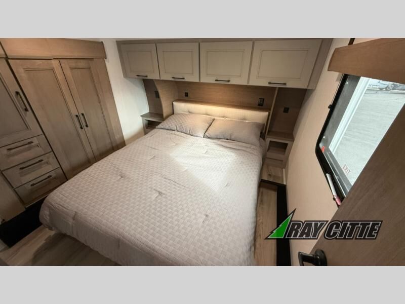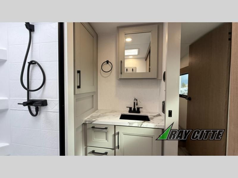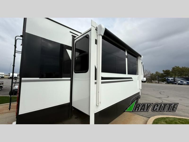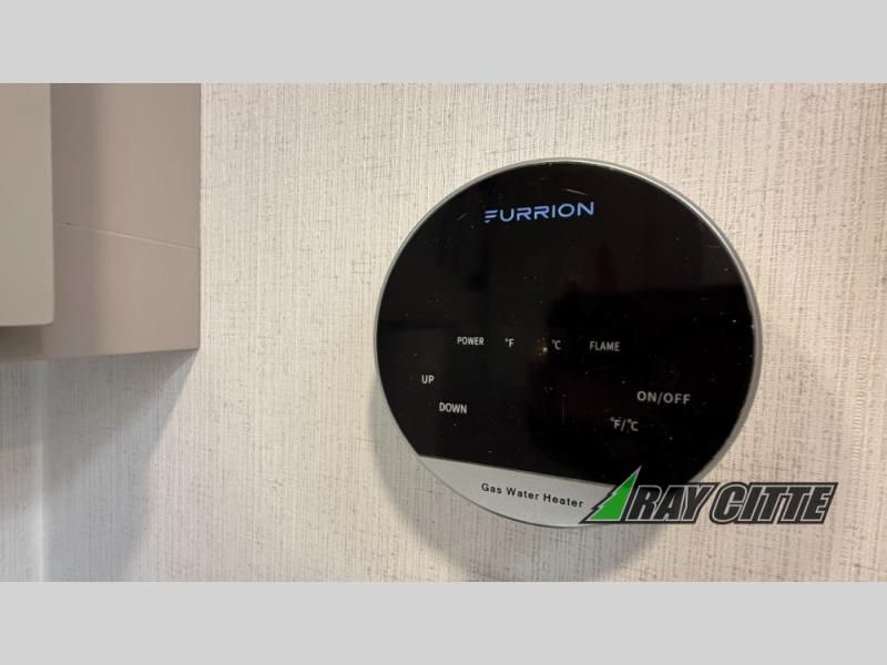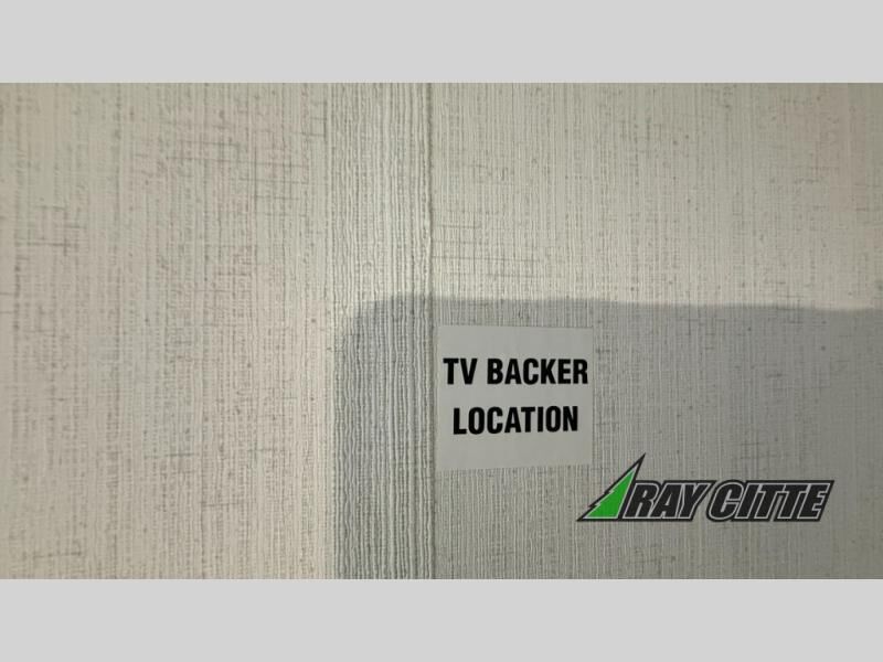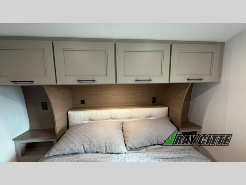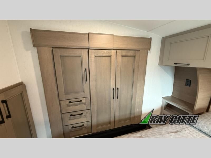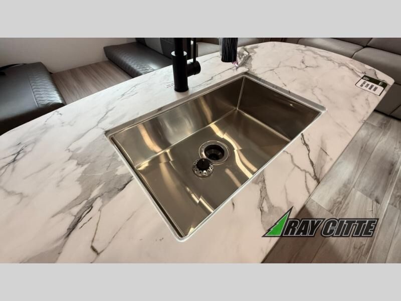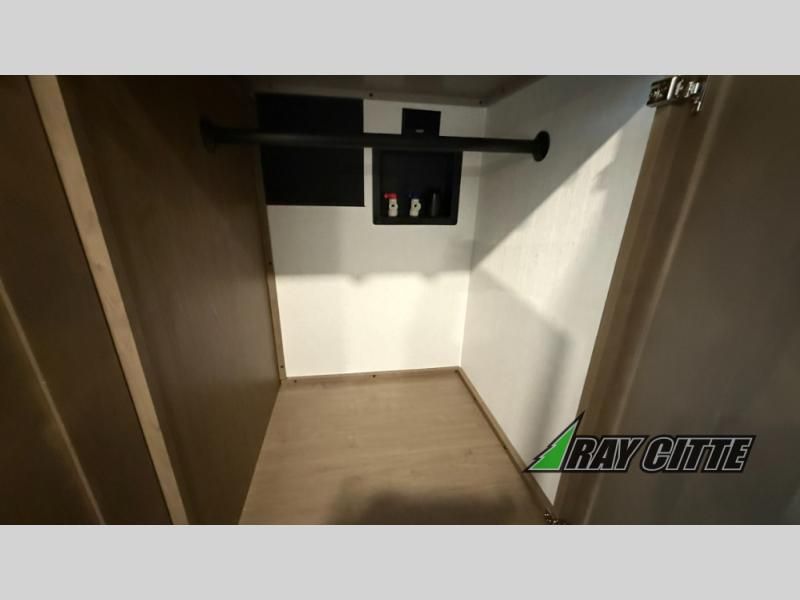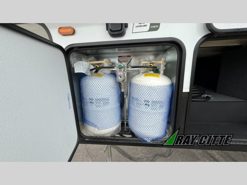 This fifth wheel will feel just like home with its kitchen island, theater seating, and front private bedroom! If you have any overnight guests, they can sleep on the rear hide-a-bed sofa. There is also a dinette with EZ adjust table for dining space, an entertainment center with a 43" Smart LED TV and an optional 40" fireplace. You will love the extra features that have been added, like the hutch in the kitchen for extra counter and storage space, the shower skylight in the spacious full bath, and the slide out wardrobe in the front bedroom!